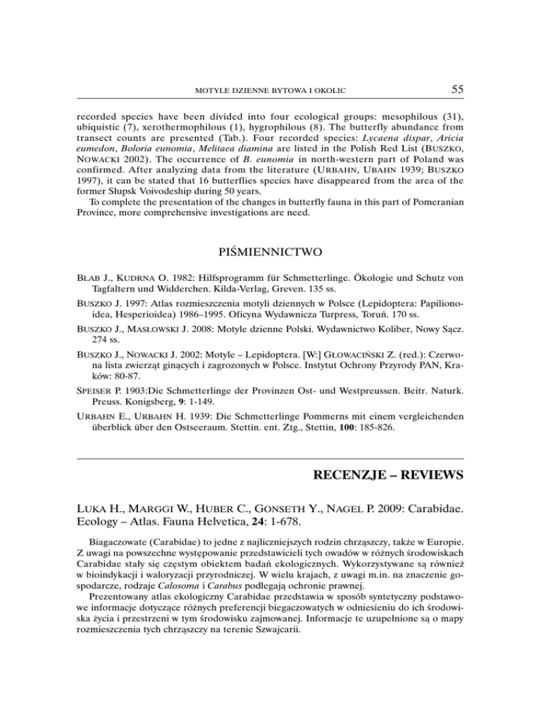 MOTYLE DZIENNE BYTOWA I OKOLIC 55 recorded species have been divided into four ecological groups: mesophilous (31), ubiquistic (7), xerothermophilous (1), hygrophilous (8). The butterfly abundance from transect counts are presented (Tab.). Four recorded species: Lycaena dispar, Aricia eumedon, Boloria eunomia, Melitaea diamina are listed in the Polish Red List (B USZKO, N OWACKI 2002). The occurrence of B. eunomia in north-western part of Poland was confirmed. After analyzing data from the literature (U RBAHN, UBAHN 1939; B USZKO 1997), it can be stated that 16 butterflies species have disappeared from the area of the former Słupsk Voivodeship during 50 years. To complete the presentation of the changes in butterfly fauna in this part of Pomeranian Province, more comprehensive investigations are need. PIŚMIENNICTWO BLAB J., KUDRNA O. 1982: Hilfsprogramm für Schmetterlinge. Ökologie und Schutz von Tagfaltern und Widderchen. Kilda-Verlag, Greven. 135 ss. BUSZKO J. 1997: Atlas rozmieszczenia motyli dziennych w Polsce (Lepidoptera: Papilionoidea, Hesperioidea) 1986–1995. Oficyna Wydawnicza Turpress, Toruń. 170 ss. BUSZKO J., MASŁOWSKI J. 2008: Motyle dzienne Polski. Wydawnictwo Koliber, Nowy Sącz. 274 ss. BUSZKO J., NOWACKI J. 2002: Motyle – Lepidoptera. [W:] GŁOWACIŃSKI Z. (red.): Czerwona lista zwierząt ginących i zagrozonych w Polsce. Instytut Ochrony Przyrody PAN, Kraków: 80-87. SPEISER P. 1903:Die Schmetterlinge der Provinzen Ost- und Westpreussen. Beitr. Naturk. Preuss. Konigsberg, 9: 1-149. URBAHN E., URBAHN H. 1939: Die Schmetterlinge Pommerns mit einem vergleichenden überblick über den Ostseeraum. Stettin. ent. Ztg., Stettin, 100: 185-826. RECENZJE – REVIEWS LUKA H., MARGGI W., HUBER C., GONSETH Y., NAGEL P. 2009: Carabidae. Ecology – Atlas. Fauna Helvetica, 24: 1-678. Biagaczowate (Carabidae) to jedne z najliczniejszych rodzin chrząszczy, także w Europie. Z uwagi na powszechne występowanie przedstawicieli tych owadów w różnych środowiskach Carabidae stały się częstym obiektem badań ekologicznych. Wykorzystywane są również w bioindykacji i waloryzacji przyrodniczej. W wielu krajach, z uwagi m.in. na znaczenie gospodarcze, rodzaje Calosoma i Carabus podlegają ochronie prawnej. Prezentowany atlas ekologiczny Carabidae przedstawia w sposób syntetyczny podstawowe informacje dotyczące różnych preferencji biegaczowatych w odniesieniu do ich środowiska życia i przestrzeni w tym środowisku zajmowanej. Informacje te uzupełnione są o mapy rozmieszczenia tych chrząszczy na terenie Szwajcarii. 56 RECENZJE Atlas składa się z siedmiu rozdziałów poprzedzonych streszczeniem w języku niemieckim, francuskim i angielskim. Całość opracowania napisana została w języku niemieckim co nie utrudnia obcokrajowcom korzystania z atlasu ponieważ informacje o ekologii Carabidae zostały przedstawione w sposób komunikatywny. We wprowadzeniu (rozdział 1) autorzy w kilku zdaniach podkreślają wspomnianą wcześniej rolę biegaczowatych jako bioindykatorów. Podkreślają również niewątpliwe znaczenie informacji z zakresu ekologii Carabidae w ich ochronie, a status zagrożenia gatunków występujących w Szwajcarii został każdorazowo określony przy ich opisie. Dowiadujemy się również, że przedstawione charakterystyki gatunków odnoszą się do imagines. W rozdziale 2 – Materiał i metody – przedstawiono sposoby pozyskania informacji, materiał wyjściowy do opracowania, przyjęty układ taksonomiczny, sposób przedstawienia wyników, opis uwzględnionych parametrów ekologicznych oraz sposoby opracowania statystycznego. Dla każdego gatunku podano 10 cech go charakteryzujących: preferencje siedliskowe – typ środowiska, walencję ekologiczną, środowisko występowania, preferencje wilgotnościowe, miejsce rozwoju (epigeiczne, glebowe, itd.), położenie nad poziomem morza, rozprzestrzenienie na terenie Szwajcarii, szczyt liczebności, częstość występowania, stopień zagrożenia i potrzeb ochrony; W rozdziale 3 poświęcono uwagę gatunkom, których występowanie w Szwajcarii nie zostało potwierdzone lub zostały umieszczone na liście w skutek fałszywych informacji. Podano tu również dane faunistyczne dotyczące 4 gatunków nowych dla fauny Szwajcarii, które po raz pierwszy zostały wymienione w atlasie. W kolejnym, 4 rozdziale – Wyniki – dokonano podsumowań statystycznych dotyczących wymienionych wcześniej parametrów ekologicznych oraz przedstawiono zasadniczą część opracowania w postaci swoistej listy gatunków z podanymi parametrami ekologicznymi, diagramami prezentującymi zakres zmienności wybranych preferencji (na ile zgromadzone dane pozwalały) oraz mapy rozmieszczenia Carabidae w Szwajcarii. Dane faunistyczne ujęto w trzech okresach (do 1979 roku, między 1979–1989 oraz po 1989 roku), co pozwala na zorientowanie się odnośnie tendencji gatunków do zmian granic zasięgów i częstości występowania. Lista została przedstawiona w przyjętym układzie systematycznym (LÖBL, SMETANA 2003), a nazwy niektórych gatunków uzupełniono o wybrane nowsze synonimy. Ogółem w książce możemy znaleźć informacje o 550 gatunkach i podgatunkach Carabidae Szwajcarii. Piąty rozdział stanowi wykaz cytowanej literatury i obejmuje 29 pozycji. Wśród nich znajdują się prace Autorów, które stanowią syntezy faunistyczne dotyczące Carabidae Szwajcarii. Rozdział 6 to załącznik pokazujący ile osobników biegaczowatych z poszczególnych gatunków odłowiono „na upatrzonego” a ile z użyciem pułapek ziemnych. Pozwala to czytelnikom na zorientowanie się czy materiał służący do określenia preferencji ekologicznych był reprezentatywny, a tym samym, które gatunki będą wymagały dalszych badań. W ostatnim, 7 rozdziale znajduje się kompletny indeks taksonów użytych w opracowaniu. Prezentowany atlas ekologiczny Carabidae stanowi cenne podsumowanie informacji faunistyczno-ekologicznej tej ważnej grup