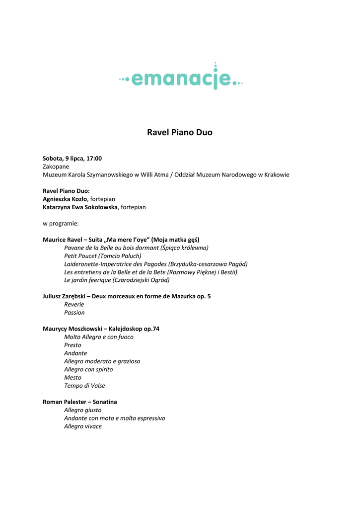 Ravel Piano Duo Sobota, 9 lipca, 17:00 Zakopane Muzeum Karola Szymanowskiego w Willi Atma / Oddział Muzeum Narodowego w Krakowie Ravel Piano Duo: Agnieszka Kozło, fortepian Katarzyna Ewa Sokołowska, fortepian w programie: Maurice Ravel – Suita „Ma mere l’oye” (Moja matka gęś) Pavane de la Belle au bois dormant (Śpiąca królewna) Petit Poucet (Tomcio Paluch) Laideronette-Imperatrice des Pagodes (Brzydulka-cesarzowa Pagód) Les entretiens de la Belle et de la Bete (Rozmowy Pięknej i Bestii) Le jardin feerique (Czarodziejski Ogród) Juliusz Zarębski – Deux morceaux en forme de Mazurka op. 5 Reverie Passion Maurycy Moszkowski – Kalejdoskop op.74 Molto Allegro e con fuoco Presto Andante Allegro moderato e grazioso Allegro con spirito Mesto Tempo di Valse Roman Palester – Sonatina Allegro giusto Andante con moto e molto espressivo Allegro vivace Ravel Piano Duo Jeden z czołowych polskich duetów fortepianowych. Kształcił się pod kierunkiem prof. Mai Nosowskiej w Akademii Muzycznej im. Fryderyka Chopina w Warszawie oraz w klasie mistrzowskiej duetu Hansa-Petera Stenzl i Volkera Stenzl w Hochschule für Musik und Theater Rostock, gdzie w 2005 r. uzyskał dyplom studiów koncertowych (Konzertexam) z najwyższym odznaczeniem. Na artystyczny rozwój zespołu miały wpływ ponadto spotkania z tak wybitnymi artystami jak: Jan Ekier, Alexander Tamir, Bracha Eden, Berndt Goetzke, Leonard Hokanson, Tomasz Herbut, Kwartet Camerata. Duet jest laureatem wielu konkursów muzycznych m.in: Międzynarodowego Konkursu Pianistycznego w Marcopoulo/Grecja (III nagroda – I i II nie przyznano), XI Międzynarodowego Konkursu Duetów Fortepianowych im. F. Schuberta w Jeseniku/Czechy (I nagroda oraz nagroda specjalna za wykonanie utworu Franciszka Schuberta), Międzynarodowego Konkursu Muzyki XX i XXI wieku im. Valentino Bucchi w Rzymie (II nagroda). Artystki prowadzą ożywioną działalność koncertową występując w Polsce i niemal całej Europie. Obszerny repertuar zespołu obejmuje kompozycje na cztery ręce i dwa fortepiany od epoki baroku do czasów obecnych. Duet ma na swoim koncie wiele prawykonań oraz kilka wydawnictw płytowych. Szczególne zainteresowanie muzyką francuską zaowocowało wydaniem płyty z utworami Fauré, Debussy’ego, Ravela i Poulenca. Kolejna płyta z udziałem duetu, zawierająca utwory Brahmsa na chór kameralny i duet fortepianowy otrzymała w 2005 r. prestiżowe wyróżnienie Polskiej Akademii Fonograficznej Fryderyk. W 2012r. ukazała się płyta z nagraniem II Symfonii Pawła Łukaszewskiego. Najnowszą płytę duetu Polski kalejdoskop z muzyką polską na 4 ręce uhonorowano nagrodą Fryderyk 2016. Duet był wielokrotnie stypendystą Ministra Kultury i Dziedzictwa Narodowego oraz Fundacji Zonta International. Agnieszka Kozło i Katarzyna Ewa Sokołowska zajmują się ponadto pracą pedagogiczną wykładając na Uniwersytecie Muzycznym Fryderyka Chopina w Warszawie, w Zespole Państwowych Szkół Muzycznych im. F. Chopina w Warszawie oraz na licznych kursach muzycznych. Rezerwacja bezpłatnych kart wstępu: www.emanacje.pl www.emanacje.pl www.penderecki-center.pl
