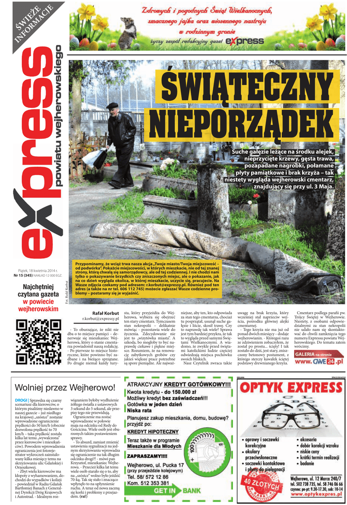 E JE Ż E C I MA W Ś R IN FO ŚWIĄTECZNY NIEPORZĄDEK Suche gałęzie leżące na środku alejek, nieprzycięte krzewy, gęsta trawa, pozapadane nagrobki, połamane płyty pamiątkowe i brak krzyża – tak niestety wygląda wejherowski cmentarz, znajdujący się przy ul. 3 Maja. Najchętniej czytana gazeta w powiecie wejherowskim Fot. Rafał Korbut Piątek, 18 kwietnia 2014 r. Nr 15 (345) NAKŁAD 12 000 EGZ. Przypominamy, że wciąż trwa nasza akcja „Twoje miasto/Twoja miejscowość – od podwórka”. Pokażcie miejscowości, w których mieszkacie, nie od tej znanej strony, którą chwalą się samorządowcy, ale od tej codziennej. I nie chodzi nam tylko o pokazywanie brzydkich czy zniszczonych miejsc, ale o pokazanie, jak na co dzień wygląda okolica, w której mieszkacie, uczycie się, pracujecie. Na Wasze zdjęcia czekamy pod adresem: [email protected]. Również pod ten adres (a także na nr tel. 606 112 745) możecie zgłaszać Wasze codzienne problemy – postaramy się je wyjaśnić. Rafał Korbut [email protected] - To oburzające, że nikt nie dba o to miejsce pamięci – denerwuje się mieszkaniec Wejherowa, który o stanie cmentarza powiadomił naszą redakcję. - Po pierwsze to miejsce historyczne, które powinno być zadbane i na bieżąco sprzątane. Po drugie niemal każdy tury- Wolniej przez Wejherowo! DROGI | Sprawdza się czarny scenariusz dla kierowców, o którym pisaliśmy niedawno w naszej gazecie – już niedługo na krajowej „szóstce” zostanie wprowadzone ograniczenie prędkości do 50 km/h (obecnie dozwolona prędkość to 70 km/h – taka prędkość została kilka lat temu „wywalczona” przez kierowców i mieszkańców). Powodem wprowadzenia ograniczenia jest fotorejestrator wykroczeń zainstalowany kilka miesięcy temu na skrzyżowaniu ulic Gdańskiej i Orzeszkowej. - Zbyt wielu kierowców ma kłopoty z wyhamowaniem, dochodzi do wypadków i kolizji - powiedział w Radiu Gdańsk Bartłomiej Banach z Generalnej Dyrekcji Dróg Krajowych i Autostrad. - Idealnym roz- wiązaniem byłoby wydłużenie żółtego światła z ustawowych 3 sekund do 5 sekund, ale przepisy tego nie przewidują. Ograniczenie ma zostać wprowadzone w połowie maja na odcinku od Redy do Gościcina. Wiele osób jest oburzonych takim postawieniem sprawy. - To absurd, zamiast zmienić ustawienia sygnalizacji na jednym skrzyżowaniu wprowadza się ograniczenie na tak długim odcinku drogi?! - mówi pan Krzysztof, mieszkaniec Wejherowa. - Przecież kilka lat temu wiele osób starało się o to, aby na „szóstce” wolno było jeździć 70-ką. Tak się stało i znacząco wpłynęło to na upłynnienie ruchu. A teraz od nowa zaczną się korki i problemy z przejazdem. (raf) sta, który przyjeżdża do Wejherowa, wybiera się obejrzeć ten stary cmentarz. Tymczasem stan nekropolii – delikatnie mówiąc - pozostawia wiele do życzenia. Zdecydowanie nie jest to „wizytówka miasta”. A szkoda, bo mogłoby to być naprawdę ciekawe i piękne miejsce. Rozumiem, że na renowację zabytkowych grobów czy jakieś większe prace potrzebne są spore pieniądze. Ale najważ- niejsze, aby ten, kto odpowiada za stan tego cmentarza, chociaż tu posprzątał, usunął suche gałęzie i liście, skosił trawę. Czy to naprawdę tak wiele? Sprawa jest tym bardziej przykra, że tak to wygląda przed samymi Świętami Wielkanocnymi. A wiadomo, że zwykle przed świętami katolickimi ludzie częściej odwiedzają miejsca pochówku swoich bliskich. Nasz Czytelnik zwraca także uwagę na brak krzyża, który wcześniej stał naprzeciw wejścia, pośrodku głównej alejki cmentarnej. - Tego krzyża nie ma już od ponad dwóch miesięcy – dodaje wejherowianin. - Któregoś razu ze zdziwieniem zobaczyłem, że został po prostu... ścięty! I tak zostało do dziś, jest stary, zniszczony betonowy postument, z którego sterczy kawałek ściętej podstawy drewnianego krzyża. Cmentarz podlega parafii pw. Trójcy Świętej w Wejherowie. Niestety, z osobami odpowiedzialnymi za stan nekropolii nie udało nam się skontaktować do chwili zamknięcia tego numeru Expressu powiatu Wejherowskiego. Do tematu zatem wrócimy. www.gwe24.pl WYDARZENIA | KULTURA | SPORT 150 tys. zł dla organizacji pozarządowych POMOC | Starostwo Powiatowe w Wejherowie przyznało 89 dotacji na wykonanie zadań publicznych w 2014 roku na łączną kwotę 150 tysięcy złotych. Daria Dunajska [email protected] -Myślę, że pieniądze pozwolą organizacjom, które otrzymały dotacje, dobrze wypełnić zadania, których się podjęli – mówi starosta powiatu Józef Reszke Fot. Daria Dunajska Uroczyste podpisanie i wręczenie umów na granty dla organizacji pozarządowych odbyło się w sali narad Starostwa Powiatowego w Wejherowie w trzech terminach. Jak podkreślali obdarowani, to wielki gest ze strony powiatu w tak trudnych czasach. Dlatego też organizacje pozarządowe podejmą takie działania publiczne, które przyczynią się do tworzenia lub poprawy warunków rozwoju cywilizacyjnego czy stymulowania rozwoju gospodarczego dla mieszkańców. Powiat przeznaczył sześć dotacji na ochronę i promocję zdrowia w tym zdrowia psychicznego na kwotę 8.000 zł. Dziewięć dotacji zasilą działania na rzecz osób niepełnosprawnych w zakresie rehabilitacji, promowanie aktywności oraz integracji osób niepełnosprawnych w kwocie 15.500 zł. Na ratownictwo i ochronę ludności przyznano trzy dotacje na kwotę 3.800 zł. Dla porządku i bezpieczeństwa publicznego oraz przeciwdziałania patologiom społecznym przyznano dwie dotacje na kwotę 4.000 zł. Trzydzieści cztery dotacje poszły na upowszechnianie kultury fizycznej i sportu na kwotę 60.500 zł. Dla oświaty, wy- chowania, wypoczynku dzieci i młodzieży przyznano dziesięć dotacji na kwotę 20.750 zł. Kultura, sztuka, ochrona dóbr kultury i tradycji otrzymała szesnaście dotacji na kwotę 23.350 zł. A na działania na rzecz integracji europejskiej oraz rozwijania ko