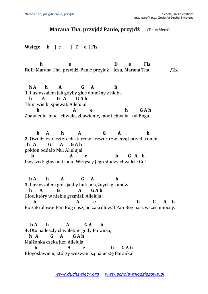 Marana Tha, przyjdź Panie, przyjdź Schola „In Te confido” przy parafii p.w. Zesłania Ducha Świętego Marana Tha, przyjdź Panie, przyjdź Wstęp: h | e | D (Deus Meus) e | Fis h e D e Fis Ref.: Marana Tha, przyjdź, Panie przyjdź – Jezu, Marana Tha. /2x hA h A G A h 1. I usłyszałem jak gdyby głos donośny z nieba h A G A GAh Tłum wielki śpiewał: Alleluja! h A e h GAh Zbawienie, moc i chwała, zbawienie, moc i chwała - od Boga. h A h A G A h 2. Dwudziestu czterech starców i czworo zwierząt przed tronem h A G A GAh pokłon oddało Mu: Alleluja! h A e h G A h I wyszedł głos od tronu: Wszyscy Jego słudzy chwalcie Go! hA h A G A h 3. I usłyszałem głos jakby huk potężnych gromów h A G A GAh Głos, który w niebie grzmiał: Alleluja! h A e h G A h Bo zakrólował Pan Bóg nasz, bo zakrólował Pan Bóg nasz wszechmocny. hA h A GA h 4. Oto nadeszły chwalebne gody Baranka, h A G A GAh Małżonka czeka już: Alleluja! h A e h GAh Błogosławieni, którzy wezwani są na ucztę Baranka! www.duchswiety.org www.schola-mlodziezowa.pl Marana Tha, przyjdź Panie, przyjdź Schola „In Te confido” przy parafii p.w. Zesłania Ducha Świętego Marana Tha, przyjdź Panie, przyjdź Wstęp: h | e | D (Deus Meus) e | Fis h e D e Fis Ref.: Marana Tha, przyjdź Panie, przyjdź – Jezu, Marana Tha. /2x hA h A G A h 1. I usłyszałem jak gdyby głos donośny z nieba h A G A GAh Tłum wielki śpiewał: Alleluja! h A e h GAh Zbawienie, moc i chwała, zbawienie, moc i chwała - od Boga. e e C a D D e D C D a G C e H e e e e www.duchswiety.org D a C D D D www.schola-mlodziezowa.pl e