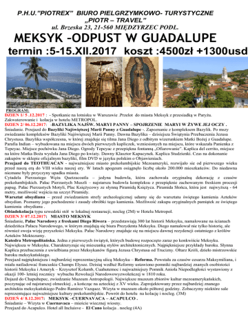 P.H.U.”PIOTREX” BIURO PIELGRZYMKOWO- TURYSTYCZNE „PIOTR – TRAVEL” ul. Brzeska 23, 21-560 MIĘDZYRZEC PODL. MEKSYK –ODPUST W GUADALUPE termin :5-15.XII.2017 koszt :4500zł +1300usd PROGRAM: DZIEN 1/ 5 .12.2017 : - Spotkanie na lotnisku w Warszawie .Przelot do miasta Meksyk z przesiadką w Paryżu. Zakwaterowanie i kolacja w hotelu METROPOL. DZIEN 2/ 06.12.2017: -BAZYLIKA NAJŚW. MARYI PANNY – SPOJRZENIE MARYI W ŻYWE JEJ OCZY . Śniadanie. Przejazd do Bazyliki Najświętszej Marii Panny z Guadalupe -. Zapoznanie z kompleksem Bazylik. Po mszy zwiedzanie kompleksów Bazyliki Najświętszej Marii Panny. Dawna Bazylika – dzisiejsza Świątynia Przebaczenia Jezusa Chrystusa. Bazylika współczesna, w której znajduje się tilma Jana Diego z odbitym wizerunkiem Matki Bożej z Guadalupe. Parafia Indian – wybudowana na miejscu dwóch pierwszych kapliczek, wzniesionych na miejscu, które wskazała Panienka z Tepeyac. Miejsce pochówku Jana Diego. Ogrody Tepeyac z przepiękna fontanną „Ofiarowanie”. Kaplica del cerrito, miejsce na które Matka Boża wysłała Jana Diego po kwiaty. Dawny Klasztor Kapucynek. Kaplica Studzienki. Czas na dokonanie zakupów w sklepie oficjalnym bazyliki, film DVD w języku polskim o Objawieniach. Przejazd do TEOTHUACAN - najważniejsze miasto prekolumbijskie Mezoameryki, rozwijało sie od pierwszego wieku przed naszą erą do VIII wieku naszej ery. W latach apogeum osiągnęło liczbę około 200.000 mieszkańców. Do niedawna nieznane były przyczyny upadku miasta. Cytadela Pierzastego Węża Quetzacoatla – jedyna budowla, która zachowała oryginalną dekorację z czasów prekolumbijskich. Pałac Pierzastych Muszli – najstarsza budowla kompleksu z przepięknie zachowanym freskiem procesji papug. Pałac Pierzastych Motyli, Plac Księżycowy ze słynną Piramidą Księżyca. Piramida Słońca, która jest najwyższą - 64 metry, możliwość wejścia na szczyt Piramidy. Warsztat obsydianu – przed zwiedzaniem strefy archeologicznej udamy się do warsztatu świętego kamienia Azteków obsydian. Poznamy jego pochodzenie i zasady obróbki tego kamienia. Możliwość zakupu oryginalnych pamiątek ze świętego kamienia obsydianu . Obiadokolacja typu szwedzki stół w lokalnej restauracji, nocleg (2M) w Hotelu Metropol. DZIEN 3/ 07.12.2017: MIASTO MEKSYK Śniadanie, Pałac Narodowy z freskami Diego Riwera – przedstawiają 300 lat historii Meksyku, namalowane na ścianach dziedzińca Pałacu Narodowego, w którym znajdują się biura Prezydenta Meksyku. Diego namalował nie tylko historię, ale również swoja wizję przyszłości Meksyku. Pałac Narodowy znajduje się na miejscu dawnej rezydencji ostatniego z królów Azteków Moktezumy. Katedra Metropolitańska. Jedna z pierwszych świątyń, których budowę rozpoczęto zaraz po konkwiście Meksyku. Największa w Meksyku. Charakteryzuje się mieszanką stylów architektonicznych. Najpiękniejsze przykłady baroku. Słynna Kaplica przebaczenia z uwielbiana przez Meksykanów figurą Jezusa Chrystusa od Trucizny. Ołtarz Króli, dzieło mistrzowskie baroku meksykańskiego. Przejazd najpiękniejsza i najbardziej reprezentacyjną ulicą Meksyku – Reforma. Powstała za czasów cesarza Maksymiliana, i miała naśladować francuskie Champs Elysee. Dzisiaj wzdłuż Reformy ustawiono pomniki najbardziej znanych osobistości historii Meksyku i Ameryk – Krzysztof Kolumb, Cuahutemoc i najważniejszy Pomnik Anioła Niepodległości wystawiony z okazji 100- letniej rocznicy wybuchu Rewolucji Narodowowyzwoleńczej w 1810 roku. Dojazd do Chapultepec, zwiedzanie Muzeum Antropologii. Największe muzeum zbiorów kultur mezoamerykańskich, poczynając od najstarszej olmeckiej , a kończąc na azteckiej z XV wieku. Zaprojektowany przez najbardziej znanego architekta meksykańskiego Pedro Ramirez Vazquez. Wizyta w muzeum około półtorej godziny. Zobaczymy niektóre sale reprezentujące najważniejsze kultury prekolumbijskie. Powrót do hotelu na kolację i nocleg. (3M) DZIEŃ 4/ 8.12.2017: MEKSYK –CUERNAVACA – ACAPULCO . Śniadanie – Wizyta w Cuernavaca – mieście wiecznej wiosny. Przejazd do Acapulco. Hotel all Incluisve - El Cano kolacja . nocleg (4A) DZIEN 5 i 6 / 09-10.12.2017: ACAPULCO – QUEBARDE . pobyt w hotelu i na plaży All Inclusive, Relax wypoczynek nad PACYFIKIEM - wyjątkowo atrakcyjne miejsce do regeneracji sił – kurort światowej sławy. Wyjazd na pokaz skoków do wody z wys. 40 m na Quebarde. Nocleg Możliwość skorzystania z wycieczek fakultatywnych (5A), (6A) DZIEN 7/ 11.12.2017 : ACAPULCO – TAXCO – MEKSYK Śniadanie, rano przejazd do Meksyku, przez stolicę srebra Taxco. Po drodze wizyta w sklepie warsztacie, zapoznanie z produkcja wyrobów ze srebra, degustacja lokalnego drinka Berta. Zwiedzanie Kościoła wybudowanego przez ojca dla syna SANTA PRISCA . Czas na zakupy srebra. Zakwaterowanie w hotelu w Meksyku .Kolacja. Nocleg w hotelu Mision Zona Rosa (7M) DZIEŃ 8/ 12.12.2017 : – WIELKIE UROCZYSTOŚCI w GUADALUPE – MSZA ŚW. ODPUSTOWA /tzw. MSZA RÓŻ / - Śniadanie, uczestnictwo w obchodach Objawień Najświętszej Marii Panny z Guadalupe - patronki życia poczętego. Na tę uroczystość przyjeżdżają miliony ludzi , z różnych państw świata i poszczególnych szczepów Indianie. Amerykanie z południa i z północy przyjeżdżają do swojej patronki – do swojej jak JĄ nazywają CESARZOWEJ. Jest to wyjątkowy , niepowtarzalny w całym roku - dzień w państwie i mieście MEKSYK. Przejazd do XOCHIMILCO (pływające ogrody) na godzinny rejs z lunchem. Powrót do hotelu Nocleg (8M) DZIEŃ 9/ 13.12.2017 - Nawiedzimy kościół i klasztor św. Krzyża, ze słynnym i unikatowym drzewem, które rodzi kolce w kształcie krzyża, stare miasto – kolebka walki o niepodległość Meksyku, oraz Wzgórze Dzwonów. Przejazd do TEPOTZOTLAN – przepiękne kolonialne, meksykańskie miasteczko, gdzie znajduje się Muzeum Wicekrólestwa z przepięknym barokowym Kościołem .