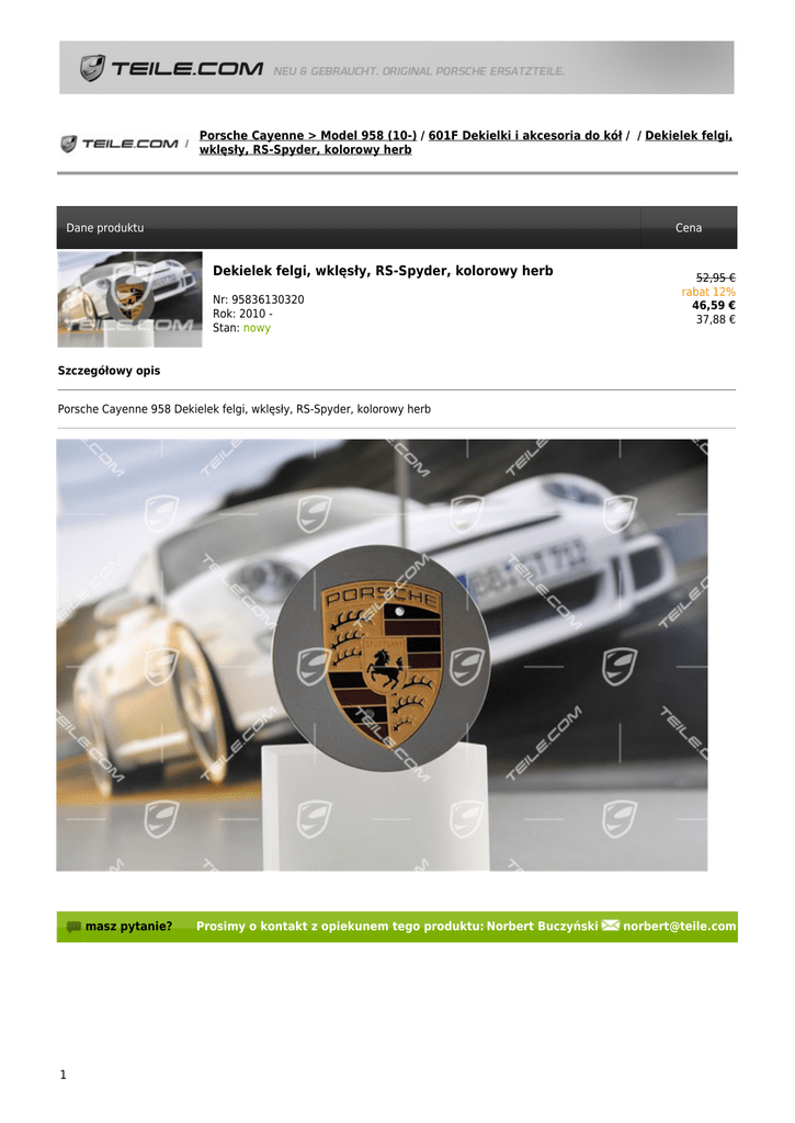 Porsche Cayenne > Model 958 (10-) / 601F Dekielki i akcesoria do kół / / Dekielek felgi, wklęsły, RS-Spyder, kolorowy herb Dane produktu Cena Dekielek felgi, wklęsły, RS-Spyder, kolorowy herb Nr: 95836130320 Rok: 2010 Stan: nowy 52,95 € rabat 12% 46,59 € 37,88 € Szczegółowy opis Porsche Cayenne 958 Dekielek felgi, wklęsły, RS-Spyder, kolorowy herb masz pytanie? 1 Prosimy o kontakt z opiekunem tego produktu: Norbert Buczyński [email protected]