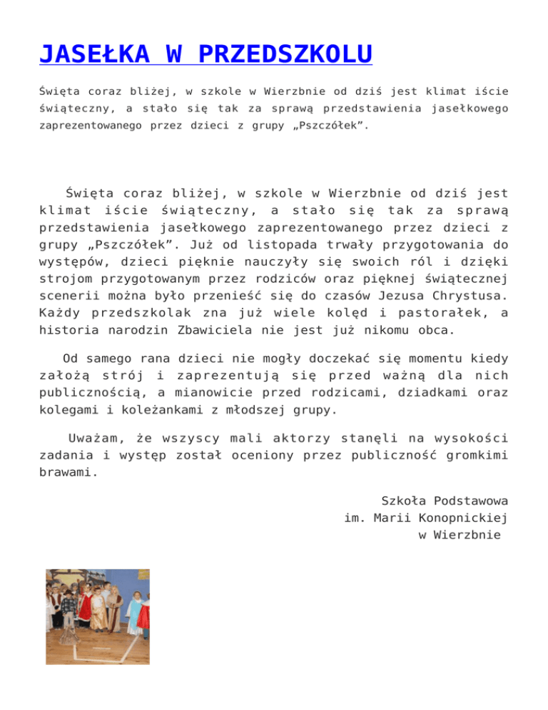 JASEŁKA W PRZEDSZKOLU Święta coraz bliżej, w szkole w Wierzbnie od dziś jest klimat iście świąteczny, a stało się tak za sprawą przedstawienia jasełkowego zaprezentowanego przez dzieci z grupy „Pszczółek”. Święta coraz bliżej, w szkole w Wierzbnie od dziś jest klimat iście świąteczny, a stało się tak za sprawą przedstawienia jasełkowego zaprezentowanego przez dzieci z grupy „Pszczółek”. Już od listopada trwały przygotowania do występów, dzieci pięknie nauczyły się swoich ról i dzięki strojom przygotowanym przez rodziców oraz pięknej świątecznej scenerii można było przenieść się do czasów Jezusa Chrystusa. Każdy przedszkolak zna już wiele kolęd i pastorałek, a historia narodzin Zbawiciela nie jest już nikomu obca. Od samego rana dzieci nie mogły doczekać się momentu kiedy założą strój i zaprezentują się przed ważną dla nich publicznością, a mianowicie przed rodzicami, dziadkami oraz kolegami i koleżankami z młodszej grupy. Uważam, że wszyscy mali aktorzy stanęli na wysokości zadania i występ został oceniony przez publiczność gromkimi brawami. Szkoła Podstawowa im. Marii Konopnickiej w Wierzbnie dsc00737 dsc00741 dsc00744 dsc00747 dsc00749