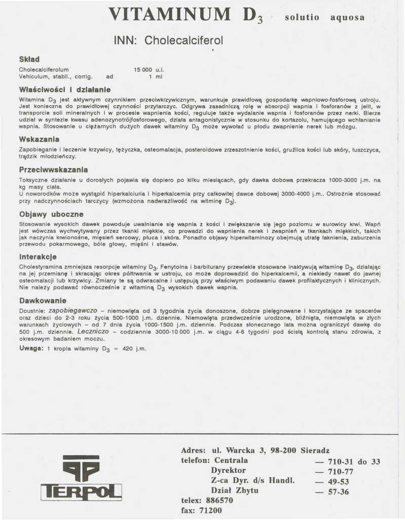 VITAMINUM Cholecalciferolum Vehiculum, słabi!., corrig. Witamina 03 jest aktywnym czynnikiem przeciwkrzywicznym, warunkuje prawidłową gospodarkę wapniowo-fosforową ustroju. Jest konieczna do prawidłowej czynności przytarczyc. Odgrywa zasadniczą rolę w absorpcji wapnia I fosforanów z jelit, w transporcie soli mineralnych I w procesie wapnienia kości, reguluje także wydalanie wapnia i fosforanów przez nerki. Bierze udział w syntezie kwasu adenozynotrójfosforowego, działa antagonistycznie w stosunku do kortazolu, hamującego wchłanianie wapnia. Stosowanie u ciężarnych dużych dawek witaminy 03 może wywołać u płodu zwapnienie nerek lub mózgu. Toksyczne działanie u dorosłych pojawia się dopiero po kilku miesi'lcach, gdy dawka dobowa przekracza 1000-3000 j.m. na kg masy ciała. U noworodków może wyst'lPić hiperkalciuria I hiperkalcemia przy całkowitej dawce dobowej 3000-4000 j.m.. Ostrożnie stosować przy nadczynnościach tarczycy (wzmożona nadwrażliwość na witminę Dal. Objawy uboczne Stosowanie wysokich dawek powoduje uwalnianie się wapnia z kości i zwiększanie się jego poziomu w surowicy krwi. Wapń jest wówczas wychwytywany przez tkanki miękkie, co prowadzi do wapnienia nerek i zwapnień w tkankach miękkich, takich jak naczynia krwionośne, przewodu pokarmowego, mIęsień sercowy, płuca l skóra. Ponadto bóle głowy, mit'sni i stawów. objawy hiperwitamInozy obejmują utratt' łaknienia, zaburzenia Interakcje Cholestyramina zmniejsza resorpcje witaminy 03' Fenytoina i barbiturany przewleklestosowane inaktywuj'l witaminę 03, działaj'lc na jej przemianę i skracaj'lc okres pół1rwania w ustroju, co może doprowadzić do hiperkalcemii, a niekiedy nawet do jawnej osteomałacji lub krzywicy. Zmiany te sIl odwracalne i ustępuj'l przy właściwym podawaniu dawek profilaktycznych i klinicznych. Nie należy podawać równocześnie z witaminą 03 wysokich dawek wapnia. Dawkowanie Doustnie: zapobiegawczo - niemowlęta od 3 tygodnia życia donoszone, dobrze pielęgnowane i korzystaj'lce ze spacerów oraz dzieci do 2-3 roku życia 500-1000 j.m. dziennie. Niemowlęta przedwcześnie urodzone, bliinięta, niemowlęta w złych warunkach życiowych - od 7 dnia życia 1000-1500 j.m. dziennie. Podczas słonecznego lata można ograniczyć dawkę do 500 j.m. dziennie. Leczniczo - codziennie 3000-10000 j.m. w ci'lgu 4-6 tygodni pod ścisł'l kontrol'l stanu zdrowia, z okresowym badaniem moczu. Uwaga: 1 kropla witaminy 03 ~ 420 j.m. Adres: ul. Warcka 3, 98-200 Sieradz teleron: Centrala 710-31 do 33 Dyrektor 710-77 Z-ca Dyr. d/s Handl. 49-53 Dział Zbytu 57 -36 telex: 886570 fax: 71200