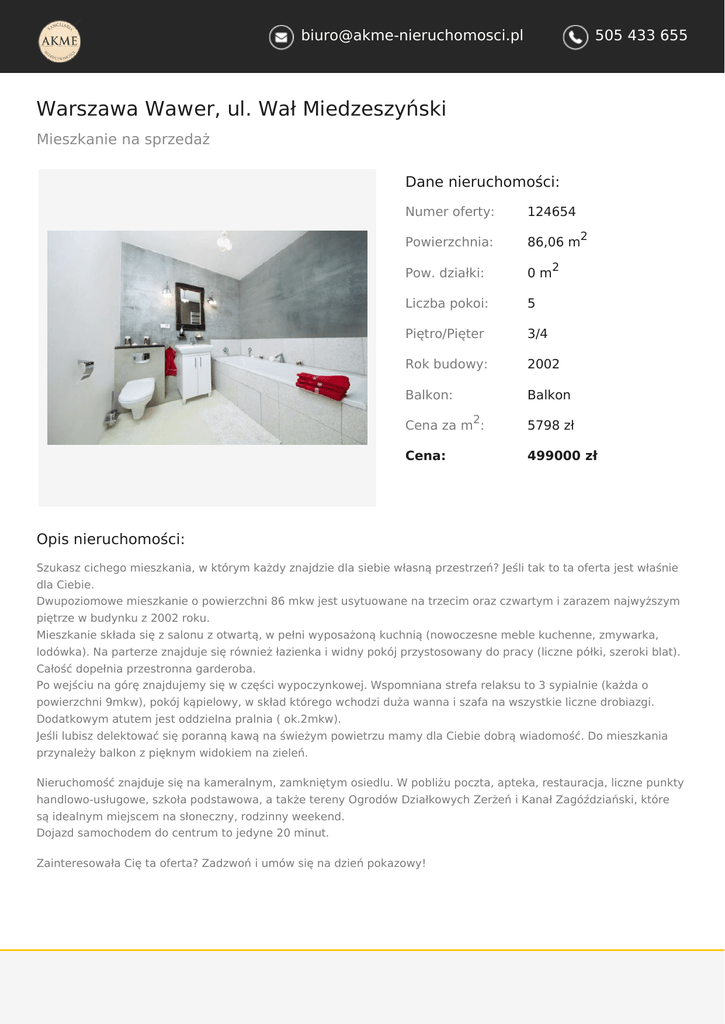 [email protected] 505 433 655 Warszawa Wawer, ul. Wał Miedzeszyński Mieszkanie na sprzedaż Dane nieruchomości: Numer oferty: 124654 Powierzchnia: 86,06 m Pow. działki: 0m Liczba pokoi: 5 Piętro/Pięter 3/4 Rok budowy: 2002 Balkon: Balkon 2 2 2 Cena za m : 5798 zł Cena: 499000 zł Opis nieruchomości: Szukasz cichego mieszkania, w którym każdy znajdzie dla siebie własną przestrzeń? Jeśli tak to ta oferta jest właśnie dla Ciebie. Dwupoziomowe mieszkanie o powierzchni 86 mkw jest usytuowane na trzecim oraz czwartym i zarazem najwyższym piętrze w budynku z 2002 roku. Mieszkanie składa się z salonu z otwartą, w pełni wyposażoną kuchnią (nowoczesne meble kuchenne, zmywarka, lodówka). Na parterze znajduje się również łazienka i widny pokój przystosowany do pracy (liczne półki, szeroki blat). Całość dopełnia przestronna garderoba. Po wejściu na górę znajdujemy się w części wypoczynkowej. Wspomniana strefa relaksu to 3 sypialnie (każda o powierzchni 9mkw), pokój kąpielowy, w skład którego wchodzi duża wanna i szafa na wszystkie liczne drobiazgi. Dodatkowym atutem jest oddzielna pralnia ( ok.2mkw). Jeśli lubisz delektować się poranną kawą na świeżym powietrzu mamy dla Ciebie dobrą wiadomość. Do mieszkania przynależy balkon z pięknym widokiem na zieleń. Nieruchomość znajduje się na kameralnym, zamkniętym osiedlu. W pobliżu poczta, apteka, restauracja, liczne punkty handlowo-usługowe, szkoła podstawowa, a także tereny Ogrodów Działkowych Zerżeń i Kanał Zagóździański, które są idealnym miejscem na słoneczny, rodzinny weekend. Dojazd samochodem do centrum to jedyne 20 minut. Zainteresowała Cię ta oferta? Zadzwoń i umów się na dzień pokazowy! [email protected] 505 433 655