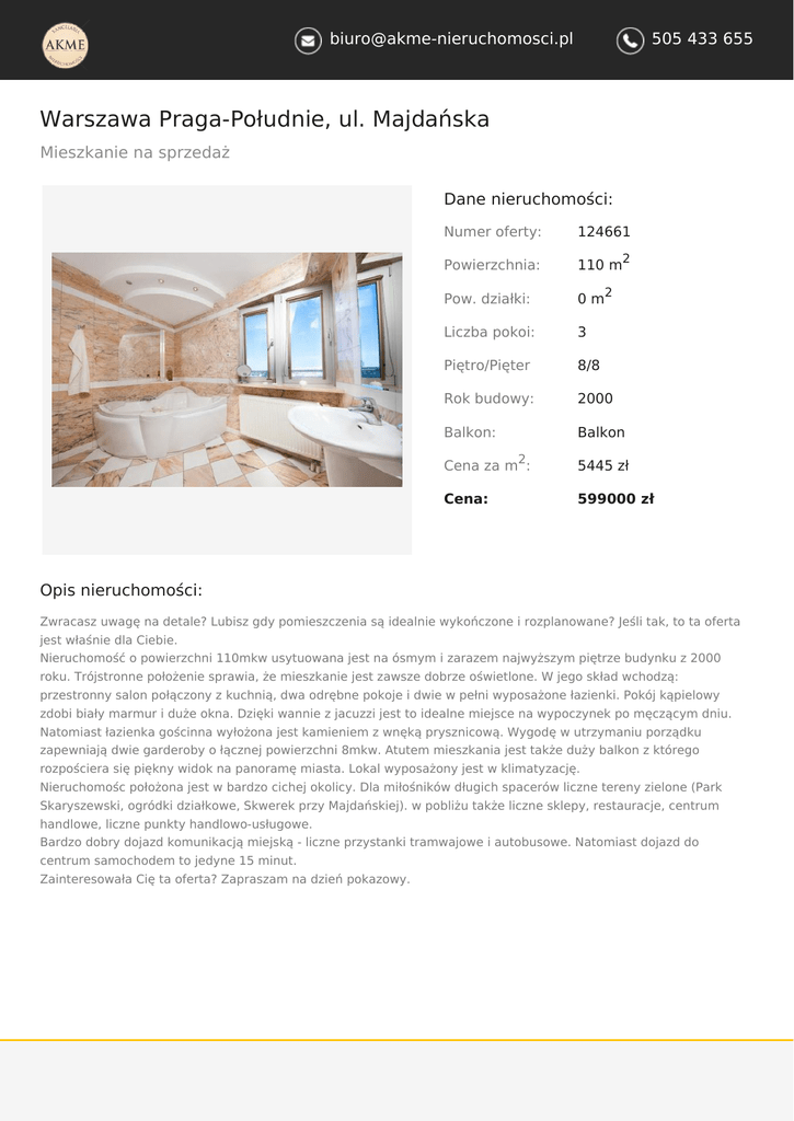 [email protected] 505 433 655 Warszawa Praga-Południe, ul. Majdańska Mieszkanie na sprzedaż Dane nieruchomości: Numer oferty: 124661 Powierzchnia: 110 m Pow. działki: 0m Liczba pokoi: 3 Piętro/Pięter 8/8 Rok budowy: 2000 Balkon: Balkon 2 2 2 Cena za m : 5445 zł Cena: 599000 zł Opis nieruchomości: Zwracasz uwagę na detale? Lubisz gdy pomieszczenia są idealnie wykończone i rozplanowane? Jeśli tak, to ta oferta jest właśnie dla Ciebie. Nieruchomość o powierzchni 110mkw usytuowana jest na ósmym i zarazem najwyższym piętrze budynku z 2000 roku. Trójstronne położenie sprawia, że mieszkanie jest zawsze dobrze oświetlone. W jego skład wchodzą: przestronny salon połączony z kuchnią, dwa odrębne pokoje i dwie w pełni wyposażone łazienki. Pokój kąpielowy zdobi biały marmur i duże okna. Dzięki wannie z jacuzzi jest to idealne miejsce na wypoczynek po męczącym dniu. Natomiast łazienka gościnna wyłożona jest kamieniem z wnęką prysznicową. Wygodę w utrzymaniu porządku zapewniają dwie garderoby o łącznej powierzchni 8mkw. Atutem mieszkania jest także duży balkon z którego rozpościera się piękny widok na panoramę miasta. Lokal wyposażony jest w klimatyzację. Nieruchomośc położona jest w bardzo cichej okolicy. Dla miłośników długich spacerów liczne tereny zielone (Park Skaryszewski, ogródki działkowe, Skwerek przy Majdańskiej). w pobliżu także liczne sklepy, restauracje, centrum handlowe, liczne punkty handlowo-usługowe. Bardzo dobry dojazd komunikacją miejską - liczne przystanki tramwajowe i autobusowe. Natomiast dojazd do centrum samochodem to jedyne 15 minut. Zainteresowała Cię ta oferta? Zapraszam na dzień pokazowy. [email protected] 505 433 655