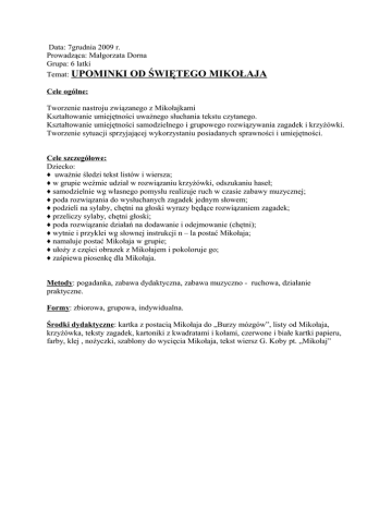 Data: 7grudnia 2009 r. Prowadząca: Małgorzata Dorna Grupa: 6 latki Temat: UPOMINKI OD ŚWIĘTEGO MIKOŁAJA Cele ogólne: Tworzenie nastroju związanego z Mikołajkami Kształtowanie umiejętności uważnego słuchania tekstu czytanego. Kształtowanie umiejętności samodzielnego i grupowego rozwiązywania zagadek i krzyżówki. Tworzenie sytuacji sprzyjającej wykorzystaniu posiadanych sprawności i umiejętności. Cele szczegółowe: Dziecko: ♦ uważnie śledzi tekst listów i wiersza; ♦ w grupie weźmie udział w rozwiązaniu krzyżówki, odszukaniu haseł; ♦ samodzielnie wg własnego pomysłu realizuje ruch w czasie zabawy muzycznej; ♦ poda rozwiązania do wysłuchanych zagadek jednym słowem; ♦ podzieli na sylaby, chętni na głoski wyrazy będące rozwiązaniem zagadek; ♦ przeliczy sylaby, chętni głoski; ♦ poda rozwiązanie działań na dodawanie i odejmowanie (chętni); ♦ wytnie i przyklei wg słownej instrukcji n – la postać Mikołaja; ♦ namaluje postać Mikołaja w grupie; ♦ ułoży z części obrazek z Mikołajem i pokoloruje go; ♦ zaśpiewa piosenkę dla Mikołaja. Metody: pogadanka, zabawa dydaktyczna, zabawa muzyczno - ruchowa, działanie praktyczne. Formy: zbiorowa, grupowa, indywidualna. Środki dydaktyczne: kartka z postacią Mikołaja do „Burzy mózgów”, listy od Mikołaja, krzyżówka, teksty zagadek, kartoniki z kwadratami i kołami, czerwone i białe kartki papieru, farby, klej , nożyczki, szablony do wycięcia Mikołaja, tekst wiersz G. Koby pt. „Mikołaj” 1. Powitanie w kręgu – zabawa „Iskierka przyjaźni”. Dzieci, stojąc w kręgu, krzyżują ręce i je sobie podają. N – lka ściska dłoń osobie obok niej i mówi: „Iskierkę przyjaźni puszczam w krąg i niech ciepła i miła wróci do mych rąk”. Dzieci podają uścisk z dalej, tak aby wrócił do nauczycielki. 2. Zabawa – „Burza mózgów”. N - lka kładzie na podłodze kartkę papieru i zapisuje wszystkie propozycje dzieci bez komentarza. Potem je wiesza w widocznym miejscu na tablicy. 3. Zabawa rozwijająca wrażliwość słuchową „Rozgrzewamy uszy”. N – lka przypomina, że na dworze jest już zimno i szczególnie marzną uszy. Dzieci wykonują kilkakrotnie masaż uszu poprzez „odwijanie” ich w kierunku z góry na dół. Jest to zabawa „Kapturek myśliciela” z metody kinezjologii edukacyjnej Dennisona. 4. Zwrócenie uwagi na tajemniczy list wiszący na gazetce tematycznej. N – lka czyta list o następującej treści: Kochane dzieci! Wraz z moimi pomocnikami byłem dziś w nocy u Was w szkole. Zauważyliśmy, że przygotowaliście skarpety na słodycze i upominki. Gdzie są teraz? Wybierzcie się na poszukiwanie. Rozwiążcie zadania, które są umieszczone w kolejnych kopertach oznaczonych numerami od 1 – 5. Życzę Wam udanej zabawy i powodzenia. 5. Odszukanie właściwej koperty z cyfrą 1 poprzez rozwiązanie działania 2 – 1=… . N –lka odczytuje dzieciom tekst kolejnego listu z zadaniem: Wysłuchajcie teraz uważnie tekstu wiersza czytanego przez waszą panią i odpowiedzcie po rozwiązaniu krzyżówki na pytanie „Jak nazywała się dziewczynka, dla której Mikołaj przyniósł lalkę?” Dzieci po wysłuchaniu wiersza otrzymują krzyżówkę obrazkową i starają się ją rozwiązać, a potem odczytują hasło. 6. Oszukanie kolejnej koperty z zadaniem – rozwiązanie działania 1 + 1 = … . Teraz mam dla Was zadanie ruchowo muzyczne. Przy wesołej muzyce tańczcie w następujący sposób: - tańczymy jak wesołe Mikołaje - tańczymy jak Mikołaj opędzający się od much - tańczymy jakby Mikołaj niósł bardzo ciężki worek - tańczymy parami trzymając się za kolana - tańczymy trójkami trzymając się za łokcie. N – lka włącza świąteczną muzykę a dzieci tańczą zgodnie z poleceniami, podawanymi w przerwie. 7. Odczytanie kolejnej koperty z zadaniem – działanie 5 – 2 = … . Wasza pani odczyta teraz zagadki, które dla Was przygotowałem. Rozwiążcie je, a potem ułóżcie na stolikach tyle kół ile jest sylab w poszczególnych wyrazach oraz połóżcie tyle kwadratów ile jest głosek w tych wyrazach. Pani też zapyta Was o pierwszą i ostatnią głoskę w wymienionych wyrazach. N – lka czyta zagadki, dzieci się zgłaszają i rozwiązują je. Następnie układają sylaby (koła) oraz głoski (kwadraty). Odpowiadają też na pytania o pierwszą i ostatnią głoskę w podanych wyrazach. 8. Oczytanie ostatniej, czwartej koperty – działanie: 3 + 1=… . To już ostatnie zadanie, które dla Was przygotowałem. Myślę, że Wam się spodoba ponieważ wiem jak lubicie wykonywać różne prace plastyczne. Przygotowałem dla Was 3 oferty pracy. Wylosujcie teraz figury geometryczne i nazwijcie je, a wasza pani wytłumaczy Wam jak należy wykonać poszczególne zadania. Życzę powodzenia. N – lka przedstawia dzieciom oferty pracy: ♦ ♦ ♦ Mikołaj do wycięcia i sklejenia z narysowanych wcześniej na papierze technicznym elementów wg wzoru; Malowanie Mikołaja na dużej kartce papieru w grupie; Ułożenie z części, a następnie pokolorowanie portretu Mikołaja. Jeżeli dzieci po wykonaniu swoich wylosowanych prac będą chciały wykonać prace plastyczną innej grupy, to nauczycielka dostarcza im potrzebne materiały. Po wykonaniu pracy n – lka wywiesza prace na tablicach („Mała galeria”). Dzieci oglądają i prowadzą swobodne rozmowy na temat swoich „dzieł”. 9. Odczytanie ostatniego listu oznaczonego działaniem 2 + 3 =… . Drogie Dzieci! Prawidłowo wykonałyście wszystkie zadania. Myślę, że zasłużyłyście na nagrody. Poproście panią żeby otworzyła szafę po lewej stronie, a zobaczycie jakie niespodzianki dla Was przygotowałem. Słyszałem też, że umiecie śpiewać piosenkę o Mikołaju. Zaśpiewajcie ją dla mnie. Dziękuję Wam za wspaniałą zabawę. Wasz Mikołaj Dzieci śpiewają piosenkę pt. „Mikołaj”, a potem n – lka rozdaje prezenty.
