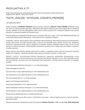 PROFILAKTYKA A TY Źródło: http://pat.policja.gov.pl/pat/wydarzenia/2037,Teatr-Inaczej-wystawil-czwarta-premiere.html Wygenerowano: Wtorek, 7 marca 2017, 00:09 TEATR „INACZEJ” WYSTAWIŁ CZWARTĄ PREMIERĘ „W Labiryncie życia” Czwórki królowały w Sokołowie Podlaskim podczas premiery spektaklu „Labirynt” Teatru INACZEJ sokołowskiej grupy PaT. Był to już czwarty spektakl tego teatru, obejrzała go 400 osobowa widownia, tylko 24 dni trwały próby od castingu do premiery spektaklu. W tym dniu obchodziliśmy także czwarte urodziny programu PaT w Sokołowie Podlaskim oraz czterech aktorów po raz pierwszy wystąpiło na PaTowskiej scenie. Premiera odbyła się w Sokołowskim Ośrodku Kultury 10 września 2012 roku, o godz. 11.30. Teatr INACZEJ zaprezentował się w autorskiej realizacji Wiktorii Benedykciuk – lidera programu PaT w Sokołowie Podlaskim. W spektaklu „Labirynt” aktorzy poprzez taniec opowiedzieli historię dziewczyny, która dokonuje ważnych dla siebie wyborów. Dostaje różne szanse, ale ciągle poszukuje tego, co jest dla niej naprawdę ważne. Spotyka różnych ludzi, doświadcza samotności, dostrzega próżność, egoizm, obojętność na drugiego człowieka. Odnajduje wreszcie kogoś, kto jest dla niej oparciem w trudnych sytuacjach, osłania skrzydłem zrozumienia, akceptacji, jest w każdej chwili, bez względu na wszystko, w każdej przestrzeni. Obrazy tworzone przez aktorów skłaniały publiczność do refleksji, a zaskakujące środki sceniczne wprowadzały interakcje między nimi a widownią – odważniejsi widzowie nawet zatańczyli z aktorami na scenie i w strefie widza. Spektakl „Labirynt” wyreżyserowała Wiktoria Benedykciuk, tegoroczna absolwentka Salezjańskiego Liceum Ogólnokształcącego im. Henryka Sienkiewicza. Jej asystentami były Dominika Zawadzka (I LO im. Marii Skłodowskiej Curie) oraz Ania Woźniak. Aranżację muzyczną przygotował Paweł Zakrzewski, a filmową Szymon Grochowski. W spektaklu wystąpili: Luiza Aleksandrowicz(Publiczne Gimnazjum nr 1 im. Pawła Kamińskiego) Wiktoria Benedykciuk (lider PaT) Anna Domańska (I Liceum Ogólnokształcące im. Marii Skłodowskiej-Curie) Lena Godlewska (I Liceum Ogólnokształcące im. Marii Skłodowskiej-Curie) Piotr Kozioł (Zespół Szkół nr 1 im. KK Baczyńskiego) Agata Lesiuk (Gimnazjum Salezjańskie) Justyna Rytel (Salezjańskie Liceum Ogólnokształcące) Wiktoria Skłodowska (Publiczne Gimnazjum nr 1 im. Pawła Kamińskiego) Paulina Woźniak (I Liceum Ogólnokształcące im. Marii Skłodowskiej-Curie) Mateusz Zubow (Zespół Szkół Centrum Kształcenia Rolniczego) Na widowni zasiadło ponad 400 uczniów z sokołowskich gimnazjów i szkół ponadgimnazjalnych, rodziców aktorów i zaproszonych gości. Specjalne pozdrowienia sokołowskiej grupie PaT przekazała Elżbieta Rusiniak z MSW oraz mł. insp. Rafał Batkowski Mazowiecki Komendant Wojewódzki Policji. Swoją obecnością zaszczycili premierę również: Impresariat programu PaT z insp. Grzegorzem Jachem Wójt Gminy Bielany Zbigniew Woźniak wraz z Sekretarz Gminy Krystyną Długołęcką i Skarbnikiem Barbarą Zawadzką Wójt Gminy Sabnie Ireneusz Piotr Wyszyński, I Zastępca Komendanta Powiatowego Policji w Sokołowie Podlaskim kom. Marek Żero wraz z Naczelnikiem Wydziału Prewencji asp.szt. Krzysztofem Sochą Wiesław Rogulski – były Komendant Powiatowy Policji w Sokołowie Podlaskim, współgospodarz utworzenia sokołowskiej grupy PaT Ewa Murawska – Pełnomocnik Starosty ds. Przeciwdziałania Narkomanii Elżbieta Świszczewska – Pełnomocnik Burmistrza ds rozwiązywania problemów alkoholowych Alina Simanowicz – Z-ca Dyrektora Sokołowskiego Ośrodka Kultury Grażyna Binduła- Dyrektor Zespołu Szkół w Sterdyni Marianna Kobylińska – Dyrektor Gminnego Ośrodka Kultury i Sportu w Sterdyni Ewa Rutkowska – Dyrektor Miejsko Gminnego Ośrodka Kultury w Kosowie Lackim hm. Anna Hilaruk - Krajowy Koordynator Programu Profilaktyka a Harcerstwo Magdalena Andrzejczyk - Koordynatora Programu PaT w Siedlcach Anna Łukasiak właścicielka Studia Tańca Underground Dance Studio w Lublinie Po spektaklu aktorzy zaprosili gości na urodzinowy tort, który jak co roku został przygotowany przez firmę TOPAZ pana Zbigniewa Paczóskiego, ciastkarnia „Natalia i Szymon”. To przy tym wyśmienitym torcie świętowaliśmy kolejną rocznicę swojej działalności w obszarze profilaktyki rówieśniczej w programie Profilaktyka a Ty i projekcie Profilaktyka a Harcerstwo. Oficer Prasowy KPP Sokołów Podlaski asp. szt. Sławomir Tomaszewski Zdjęcia: Anna Woźniak, Maciej Tomaszewski Ocena: 0/5 (0) Tweetnij