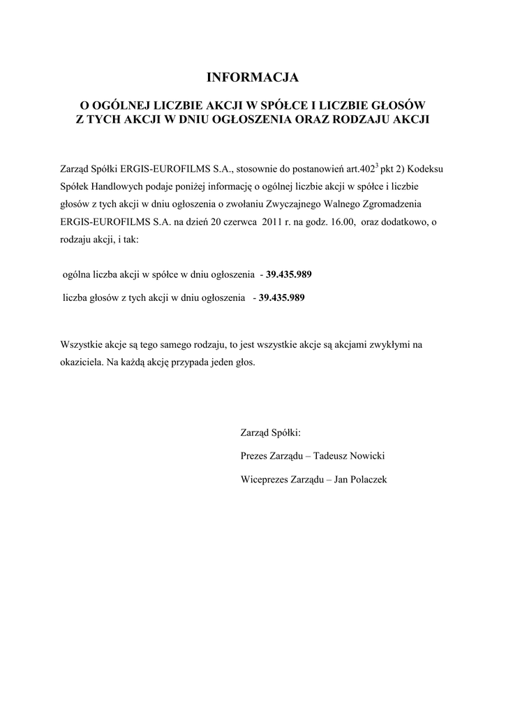 INFORMACJA O OGÓLNEJ LICZBIE AKCJI W SPÓŁCE I LICZBIE GŁOSÓW Z TYCH AKCJI W DNIU OGŁOSZENIA ORAZ RODZAJU AKCJI Zarząd Spółki ERGIS-EUROFILMS S.A., stosownie do postanowień art.4023 pkt 2) Kodeksu Spółek Handlowych podaje poniżej informację o ogólnej liczbie akcji w spółce i liczbie głosów z tych akcji w dniu ogłoszenia o zwołaniu Zwyczajnego Walnego Zgromadzenia ERGIS-EUROFILMS S.A. na dzień 20 czerwca 2011 r. na godz. 16.00, oraz dodatkowo, o rodzaju akcji, i tak: ogólna liczba akcji w spółce w dniu ogłoszenia - 39.435.989 liczba głosów z tych akcji w dniu ogłoszenia - 39.435.989 Wszystkie akcje są tego samego rodzaju, to jest wszystkie akcje są akcjami zwykłymi na okaziciela. Na każdą akcję przypada jeden głos. Zarząd Spółki: Prezes Zarządu – Tadeusz Nowicki Wiceprezes Zarządu – Jan Polaczek
