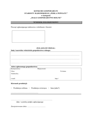 KONKURS GOSPODARCZY STAROSTY RADOMSKIEGO „PERŁA POWIATU” w kategorii: „MAŁE GOSPODARSTWO ROLNE” WNIOSEK ZGŁOSZENIOWY Pieczęć zgłaszającego (adresowa z telefonem i faxem): ZGŁASZAM UDZIAŁ: Imię i nazwisko właściciela gospodarstwa rolnego: ………………………………………………………………………………………………… ………………………………………………………………………………………………… ………………………………………………………………………………………………… Adres zgłoszonego gospodarstwa: Kod pocztowy: Miejscowość: Ulica: Nr domu: Telefon/fax.: e-mail: http:// Kierunek produkcji: Produkcja roślinna Produkcja zwierzęca Inna (jaka?) ........................................................... …………………………………………………………. data / czytelny podpis zgłaszającego Zarejestrowano dnia: ....................................... KONKURS GOSPODARCZY STAROSTY RADOMSKIEGO „PERŁA POWIATU” w kategorii: „MAŁE GOSPODARSTWO ROLNE” ANKIETA ZGŁOSZENIOWA Imię i nazwisko właściciela gospodarstwa rolnego (dyrektora, prezesa) ...................................................................................................................................................... Dokładny adres:............................................................................................................................ ...................................................................................................................................................... Tel./fax. ........................................................................................................................................ 1. Wielkość gospodarstwa: ....................................ha 2. Kierunek produkcji............................................................................................................... 3. Status gospodarstwa: prywatne, dzierżawa, spółka, spółdzielnia, itp. .….…………………….......... 4. Produkcja roślinna – struktura zasiewów i upraw polowych oraz sadownictwo, kwiaciarstwo, warzywnictwo i szkółkarstwo. L.p. Rodzaj rośliny Powierzchnia Plon jedn./ha 1. 2. 3. 4. 5. Uwaga: dane zawarte w tabelach używane będą wyłącznie dla potrzeb prac Kapituły Konkursu i nie będą udostępniane osobom trzecim. 5. Produkcja zwierzęca: 1. Bydło mleczne 2. Bydło rzeźne 3. Trzoda chlewna 4. Drobiarstwo 5. Inne (w tym produkcja ryb) ilość jałówki/cielęta mleko mleko sprzedane w kl. ekstra mleko sprzedane w I kl. wydajność mleka od krowy ilość opasów sprzedanych łączna waga sprzedanych sztuk średni stan macior w roku ilość odchowanych prosiąt od maciory rocznie ilość sprzedanych tuczników łączna waga sprzedanych tuczników wielkość produkcji w roku wielkość produkcji w roku sztuk sztuk litrów/rok litrów/rok litrów/rok litrów/rok szt./ rok Ton szt. szt. szt./ rok Ton szt. szt. 6. Ważniejsze maszyny i urządzenia rolnicze, wdrożone nowe technologie produkcji(opisać) ................................................................................................................................................. ................................................................................................................................................. ................................................................................................................................................. ................................................................................................................................................. ................................................................................................................................................. ................................................................................................................................................. 7. Działalność pozarolnicza ( np. agroturystyka) – opisać ................................................................................................................................................. ................................................................................................................................................. ................................................................................................................................................. ................................................................................................................................................. ................................................................................................................................................. ................................................................................................................................................. ................................................................................................................................................. ................................................................................................................................................. 8. Działania na rzecz ochrony środowiska naturalnego (opisać) ................................................................................................................................................. ................................................................................................................................................. ................................................................................................................................................. ................................................................................................................................................. ..........................................................................................................