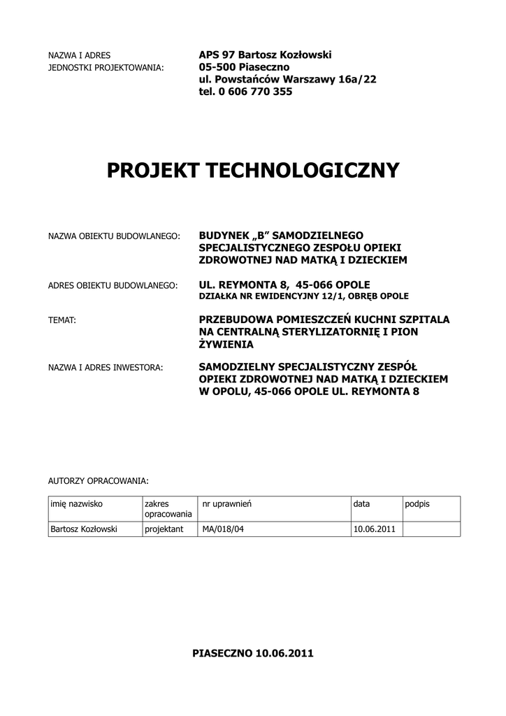 NAZWA I ADRES JEDNOSTKI PROJEKTOWANIA: APS 97 Bartosz Kozłowski 05-500 Piaseczno ul. Powstańców Warszawy 16a/22 tel. 0 606 770 355 PROJEKT TECHNOLOGICZNY NAZWA OBIEKTU BUDOWLANEGO: BUDYNEK „B” SAMODZIELNEGO SPECJALISTYCZNEGO ZESPOŁU OPIEKI ZDROWOTNEJ NAD MATKĄ I DZIECKIEM ADRES OBIEKTU BUDOWLANEGO: UL. REYMONTA 8, 45-066 OPOLE DZIAŁKA NR EWIDENCYJNY 12/1, OBRĘB OPOLE TEMAT: PRZEBUDOWA POMIESZCZEŃ KUCHNI SZPITALA NA CENTRALNĄ STERYLIZATORNIĘ I PION ŻYWIENIA NAZWA I ADRES INWESTORA: SAMODZIELNY SPECJALISTYCZNY ZESPÓŁ OPIEKI ZDROWOTNEJ NAD MATKĄ I DZIECKIEM W OPOLU, 45-066 OPOLE UL. REYMONTA 8 AUTORZY OPRACOWANIA: imię nazwisko zakres opracowania nr uprawnień data Bartosz Kozłowski projektant MA/018/04 10.06.2011 PIASECZNO 10.06.2011 podpis SPIS ZAWARTOŚCI PROJEKTU 1.Podstawa opracowania 2.Przedmiot opracowania 3. Lokalizacja 4.Założenia funkcjonalne i technologiczne 5. Proces technologiczny 6. Wytyczne branżowe 7. Wykaz powierzchni pomieszczeń 8. Zestawienie mebli i urządzeń technologicznych z określeniem zapotrzebowania na media i rodzajem podłączeń Rysunki T1 RZUT PARTERU – TECHNOLOGIA KUCHNI I STERYLIZATORNI 1. Podstawa opracowania - umowa nr ZP/PN/DAG/U/W/2/11 z Inwestorem na sporządzenie dokumentacji projektowej przebudowy części parterowej budynku "B".Inwestorem jest SAMODZIELNY SPECJALISTYCZNY ZESPÓŁ OPIEKI ZDROWOTNEJ NAD MATKĄ I DZIECKIEM W OPOLU ul. Reymonta 8. - wytyczne i uzgodnienia z Inwestorem - projekt architektoniczno - budowlany - Umowy i warunki techniczne przyłączenia do sieci - Rozporządzenie Ministra Infrastruktury z dnia 12 kwietnia 2002 r. w sprawie warunków technicznych, jakim powinny odpowiadać budynki i ich usytuowanie, - Rozporządzenie Ministra Pracy i Polityki Socjalnej z dnia 26 września 1997 r. w sprawie ogólnych przepisów bezpieczeństwa i higieny pracy, - Rozporządzenie Ministra Zdrowia z dnia 2 lutego 2011 r. w sprawie wymagań, jakim powinny odpowiadać pod względem fachowym i sanitarnym pomieszczenia i urządzenia zakładu opieki zdrowotnej, −Rozporządzenie (WE) Nr 852/2004 Parlamentu Europejskiego i Rady z dnia 29 kwietnia 2004 r. w sprawie higieny środków spożywczych - normy i wytyczne projektowania wg stanu prawnego w dniu podpisania umowy. 2. Przedmiot i zakres opracowania Przedmiotem opracowania jest projekt technologiczny przebudowy kuchni Samodzielnego Specjalistycznego Zespołu Opieki Zdrowotnej nad Matką i Dzieckiem w Opolu. ETAP 1 - przebudowa kuchni na pion żywienia. ETAP 2 - przebudowa kuchni na centralną sterylizatornię 3. Lokalizacja Pomieszczenia istniejącej kuchni zlokalizowane są na parterze budynku „B”. Pion żywienia będzie stanowił wyodrębniony w parterze obszar w części zachodniej budynku, z wejściem personelu i dostawą towaru od strony parkingu w północno zachodnim narożniku budynku. Sterylizatornia zajmuje część wschodnią parteru z wejściem pracowników i materiałów do sterylizacji od strony budynku „A” Powierzchnia użytkowa zakresu opracowania: 493,8 m2, Kubatura zakresu opracowania: 2034 m3. Pomieszczenia istniejącej kuchni wysokości: 3,72 m. 4. Założenia funkcjonalne i technologiczne W zakresie objętym opracowaniem funkcjonuje obecnie kuchnia z zapleczem socjalnym. Projektuje się optymalne dostosowanie układu funkcjonalnego kuchni do wymogów i zapotrzebowania Inwestora, wydzielenie miejsca na centralną sterylizatornię i dostosowanie obiektu do obowiązujących przepisów sanitarnych, BHP i ppoż. 4.1 ETAP 1 – PION ŻYWIENIA A) Pion żywienia po przebudowie ma zapewniać: - bezkolizyjną dostawę towaru, - wygospodarowanie powierzchni na zespół magazynów, - wydzielenie węzła sanitarnego na potrzeby pracowników węzła żywieniowego, - wydzielenie pomieszczeń porządkowych, - wydzielenie kuchni zimnej i głównej, - wydzielenie zmywalni naczyń, - wydzielenie pomieszczenia na odpady pokonsumpcyjne, - wydzielenie pomieszczenia na opakowania, - wydzielenia pomieszczenia biurowego, - wydzielenie pomieszczenia na potrzeby bufetu dla pracowników szpitala dla 16 osób. 4.2 ETAP 2 – CENTRALNA STERYLIZATORNIA B) Centralna sterylizatornia po przebudowie ma zapewnić: - wydzielenie pomieszczeń związanych z tzw. brudna częścią sterylizatorni. W części tej zorganizowano strefę do przyjmowania i sortowania, mycia, dezynfekcji wstępnej i właściwej narzędzi chirurgicznych, - wydzielenie pomieszczenia myjni-dezynfekcji wózków i innych elementów transportowych, - wydzielenie pomieszczeń związanych z tzw. czystą częścią sterylizatorni, przeznaczoną do suszenia wydezynfekowanych narzędzi, przeglądania i składania bielizny operacyjnej, pakietowania zestawów operacyjnych i zabiegowych, załadunku przygotowanych wsadów do sterylizatorów, tworzenie i archiwizowanie dokumentacji procesów sterylizacji, - wydzielenie tzw. części sterylnej sterylizatorni, przeznaczonej do wyładunku wysterylizowanych materiałów ze sterylizatorów, ich magazynowania i wydawania na oddziały. - wydzielenie pomieszczeń magazynowych, - wydzielenie pomieszczenia porządkowego, - wydzielenia pomieszczenia socjalnego dla pracownika centralnej sterylizatorni, - wydzielenie pomieszczenia na potrzeby stacji uzdatniania wody, 5. Procesy technologiczne 5.1. ETAP 1 - Pion żywienia: Zakres działalności gastronomicznej nie zmieni się – pozostanie jako system zamknięty. Dla potrzeb szpitala zaprojektowano węzeł kuchenny wyposażony w niezbędny sprzęt i urządzenia ( w tym urządzenia chłodnicze pozwalające na prawidłowe przetrzymywanie produktów i próbek pokarmowych ), punkty mycia rąk, sprzętu, naczyń, odpowiednie ciągi technologiczne. Zakres opracowania nie obejmuje „kuchni mlecznej” która znajduje się w innej części szpitala i jest niezależna od pionu żywienia. Przewiduje się przygotowywanie pełnych posiłków 3 razy dziennie (śniadania, obiady, kolacje) dla maksymalnie 150 osób . Ciąg technologiczny począwszy