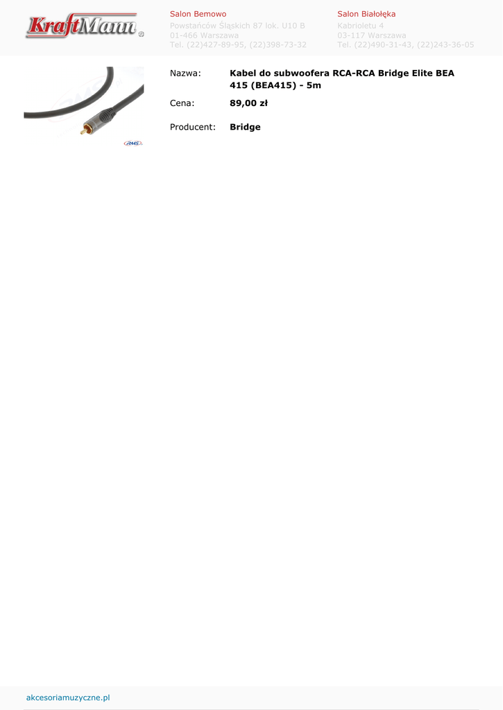 akcesoriamuzyczne.pl Salon Bemowo Salon Białołęka Powstańców Śląskich 87 lok. U10 B 01-466 Warszawa Tel. (22)427-89-95, (22)398-73-32 Kabrioletu 4 03-117 Warszawa Tel. (22)490-31-43, (22)243-36-05 Nazwa: Kabel do subwoofera RCA-RCA Bridge Elite BEA 415 (BEA415) - 5m Cena: 89,00 zł Producent: Bridge