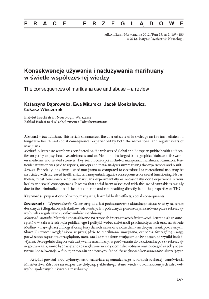 P R A C E P R Z E G L Ą D O W E Alkoholizm i Narkomania 2012, Tom 25, nr 2, 167–186 © 2012, Instytut Psychiatrii i Neurologii Konsekwencje używania i nadużywania marihuany w świetle współczesnej wiedzy The consequences of marijuana use and abuse – a review Katarzyna Dąbrowska, Ewa Miturska, Jacek Moskalewicz, Łukasz Wieczorek Instytut Psychiatrii i Neurologii, Warszawa Zakład Badań nad Alkoholizmem i Toksykomaniami Abstract – Introduction. This article summarizes the current state of knowledge on the immediate and long-term health and social consequences experienced by both the recreational and regular users of marijuana. Method. A literature search was conducted on the websites of global and European public health authori ties on policy on psychoactive substances, and on Medline – the largest bibliographic database in the world on medicine and related sciences. Key search concepts included marijuana, marihuana, cannabis. Particular attention was paid to reports, surveys and meta-analyses summarizing the experiences and results. Results. Especially long-term use of marijuana as compared to occasional or recreational use, may be associated with increased health risks, and may entail negative consequences for social functioning. Never theless, most consumers who use marijuana experimentally or occasionally don’t experience serious health and social consequences. It seems that social harm associated with the use of cannabis is mainly due to the criminalization of the phenomenon and not resulting directly from the properties of THC. Key words: preparations of hemp, marijuana, harmful health effects, social consequences Streszczenie – Wprowadzenie. Celem artykułu jest podsumowanie aktualnego stanu wiedzy na temat doraźnych i długofalowych skutków zdrowotnych i społecznych ponoszonych zarówno przez rekreacyjnych, jak i regularnych użytkowników marihuany. Materiał i metoda. Materiału poszukiwano na stronach internetowych światowych i europejskich autorytetów w zakresie zdrowia publicznego i polityki wobec substancji psychoaktywnych oraz na stronie Medline – największej bibliograficznej bazy danych na świecie z dziedziny medycyny i nauk pokrewnych. Słowa kluczowe uwzględnione w przeglądzie to marihuana, marijuana, cannabis. Szczególną uwagę poświęcono raportom, przeglądom, meta-analizom podsumowującym doświadczenia i wyniki badań. Wyniki. Szczególnie długotrwałe zażywanie marihuany, w porównaniu do okazjonalnego czy rekreacyj nego używania, może być związane ze zwiększonym ryzykiem zdrowotnym oraz pociągać za sobą negatywne konsekwencje w funkcjonowaniu społecznym. Jednakże większość konsumentów używających Artykuł powstał przy wykorzystaniu materiału zgromadzonego w ramach realizacji zamówienia Ministerstwa Zdrowia na ekspertyzę dotyczącą aktualnego stanu wiedzy o konsekwencjach zdrowotnych i społecznych używania marihuany. 167 Katarzyna Dąbrowska, Ewa Miturska, Jacek Moskalewicz, Łukasz Wieczorek marihuany eksperymentalnie lub okazjonalnie nie ponosi poważniejszych konsekwencji zdrowotnych i społecznych. Jak się wydaje szkody społeczne, związane z używaniem przetworów konopi, wynikają przede wszystkim z kryminalizacji zjawiska, a nie z właściwości THC. Słowa kluczowe: przetwory konopi, marihuana, szkody zdrowotne, konsekwencje społeczne WPROWADZENIE Marihuana jest terminem używanym na określenie substancji psychoaktywnej uzyskiwanej z liści konopi indyjskich (Cannabis sativa L.). Innym przetworem jest haszysz, który pozyskuje się z żywicy konopi. Przetwory konopi są produktami pochodzenia naturalnego, swoje działanie psychoaktywne zawdzięczają zawartości THC – tetrahydrokannabinolu. Przetwory konopi, wraz z alkoholem, tytoniem oraz kawą, stanowią najbardziej rozpowszechnione substancje psychoaktywne na świecie. Marihuana najczęściej jest palona w postaci ręcznie zwijanych papierosów, zwanych jointami, często miesza się ją z tytoniem; używa się także do przygotowania naparu oraz dodaje do jedzenia (1). Konopie dystrybuowane w Europie pochodzą głównie z zachodniej Afryki, rejonu Karaibów oraz z południowo-wschodniej Azji, chociaż uprawianie konopi indyjskich w Europie w celu pozyskania marihuany i haszyszu jest znacznie rozpowszechnione (2, 3). Konopie mają długą historię stosowania przez człowieka. Przez wieki były używane jako istotne źródło włókien do wyrobu tkanin, lin, sieci worków i ubrań, element wspomagający obrzędy religijne, lek ziołowy oraz środek odurzający (4). Haszysz pod koniec XIX wieku – zarówno w Europie, jak i Stanach Zjednoczonych – odgrywał znaczącą rolę w uśmierzaniu bólu, szczególnie migrenowego i miesiączkowego, ale także w leczeniu takich chorób, jak astma, krztusiec, bezsenność. W połowie XX w. zaprzestano stosowania konopi jako leku, ponieważ znalazły się na liście środków zakazanych, a także ze względu na rozwój medycyny i farmakoterapii oferujących leki o podobnych właściwościach (5). Według szacunków około 23 mln Europejczyków używało przetworów konopi w ostatnim roku, co stanowi 6,8% ludności w wieku od 15 do 64 lat. Około 12,5 mln Europejczyków używało tego narkotyku w ostatnim miesiącu (3,7% ludności w wieku od 15 do 64 lat). Konopi używają głównie osoby młode (od 15 do 34 lat), przy czym najwyższy wskaźnik używania występuje w grupie wiekowej od 15 do 24 lat (2). W 2008 r. Centrum Badania Opinii Społecznej (CBOS), na zlecenie Krajowego Biura ds. Przeciwdziałania Narkomanii, przeprowadziło badanie dotyczące używania substancji psychoaktywnych na próbie uczniów ostatnich klas szkoły ponadgimnazjalnej. Do używania marihuany przyznało się 30,5% polskiej młodzieży, w tym 16,4% używało jej w ciągu 12 miesięcy poprzedzających badanie, a 7,3% w ciągu 30 dni poprzedzających badanie (6). Jeżeli chodzi o dorosłych, to przetwory konopi należą do najbard