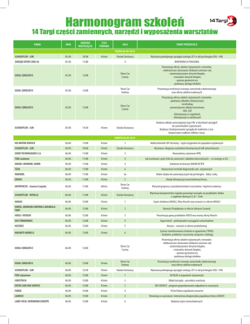 Harmonogram szkoleń 14 Targi części zamiennych, narzędzi i wyposażenia warsztatów DATA GODZINA ROZPOCZĘCIA CZAS TRWANIA SCHAEFFLER - LUK 05.09. 10:30 45min ZARZĄD INTER CARS SA 05.09. 11:00 FIRMA SALA TEMAT PREZENTACJI PIĄTEK 05.09.2014 Stoisko Dostawcy Wymiana podwójnego sprzęgła suchego 2CT w skrzyni biegów DSG –VW. 4 KONFERENCJA PRASOWA DZIAŁ SZKOLEŃ IC 05.09. 12:00 Show Car Czarny Prezentacja oferty szkoleń ciężarowych z tematów: - elektroniczne sterowanie silnikami common-rail, - zautomatyzawane skrzynie biegów, - manualne skrzynie biegów, - pomiar geometrii osi, - podstawy obsługi silników DZIAŁ SZKOLEŃ IC 05.09. 12:00 Show Car Srebrny Prezentacja możliwości nowego samochodu szkoleniowego oraz oferty szkoleń osobowych Show Car Czarny Prezentacja oferty szkoleń ciężarowych z tematów: - podstawy układów elektrycznych, - oscyloskop, - pneumatyczne układy hamulcowe, - EBS, ESP, - klimatyzacja w ciągnikach, - klimatyzacja w autobusach Stoisko Dostawcy Budowa układu samoregulacji typu TAC w dociskach sprzęgieł do samochodów ciężarowych. Budowa i funkcjonowanie sprzęgła do traktorów z tzw. bezpiecznym wałkiem odbioru mocy. DZIAŁ SZKOLEŃ IC 05.09. 13:00 SCHAEFFLER - LUK 05.09. 14:30 45min SOBOTA 06.09.2014 MS MOTOR SERVICE 06.09. 11:00 45min 1 Kolbenschmidt i BF Germany - części oryginalne do pojazdów użytkowych SCHAEFFLER - LUK 06.09. 10:00 45min Stoisko Dostawcy Wymiana i diagnoza uszkodzeń dwumasowych kół zamachowych. EXIDE TECHNOLOGIES S.A. 06.09. 11:00 45min 2 Akumulatory ciężarowe HVR. FEBI osobowe 06.09. 11:00 45min 4 Jak montować części Febi do zawieszeń i układów kierowniczych – co nowego w O.E. MANN+MUMMEL GMBH 06.09. 11:00 45min 3 Szkolenie techniczne MANN FILTER TEXA 06.09. 11:00 45min 6 Nowoczesne techniki diagnostyki sam. ciężarowych RAVENOL 06.09. 11:00 45min 4a Dobór olejów do automatycznych skrzyń biegów - fakty i mity DENSO 06.09. 11:00 45min 5 Ukady klimatyzacji samochodowej Denso. MOTOFOCUS - Joanna Czapska 06.09. 11:00 60min Show Car Srebrny Wywiad grupowy z przedstawicielami warsztatów. Segment osobowy. SCHAEFFLER - RUVILLE 06.09. 11:00 45min Stoisko Dostawcy Wymiana komponentów napędu pasowego rozrządu na przykładzie silnika o zapłonie iskrowym 2,0 l - Ford MAHLE 06.09. 12:00 45min 1 Części silnikowe MAHLE, filtry Knecht oraz nowości w ofercie MAHLE VARTA, JOHNSON CONTROLS AKUMULATORY 06.09. 12:00 45min 2 Nowości Produktowe w ofercie Johnson Controls HÜCO / HITACHI 06.09. 12:00 45min 3 Prezentacja gamy produktów HÜCO oraz nowej oferty Hitachi 4X4 TERENOWIEC 06.09. 12:00 45min 4 Superwinch - profesjonalne wyciągarki samochodowe NISSENS 06.09. 12:00 45min 5 Nissens - nowości w ofercie produktowej MAGNETI MARELLI 06.09. 12:00 45min 6 System monitorowania ciśnienia w ogumieniu (TPMS) - działanie, problemy i wyzwania związane z obsługą Show Car Czarny Prezentacja oferty szkoleń ciężarowych z tematów: - elektroniczne sterowanie silnikami common-rail, - zautomatyzawane skrzynie biegów, - manualne skrzynie biegów, - pomiar geometrii osi, - podstawy obsługi silników DZIAŁ SZKOLEŃ IC 06.09. 12:00 DZIAŁ SZKOLEŃ IC 06.09. 12:00 45min Show Car Srebrny Prezentacja możliwości nowego samochodu szkoleniowego oraz oferty szkoleń osobowych SCHAEFFLER - LUK 06.09. 12:30 45min Stoisko Dostawcy Wymiana podwójnego sprzęgła suchego 2CT w skrzyni biegów DSG –VW. FEBI ciężarowe 06.09. 13:00 45min 1 AD BLUE w pojazdach ciężarowych CONTITECH 06.09. 13:00 45min 2 Układ rozrządu - procedura wymiany INTER CARS BIO SERVICE 06.09. 13:00 45min 3 BIO SERVICE - program gospodarowania odpadami w warsztacie FEBER 06.09. 13:00 45min 4 10 lat Febera (spotkanie otwarte) LAUNCH 06.09. 13:00 45min 5 Rewolucja w warsztacie. Internetowa diagnostyka pojazdowa firmy LAUNCH LABO-TECH, INTERMEKO EUROPE 06.09. 13:00 45min 6 Badania części samochodowych FIRMA DATA GODZINA ROZPOCZĘCIA CZAS TRWANIA SALA TEMAT PREZENTACJI Show Car Czarny Prezentacja oferty szkoleń ciężarowych z tematów: - podstawy układów elektrycznych, - oscyloskop, - pneumatyczne układy hamulcowe, - EBS, ESP, - klimatyzacja w ciągnikach, - klimatyzacja w autobusach DZIAŁ SZKOLEŃ IC 06.09. 13:00 BOSCH 06.09. 14:00 45min 1 Zasada działania i diagnostyka przepływomierza HFM5 Bosch ATE 06.09. 14:00 45min 2 Serwisowanie współczesnych układów hamulcowych WAHLER 06.09. 14:00 45min 3 Wahler w nowoczesnych układach chłodzenia i recyrkulacji spalin Q-SERVICE TRUCK 06.09. 14:00 45min 4 15 lat sieci Q-Service Truck (spotkanie otwarte) SALERI 06.09. 14:00 45min 5 Technical evolution of the product: Variable water pumps SWAG 06.09. 14:00 45min 6 Nowoczesne układy rozrządu SWAG - łańcuchowe i paskowe MOTOFOCUS - Joanna Czapska 06.09. 14:00 60min Show Car Srebrny Wywiad grupowy z przedstawicielami warsztatów. Segment osobowy. SCHAEFFLER - INA 06.09. 14:00 45min Stoisko Dostawcy Wymiana komponentów napędu osprzętu silnika. SCHAEFFLER - RUVILLE 06.09. 14:45 45min Stoisko Dostawcy Wymiana komponentów napędu pasowego rozrządu na przykładzie silnika o zapłonie iskrowym 2,0 l - Ford SCHAEFFLER - FAG 06.09. 16:00 45min Stoisko Dostawcy Wymiana łożyska drugiej generacji w samochodach grupy VW z użyciem narzędzia specjalnego. SCHAEFFLER - LUK 07.09. 10:00 45min NIEDZIELA 07.09.2014 Stoisko Dostawcy Wymiana sprzęgła typu SAC z użyciem przyrządu specjalnego. BOSCH 07.09. 11:00 45min 1 Zasada działania i diagnostyka sondy lambda Bosch EXIDE TECHNOLOGIES S.A. 07.09. 11:00 45min 2 Carbon Boost - nowość w akumulatorach. MAHLE 07.09. 11:00 45min 3 Części silnikowe MAHLE, filtry Knecht oraz nowości w ofercie MAHLE FEBI osobowe 07.09. 11:00 45min 4 Jak montować części Febi do zawieszeń i układów kierowniczych – co nowego w O.E. DENSO 07.09. 11:00 45min 5 Układy klimatyzacji samochodowej DENSO TEXA 07.09. 11:00 45min 6 Nowoczesne techniki diagnostyki sam. ciężarowych VARTA, JOHNSON CONTROLS AKUMULATORY 07.09. 