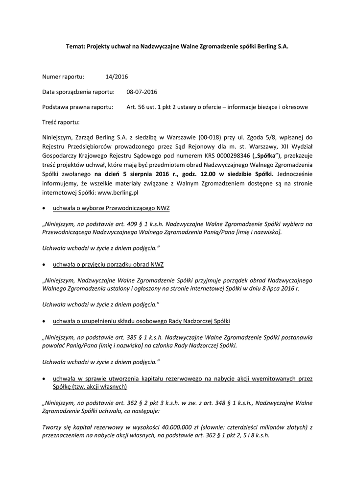 Temat: Projekty uchwał na Nadzwyczajne Walne Zgromadzenie spółki Berling S.A. Numer raportu: 14/2016 Data sporządzenia raportu: 08-07-2016 Podstawa prawna raportu: Art. 56 ust. 1 pkt 2 ustawy o ofercie – informacje bieżące i okresowe Treść raportu: Niniejszym, Zarząd Berling S.A. z siedzibą w Warszawie (00-018) przy ul. Zgoda 5/8, wpisanej do Rejestru Przedsiębiorców prowadzonego przez Sąd Rejonowy dla m. st. Warszawy, XII Wydział Gospodarczy Krajowego Rejestru Sądowego pod numerem KRS 0000298346 („Spółka”), przekazuje treść projektów uchwał, które mają być przedmiotem obrad Nadzwyczajnego Walnego Zgromadzenia Spółki zwołanego na dzień 5 sierpnia 2016 r., godz. 12.00 w siedzibie Spółki. Jednocześnie informujemy, że wszelkie materiały związane z Walnym Zgromadzeniem dostępne są na stronie internetowej Spółki: www.berling.pl uchwała o wyborze Przewodniczącego NWZ „Niniejszym, na podstawie art. 409 § 1 k.s.h. Nadzwyczajne Walne Zgromadzenie Spółki wybiera na Przewodniczącego Nadzwyczajnego Walnego Zgromadzenia Panią/Pana [imię i nazwisko]. Uchwała wchodzi w życie z dniem podjęcia.” uchwała o przyjęciu porządku obrad NWZ „Niniejszym, Nadzwyczajne Walne Zgromadzenie Spółki przyjmuje porządek obrad Nadzwyczajnego Walnego Zgromadzenia ustalony i ogłoszony na stronie internetowej Spółki w dniu 8 lipca 2016 r. Uchwała wchodzi w życie z dniem podjęcia.” uchwała o uzupełnieniu składu osobowego Rady Nadzorczej Spółki „Niniejszym, na podstawie art. 385 § 1 k.s.h. Nadzwyczajne Walne Zgromadzenie Spółki postanawia powołać Panią/Pana [imię i nazwisko] na członka Rady Nadzorczej Spółki. Uchwała wchodzi w życie z dniem podjęcia.” uchwała w sprawie utworzenia kapitału rezerwowego na nabycie akcji wyemitowanych przez Spółkę (tzw. akcji własnych) „Niniejszym, na podstawie art. 362 § 2 pkt 3 k.s.h. w zw. z art. 348 § 1 k.s.h., Nadzwyczajne Walne Zgromadzenie Spółki uchwala, co następuje: Tworzy się kapitał rezerwowy w wysokości 40.000.000 zł (słownie: czterdzieści milionów złotych) z przeznaczeniem na nabycie akcji własnych, na podstawie art. 362 § 1 pkt 2, 5 i 8 k.s.h. Utworzenie kapitału rezerwowego nastąpi poprzez przesunięcie kwoty 40.000.000 zł (słownie: czterdzieści milionów złotych) z kapitału zapasowego Spółki. Uchwała wchodzi w życie z dniem podjęcia.” uchwała w sprawie upoważnienia Zarządu Spółki do nabycia akcji wyemitowanych przez Spółkę (tzw. akcji własnych) „1. Niniejszym, na podstawie art. 362 § 1 pkt 2 k.s.h. Nadzwyczajne Walne Zgromadzenie upoważnia Zarząd Spółki do nabycia akcji wyemitowanych przez Spółkę (akcje własne), które mają być zaoferowane do nabycia pracownikom Spółki lub osobom, które były zatrudnione w Spółce lub w spółce z nią powiązanej przez okres co najmniej 3 lat. Akcje własne nabyte przez Spółkę w powyższym celu należy zaoferować pracownikom Spółki lub osobom, które były zatrudnione w Spółce lub w spółce z nią powiązanej przez okres co najmniej 3 lat, najpóźniej z upływem roku od dnia ich nabycia przez Spółkę. Spółka może nabyć jedynie akcje własne w pełni pokryte według następujących zasad: a) łączna wartość nominalna nabytych akcji własnych, wraz z akcjami własnymi wcześniej nabytymi nie może przekroczyć 20 % kapitału zakładowego Spółki, b) łączna cena nabycia akcji własnych, powiększona o koszty ich nabycia, nie może być wyższa od kapitału rezerwowego, utworzonego w tym celu zgodnie z uchwałą nr […] niniejszego Nadzwyczajnego Walnego Zgromadzenia. 2. Niniejszym, na podstawie art. 362 § 1 pkt 5 k.s.h. Nadzwyczajne Walne Zgromadzenie upoważnia Zarząd Spółki do nabycia akcji wyemitowanych przez Spółkę (akcje własne) w celu ich umorzenia. Spółka może nabyć jedynie akcje własne w pełni pokryte według następujących zasad: a) łączna wartość nominalna nabytych akcji własnych, wraz z akcjami własnymi wcześniej nabytymi nie może przekroczyć 40 % kapitału zakładowego Spółki, b) łączna cena nabycia akcji własnych, powiększona o koszty ich nabycia, nie może być wyższa od kapitału rezerwowego, utworzonego w tym celu zgodnie z uchwałą nr […] niniejszego Nadzwyczajnego Walnego Zgromadzenia. c) minimalna wysokość zapłaty za jedną akcję wynosić będzie 1,00 złoty (słownie: jeden złoty), a maksymalna wysokość zapłaty za jedną akcję wynosić będzie 8,00 złotych (słownie: osiem złotych), d) niniejsze upoważnienie do nabywania akcji własnych obejmuje okres od dnia 06.08.2016 r. do dnia 31.07.2021 r. e) akcje własne mogą zostać nabyte za pośrednictwem osób trzecich działających na rachunek Spółki oraz domów maklerskich. 3. Niniejszym, na podstawie art. 362 § 1 pkt 8 k.s.h. Nadzwyczajne Walne Zgromadzenie upoważnia Zarząd Spółki do nabycia akcji wyemitowanych przez Spółkę (akcje własne) w celu ich dalszej odsprzedaży. Spółka może nabyć jedynie akcje własne w pełni pokryte według następujących zasad: a) łączna wartość nominalna nabytych akcji własnych, wraz z akcjami własnymi wcześniej nabytymi nie może przekroczyć 20 % kapitału zakładowego Spółki, b) łączna cena nabycia akcji własnych, powiększona o koszty ich nabycia, nie może być wyższa od kapitału rezerwowego, utworzonego w tym celu zgodnie z uchwałą nr […] niniejszego Nadzwyczajnego Walnego Zgromadzenia. c) minimalna wysokość zapłaty za jedną akcję wynosić będzie 1,00 złoty (słownie: jeden złoty), a maksymalna wysokość zapłaty za jedną akcję wynosić będzie 8,00 złotych (słownie: osiem złotych), d) niniejsze upoważnienie do nabywania akcji własnych obejmuje okres od dnia 06.08.2016 r. do dnia 31.07.2021 r. e) akcje własne mogą zostać nabyte za pośrednictwem osób trzecich działających na rachunek Spółki oraz domów maklerskich. 4. Nadzwyczajne Walne Zgromadzenie zobowiązuje i