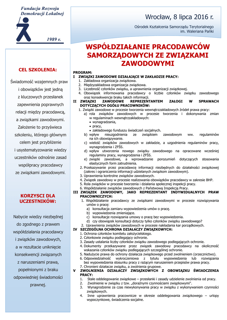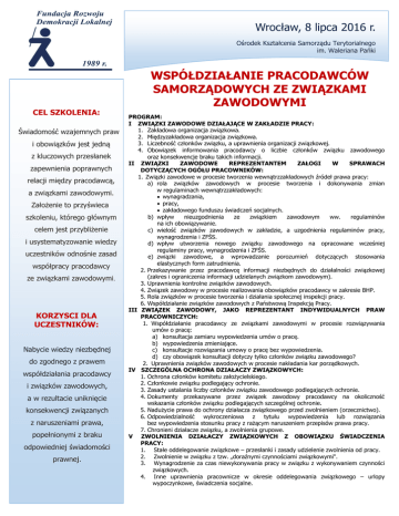 Rozwiązania informatyczne Wrocław, 8 lipca 2016 r. Ośrodek Kształcenia Samorządu Terytorialnego im. Waleriana Pańki CEL SZKOLENIA: Świadomość wzajemnych praw i obowiązków jest jedną z kluczowych przesłanek zapewnienia poprawnych relacji między pracodawcą, a związkami zawodowymi. Założenie to przyświeca szkoleniu, którego głównym celem jest przybliżenie i usystematyzowanie wiedzy uczestników odnośnie zasad współpracy pracodawcy ze związkami zawodowymi. KORZYSCI DLA UCZESTNIKÓW: Nabycie wiedzy niezbędnej do zgodnego z prawem współdziałania pracodawcy i związków zawodowych, a w rezultacie uniknięcie konsekwencji związanych z naruszeniami prawa, popełnionymi z braku odpowiedniej świadomości prawnej. WSPÓŁDZIAŁANIE PRACODAWCÓW SAMORZĄDOWYCH ZE ZWIĄZKAMI ZAWODOWYMI PROGRAM: I ZWIĄZKI ZAWODOWE DZIAŁAJĄCE W ZAKŁADZIE PRACY: 1. Zakładowa organizacja związkowa. 2. Międzyzakładowa organizacja związkowa. 3. Liczebność członków związku, a uprawnienia organizacji związkowej. 4. Obowiązek informowania pracodawcy o liczbie członków związku zawodowego oraz konsekwencje braku takich informacji. II ZWIĄZKI ZAWODOWE REPREZENTANTEM ZAŁOGI W SPRAWACH DOTYCZĄCYCH OGÓŁU PRACOWNIKÓW: 1. Związki zawodowe w procesie tworzenia wewnątrzzakładowych źródeł prawa pracy: a) rola związków zawodowych w procesie tworzenia i dokonywania zmian w regulaminach wewnątrzzakładowych: wynagradzania, pracy, zakładowego funduszu świadczeń socjalnych. b) wpływ nieuzgodnienia ze związkiem zawodowym ww. regulaminów na ich obowiązywanie. c) wielość związków zawodowych w zakładzie, a uzgodnienia regulaminów pracy, wynagrodzenia i ZFŚS. d) wpływ utworzenia nowego związku zawodowego na opracowane wcześniej regulaminy pracy, wynagrodzenia i ZFŚS. e) związki zawodowe, a wprowadzanie porozumień dotyczących stosowania elastycznych form zatrudnienia. 2. Przekazywanie przez pracodawcę informacji niezbędnych do działalności związkowej (zakres i ograniczenia informacji udzielanych związkom zawodowym). 3. Uprawnienia kontrolne związków zawodowych. 4. Związek zawodowy w procesie realizowania obowiązków pracodawcy w zakresie BHP. 5. Rola związków w procesie tworzenia i działania społecznej inspekcji pracy. 6. Współdziałanie związków zawodowych z Państwową Inspekcją Pracy. III ZWIĄZEK ZAWODOWY, JAKO REPREZENTANT INDYWIDUALNYCH PRAW PRACOWNICZYCH: 1. Współdziałanie pracodawcy ze związkami zawodowymi w procesie rozwiązywania umów o pracę: a) konsultacja zamiaru wypowiedzenia umów o pracę. b) wypowiedzenia zmieniające. c) konsultacje rozwiązania umowy o pracę bez wypowiedzenia. d) czy obowiązek konsultacji dotyczy tylko członków związku zawodowego? 2. Uprawnienia związków zawodowych w procesie nakładania kar porządkowych. IV SZCZEGÓLNA OCHRONA DZIAŁACZY ZWIĄZKOWYCH: 1. Ochrona członków komitetu założycielskiego. 2. Członkowie związku podlegający ochronie. 3. Zasady ustalania liczby członków związku zawodowego podlegających ochronie. 4. Dokumenty przekazywane przez związek zawodowy pracodawcy na okoliczność wskazania członków związku podlegających szczególnej ochronie. 5. Nadużycie prawa do ochrony działacza związkowego przed zwolnieniem (orzecznictwo). 6. Odpowiedzialność wykroczeniowa z tytułu wypowiedzenia lub rozwiązania bez wypowiedzenia stosunku pracy z rażącym naruszeniem przepisów prawa pracy. 7. Chronieni działacze związku, a zwolnienia grupowe. V ZWOLNIENIA DZIAŁACZY ZWIĄZKOWYCH Z OBOWIĄZKU ŚWIADCZENIA PRACY: 1. Stałe oddelegowanie związkowe – przesłanki i zasady udzielenie zwolnienia od pracy. 2. Zwolnienie w związku z tzw. „doraźnymi czynnościami związkowymi". 3. Wynagrodzenie za czas niewykonywania pracy w związku z wykonywaniem czynności związkowych. 4. Inne uprawnienia pracownicze w okresie oddelegowania związkowego – urlopy wypoczynkowe, świadczenia socjalne. ADRESACI SZKOLENIA : Kierownicy urzędów, Osoby zarządzające samorządowymi jednostkami organizacyjnymi, pracownicy działów kadr i BHP, mający w zakresie swoich obowiązków współpracę z organizacjami związkowymi. Funkcyjni członkowie organizacji związkowych. DANE DO KONTAKTU: Ośrodek Kształcenia Samorządu Terytorialnego im. Waleriana Pańki 40-014 Katowice ul. Mariacka 1 NIP: 522-000-18-95 VI TECHNICZNE ASPEKTY WSPÓŁDZIAŁANIA PRACODAWCY ZE ZWIĄZKIEM ZAWODOWYM – ZAPEWNIENIE ZWIĄZKOWI POMIESZCZEŃ I URZĄDZEŃ TECHNICZNYCH NA POTRZEBY PROWADZENIA DZIAŁALNOŚCI ZWIĄZKOWEJ: 1. Umowa, jako sposób realizowania obowiązku zapewnienia pomieszczeń i urządzeń technicznych. 2. Warunki ww. umowy – czy może ona być odpłatna? VII NIEPRZESTRZEGANIE PRZEPISÓW USTAWY O ZWIĄZKACH ZAWODOWYCH: 1. Zasady odpowiedzialności związku zawodowego. 2. Zasady odpowiedzialności pracodawcy. 3. W jakim trybie możliwe jest wyciąganie konsekwencji prawnych w stosunku do osób naruszających przepisy ustawy o związkach zawodowych. 4. Możliwość kontrolowania przestrzegania ustawy o związkach zawodowych przez organy kontrolne np. Państwową Inspekcję pracy. MIEJSCE SZKOLENIA: Wrocław, siedziba Ośrodka, ul. Piłsudskiego 49 – 57, III piętro Mapkę dojazdu do miejsca szkolenia znajdą Państwo na www.okst.pl/dojazd TERMIN SZKOLENIA: 8 lipca 2016 r., godz. 10.00 – 15.00. Tel 32 259 86 73, 32 253 84 09 Fax. 32 259 86 73 w. 22, 26 e-mail: [email protected] www.okst.pl OSOBA DO KONTAKTU: Renata Bąk tel. 32 206 80 39, 32 253 63 77 w.24 [email protected] KOD SZKOLENIA CENA: 329 zł netto/os. Udział w szkoleniu zwolniony z VAT w przypadku finansowania szkolenia ze środków publicznych. Cena zawiera materiały szkoleniowe, zaświadczenie o ukończeniu szkolenia, poczęstunek i serwis kawowy. ZGŁOSZENIA: Wypełnioną kartę zgłoszenia należy przesłać mailem, faksem lub za pośrednictwem strony internetowej www.okst.pl do 5 lipca 2016 r. Wrocław 749/16D/B Nazwa nabywcy (d