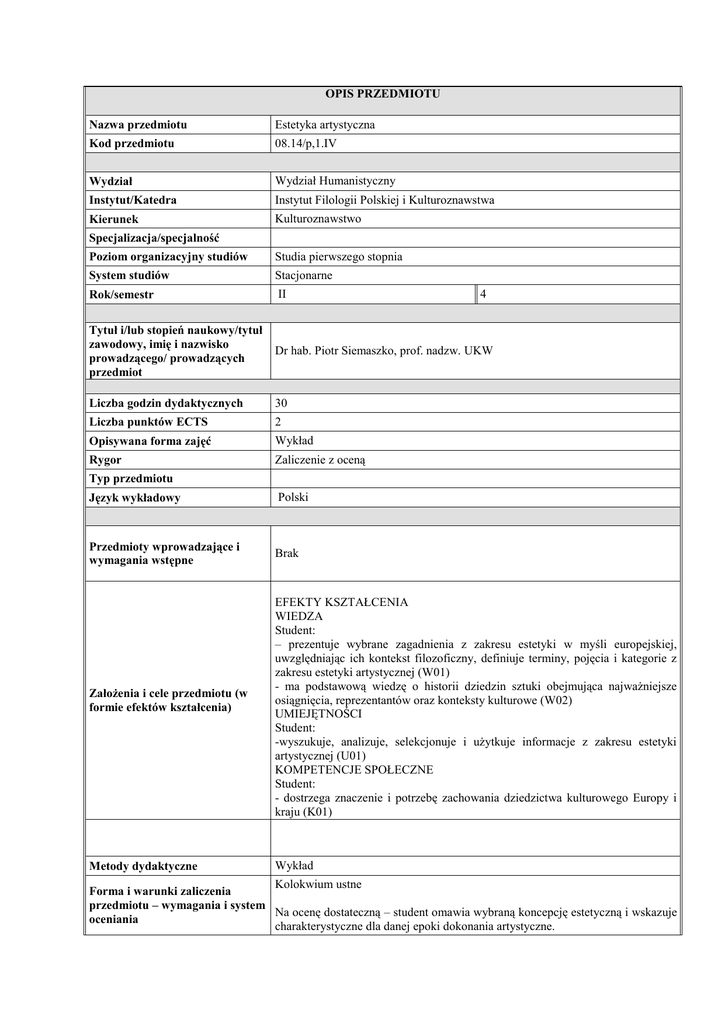 Estetyka artystyczna - Instytut Filologii Plskiej Kulturoznawstwa