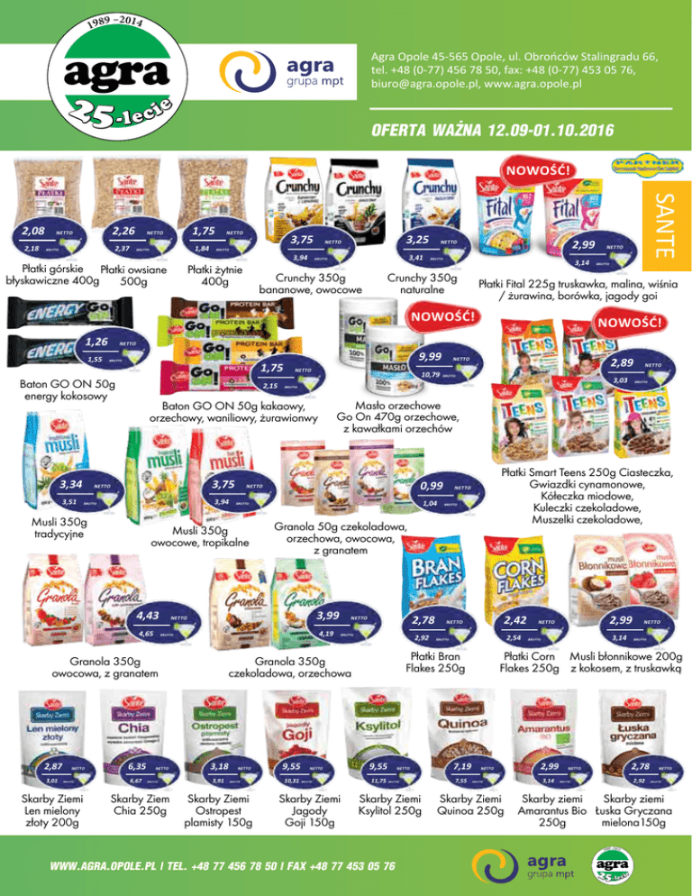9 –20 1 4 198 agra Agra Opole 45-565 Opole, ul. Obrońców Stalingradu 66, tel. +48 (0-77) 456 78 50, fax: +48 (0-77) 453 05 76, [email protected], www.agra.opole.pl 2 5 -lecie oferta ważna 12.09-01.10.2016 nowość! 2,18 2,26 netto 2,37 brutto 1,75 netto 1,84 brutto netto 3,75 3,94 Płatki górskie Płatki owsiane błyskawiczne 400g 500g 3,25 netto 2,99 netto brutto Płatki żytnie 400g 3,41 brutto Crunchy 350g bananowe, owocowe brutto 3,14 Crunchy 350g naturalne 1,55 3,51 brutto 1,75 2,15 3,75 netto 3,94 brutto 4,65 netto Skarby Ziemi Len mielony złoty 200g nowość! 6,35 6,67 netto 1,04 brutto Skarby Ziem Chia 250g 2,78 netto brutto 2,92 netto Skarby Ziemi Ostropest plamisty 150g netto brutto 9,55 10,31 netto brutto Skarby Ziemi Jagody Goji 150g 2,42 netto 2,54 brutto Płatki Bran Flakes 250g Granola 350g czekoladowa, orzechowa brutto netto brutto Płatki Smart Teens 250g Ciasteczka, Gwiazdki cynamonowe, Kółeczka miodowe, Kuleczki czekoladowe, Muszelki czekoladowe, Granola 50g czekoladowa, orzechowa, owocowa, z granatem 4,19 3,91 3,03 Masło orzechowe Go On 470g orzechowe, z kawałkami orzechów 3,99 3,18 brutto 0,99 brutto brutto 2,89 netto brutto netto Granola 350g owocowa, z granatem brutto 10,79 netto Musli 350g owocowe, tropikalne 4,43 3,01 9,99 netto Baton GO ON 50g kakaowy, orzechowy, waniliowy, żurawionwy Musli 350g tradycyjne 2,87 brutto netto Baton GO ON 50g energy kokosowy 3,34 netto Płatki Fital 225g truskawka, malina, wiśnia / żurawina, borówka, jagody goi nowość! 1,26 sante 2,08 9,55 11,75 netto brutto Skarby Ziemi Ksylitol 250g 7,19 7,55 2,99 netto 3,14 brutto brutto Płatki Corn Musli błonnikowe 200g Flakes 250g z kokosem, z truskawką netto brutto Skarby Ziemi Quinoa 250g 2,99 3,14 2,78 netto 2,92 brutto netto brutto Skarby ziemi Skarby ziemi Amarantus Bio Łuska Gryczana 250g mielona150g 9 – 20 1 4 198 WWW.AGRA.OPOLE.PL | TEL. +48 77 456 78 50 | FAX +48 77 453 05 76 netto agra 2 5 -lecie HORTEX hit cenowy! 3,09 3,24 netto 3,39 2,59 netto netto 2,55 netto brutto 3,56 Karton 1L Banan, Grapefruit, Multiwitamina sok 2,72 brutto Karton 1L Wiśnia, Wieloowocowy, Wielowarzywny, Pomidor, Pomidor pikantny, Mandarynka sok 2,68 brutto Karton 1L Jabłko, Czarna Porzeczka hit cenowy! brutto Karton 1L Barszcz Czerwony sok hit cenowy! hit cenowy! 3,59 3,77 3,19 netto 3,35 brutto 3,39 netto 3,56 brutto 2,39 2,51 Karton 1L Grapefruit rubin, Złote Jabłka, Jabłko-Gruszka sok Karton 1L Pomarańczowy, Pomarańcza-Grejpfrut sok Karton 1L Ananas sok netto 2,59 netto netto brutto 2,72 brutto Karton Witaminka 1L marchew hit cenowy! brutto Karton Witaminka 1L asortyment hit cenowy! 1,29 1,35 netto 0,82 0,86 Leon saszetka 0,2L asortyment 2,79 2,93 netto 3,49 3,66 brutto 2,69 brutto Kartonik Leon napój 0,2L asortyment netto brutto 3,09 3,24 brutto hit cenowy! Butelka 1.75L asortyment 1,49 1,56 brutto hit cenowy! netto 2,29 netto brutto Napój 0.5L butelka asortyment 1,89 netto netto brutto Kartonik Scooby Doo 0.2L soki 100% asortyment hit cenowy! netto Leon butelka 0,33L asortyment brutto Karton Costa 2L asortyment 2,40 Butelka nektar 1L Butelka nektar 1L Czarna Porzeczka, Jabłko Pomarańcza, Multiwitamina 3,03 1,14 netto brutto 0,86 netto 2,82 hit cenowy! netto 0,82 2,89 1,09 netto brutto 1,39 1,71 1,98 brutto Napój Białe Winogrona 1L netto brutto LEON Aqua 0.5L asortyment brutto Napój karton 1L asortyment 1,59 1,67 netto brutto LEON Active 0.5L asortyment 0,89 0,93 agra 2 5 -lecie brutto Butelka Witaminka 0.25L asortyment 2,39 2,51 netto brutto Butelka LEON 0.9L asortyment 9 –20 1 4 198 2 netto WWW.AGRA.OPOLE.PL | TEL. +48 77 456 78 50 | FAX +48 77 453 05 76 nowość! 2,04 3,25 netto 3,51 brutto Daktyle 150g 2,73 netto 2,95 brutto Śliwki suszone 120g 1,55 netto 1,67 brutto Żurawina suszona 100g 4,24 4,58 3,55 brutto Fit 120g Vital, Woman, Active, Man 1,87 brutto netto brutto Mix sałatkowy z orzeszkami pini 100g netto brutto Buraczki suszone, warzywa suszone 80g Rodzynki sułtańskie 100g 3,29 netto 1,73 netto prima food 1,89 3,74 4,04 5,49 netto 5,93 brutto Płatki migdałowe 50g netto brutto Migdały kalifornijskie 80g 0,65 0,80 0,72 netto 0,89 brutto Czekolada do picia 20*25g saszetki: classic, banan, pomarańcz, wiśnia 0,76 netto 0,93 brutto 5,19 netto 6,38 brutto Wafel mleczno-orzech.z płatkami pełnoziarnistymi, wafel mlecz.-czekol. z wiórkami kokosowymi 25g Wafel mlecznoorzechowy 25g kruger nowość! netto brutto Kakao Mix Fit 375g tuba 4,82 43,49 53,49 4,92 netto 5,31 netto 4,92 6,05 4,29 netto 4,63 4,29 netto 5,28 netto 5,21 netto brutto Witamina musująca Krem kakowy z orzechami laskowymi 350g, Magnez Forte 84g Krem kakaowo-orzechowy 400g, Witamina musująca Cukierki Fritt 30*70g kakaowo-bananowy 400g, truskawkowy 350g krem o smaku kakaowo-mlecznym 350g Magnez Skurcz 80g brutto 0,76 0,93 netto brutto Cukierki Fritt 20*35g brutto brutto 2,22 2,73 brutto 0,91 netto 1,12 brutto Czekolada Schogetten 100g asortyment Czekolada Schogetten 33g asortyment netto brutto 2,19 2,37 netto brutto brutto Herbatynka 300g zielona, multiwitamina, brzoskwinia-mango, jabłko -gruszka 9 – 20 1 4 198 WWW.AGRA.OPOLE.PL | TEL. +48 77 456 78 50 | FAX +48 77 453 05 76 agra 2 5 -lecie 3 aGA HOLTEX 2,23 2,41 4,31 brutto Żurawina suszona 80g 1,03 1,11 1,29 1,35 brutto 1,21 1,29 1,35 brutto 1,65 1,11 1,37 0,95 brutto netto Ciastka Oreo 44g 1,17 netto brutto Owoce Goji 50g 3,49 3,77 brutto 2,59 netto 2,80 brutto Migdały ciete płatki 50g netto brutto Śliwka kalifornijska 120g 2,93 netto 3,60 brutto Ciastka Belvita 50g 5 zbóż, kakaowe, musli, orzech i miód netto 3,12 brutto Siemię lniane 200g brutto 2,89 netto Popcorn solony, maślany 90g netto netto Prince Polo 50g XXL classic, Orzechowe, Mleczne, Kokosowe 1,34 1,29 brutto Sezam łuskany 90g 0,98 1,23 netto Mieszanka studencka z żurawiną 150g netto Płatki kokosowe 50g mondelez 3,99 netto netto brutto Ciastka Łakotki 168g deserowe, kakaowe, kokosowe, maślane netto 1,99 brutto 2,45 Halls 32-45g asortyment netto brutto Cze