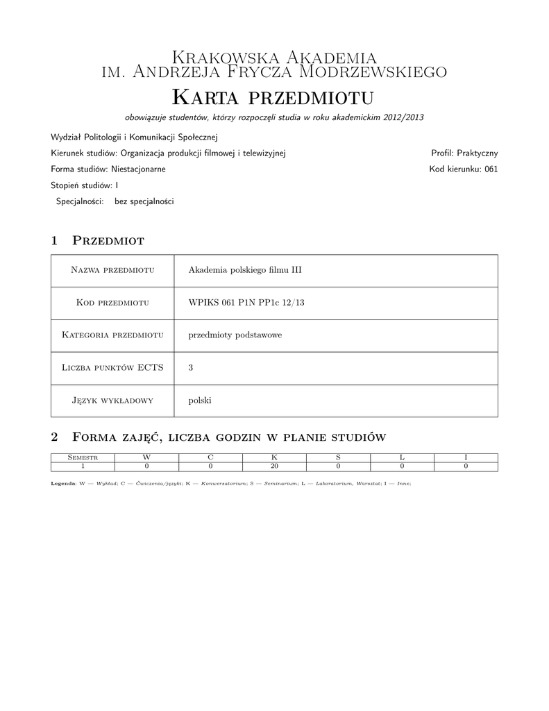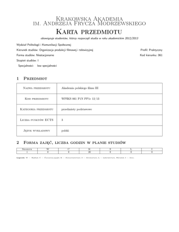 Karta przedmiotu - Krakowska Akademia im Andrzeja Frycza
