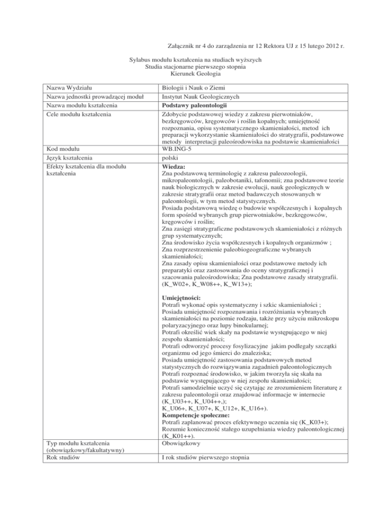Zał cznik nr 4 do zarz dzenia nr 12 Rektora UJ z 15 lutego 2012 r. Sylabus modułu kształcenia na studiach wy szych Studia stacjonarne pierwszego stopnia Kierunek Geologia Nazwa Wydziału Nazwa jednostki prowadz cej moduł Nazwa modułu kształcenia Cele modułu kształcenia Kod modułu J zyk kształcenia Efekty kształcenia dla modułu kształcenia Typ modułu kształcenia (obowi zkowy/fakultatywny) Rok studiów Biologii i Nauk o Ziemi Instytut Nauk Geologicznych Podstawy paleontologii Zdobycie podstawowej wiedzy z zakresu pierwotniaków, bezkr gowców, kr gowców i ro lin kopalnych; umiej tno rozpoznania, opisu systematycznego skamieniało ci, metod ich preparacji wykorzystanie skamieniało ci do stratygrafii, podstawowe metody interpretacji paleo rodowiska na podstawie skamieniało ci WB.ING-5 polski Wiedza: Zna podstawow terminologi z zakresu paleozoologii, mikropaleontologii, paleobotaniki, tafonomii; zna podstawowe teorie nauk biologicznych w zakresie ewolucji, nauk geologicznych w zakresie stratygrafii oraz metod badawczych stosowanych w paleontologii, w tym metod statystycznych. Posiada podstawow wiedz o budowie współczesnych i kopalnych form spo ród wybranych grup pierwotniaków, bezkr gowców, kr gowców i ro lin; Zna zasi gi stratygraficzne podstawowych skamieniało ci z ró nych grup systematycznych; Zna rodowisko ycia współczesnych i kopalnych organizmów ; Zna rozprzestrzenienie paleobiogeograficzne wybranych skamieniało ci; Zna zasady opisu skamieniało ci oraz podstawowe metody ich preparatyki oraz zastosowania do oceny stratygraficznej i szacowania paleo rodowiska; Zna podstawowe zasady stratygrafii. (K_W02+, K_W08++, K_W13+); Umiej tno ci: Potrafi wykona opis systematyczny i szkic skamieniało ci ; Posiada umiej tno rozpoznawania i rozró niania wybranych skamieniało ci na poziomie rodzaju, tak e przy u yciu mikroskopu polaryzacyjnego oraz lupy binokularnej; Potrafi okre li wiek skały na podstawie wyst puj cego w niej zespołu skamieniało ci; Potrafi odtworzy procesy fosylizacyjne jakim podlegały szcz tki organizmu od jego mierci do znaleziska; Posiada umiej tno zastosowania podstawowych metod statystycznych do rozwi zywania zagadnie paleontologicznych Potrafi rozpozna rodowisko, w jakim tworzyła si skała na podstawie wyst puj cego w niej zespołu skamieniało ci; Potrafi samodzielnie uczy si czytaj c ze zrozumieniem literatur z zakresu paleontologii oraz znajdowa informacje w internecie (K_U03++, K_U04++,); K_U06+, K_U07+, K_U12+, K_U16+). Kompetencje społeczne: Potrafi zaplanowa proces efektywnego uczenia si (K_K03+); Rozumie konieczno stałego uzupełniania wiedzy paleontologicznej (K_K01++). Obowi zkowy I rok studiów pierwszego stopnia Semestr Imi i nazwisko osoby/osób prowadz cych moduł Imi i nazwisko osoby/osób egzaminuj cej/egzaminuj cych b d udzielaj cej zaliczenia, w przypadku gdy nie jest to osoba prowadz ca dany moduł Sposób realizacji Wymagania wst pne i dodatkowe Rodzaj i liczba godzin zaj dydaktycznych wymagaj cych bezpo redniego udziału nauczyciela akademickiego i studentów, gdy w danym module przewidziane s takie zaj cia Liczba punktów ECTS przypisana modułowi Bilans punktów ECTS Stosowane metody dydaktyczne Metody sprawdzania i kryteria oceny efektów kształcenia uzyskanych przez studentów Forma i warunki zaliczenia modułu, w tym zasady dopuszczenia do egzaminu, zaliczenia, a tak e forma i warunki zaliczenia poszczególnych zaj wchodz cych w zakres danego modułu Tre ci modułu kształcenia Wykaz literatury podstawowej zimowy Prof. dr hab. M. Adam Gasi ski dr Michał Stachacz i doktoranci – wiczenia Prof. dr hab. M. Adam Gasi ski Wykłady: 2 godz. tygodniowo w semestrze zimowym przez 15 tygodni wiczenia: 2 godz. tygodniowo w semestrze zimowym przez 15 tygodni Wiedza z biologii na poziomie liceum 30 godzin wykładu – obecno nieobowi zkowa, zalecana 30 godzin wicze – obecno obowi zkowa 4 ECTS Aktywno Nakład pracy Udział w wykładach 30 h Udział w wiczeniach 30 h Samodzielne studiowanie zaleconej literatury 10 h Uzupełnienie zada poleconych na wiczeniach 10 h Konsultacje praktyczne 10 h Przygotowanie si do egzaminu 30h Suma 120 h Wykłady teoretyczne w formie prezentacji multimedialnych. wiczenia kameralne, podczas których student opisuje i analizuje skamieniało ci z kolekcji muzealnej, zapoznaje si z literatur paleontologiczn w j zyku polskim i angielskim, wykonuje zadania z zakresu tafonomii, analizy rodowiska na podstawie skamieniało ci, stratygrafii oraz podstawowych metod statystycznych wykorzystywanych w paleontologii Umiej tno ci oraz kompetencje personalne i społeczne sprawdzane s na podstawie wykonywanych na wiczeniach zada praktycznych; Kolokwia oraz egzamin pisemny sprawdza zakładany poziom wiedzy; Na zaliczenie modułu składaj si : zaliczenie wicze i zdanie egzaminu pisemnego. Zaliczenie wicze odbywa si na podstawie wykonywanych na wiczeniach zada praktycznych oraz wiedzy z zakresu tematyki wicze . Do egzaminu s dopuszczone osoby posiadaj ce zaliczenie z wicze . Do zaliczenia wicze i egzaminu na ocen dostateczn wymagane jest osi gni cie 60% wymaga Historia paleontologii. Pocz tki ycia na Ziemi.,Rola skamieniało ci w ocenie wieku badanych skał, porz dkowaniu zapisu skalnego. Zasady systematyki i nomenklatury paleontologicznej. Mikropaleontologia: zakres bada , podstawowe mikroskamieniało ci. Paleozoologia bezkr gowców: g bki, koralowce, mi czaki, stawonogi, czułkowce, szkarłupnie, półstrunowce: systematyka, paleoekologia, procesy tafonomiczne. Podstawowe wiadomo ci z zakresu paleozoologii kr gowców. Podstawowe wiadomo ci z paleobotaniki. Literatura podstawowa: i uzupełniaj cej, obowi zuj cej do zaliczenia danego modułu Wymiar, zasady i forma odbywania praktyk, w przypadku, gdy program kształcenia przewiduje praktyki Lehmann U & Hilmer G., 1987. Bezkr gowce kopalne. Wydawnictwa Geologiczne, Warszawa. Bieda F., 1966. Paleozoologia. T. 1, 2. Wydawnictwa Geologiczne, Warszawa. Literatura uzupe