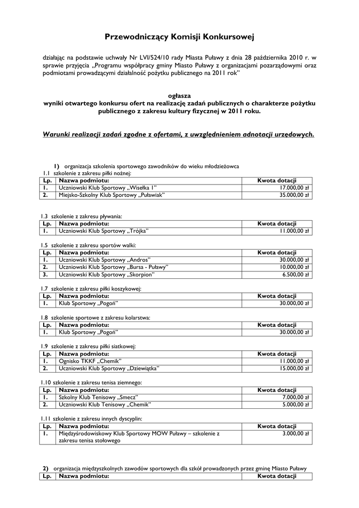 Przewodniczący Komisji Konkursowej działając na podstawie uchwały Nr LVI/524/10 rady Miasta Puławy z dnia 28 października 2010 r. w sprawie przyjęcia „Programu współpracy gminy Miasto Puławy z organizacjami pozarządowymi oraz podmiotami prowadzącymi działalność poŜytku publicznego na 2011 rok” ogłasza wyniki otwartego konkursu ofert na realizację zadań publicznych o charakterze poŜytku publicznego z zakresu kultury fizycznej w 2011 roku. Warunki realizacji zadań zgodne z ofertami, z uwzględnieniem adnotacji urzędowych. 1) organizacja szkolenia sportowego zawodników do wieku młodzieŜowca 1.1 szkolenie z zakresu piłki noŜnej: Lp. Nazwa podmiotu: 1. Uczniowski Klub Sportowy „Wisełka 1” 2. Miejsko-Szkolny Klub Sportowy „Puławiak” Kwota dotacji 17.000,00 zł 35.000,00 zł 1.3 szkolenie z zakresu pływania: Lp. Nazwa podmiotu: 1. Uczniowski Klub Sportowy „Trójka” Kwota dotacji 11.000,00 zł 1.5 szkolenie z zakresu sportów walki: Lp. Nazwa podmiotu: 1. Uczniowski Klub Sportowy „Andros” 2. Uczniowski Klub Sportowy „Bursa - Puławy” 3. Uczniowski Klub Sportowy „Skorpion” Kwota dotacji 30.000,00 zł 10.000,00 zł 6.500,00 zł 1.7 szkolenie z zakresu piłki koszykowej: Lp. Nazwa podmiotu: 1. Klub Sportowy „Pogoń” Kwota dotacji 30.000,00 zł 1.8 szkolenie sportowe z zakresu kolarstwa: Lp. Nazwa podmiotu: 1. Klub Sportowy „Pogoń” Kwota dotacji 30.000,00 zł 1.9 szkolenie z zakresu piłki siatkowej: Lp. Nazwa podmiotu: 1. Ognisko TKKF „Chemik” 2. Uczniowski Klub Sportowy „Dziewiątka” Kwota dotacji 11.000,00 zł 15.000,00 zł 1.10 szkolenie z zakresu tenisa ziemnego: Lp. Nazwa podmiotu: 1. Szkolny Klub Tenisowy „Smecz” 2. Uczniowski Klub Tenisowy „Chemik” Kwota dotacji 7.000,00 zł 5.000,00 zł 1.11 szkolenie z zakresu innych dyscyplin: Lp. Nazwa podmiotu: 1. Międzyśrodowiskowy Klub Sportowy MOW Puławy – szkolenie z zakresu tenisa stołowego Kwota dotacji 3.000,00 zł 2) organizacja międzyszkolnych zawodów sportowych dla szkół prowadzonych przez gminę Miasto Puławy Lp. Nazwa podmiotu: Kwota dotacji 1. Puławski Szkolny Związek Sportowy 21.000,00 zł 3) organizacja współpracy sportowej z miastami partnerskimi poprzez m.in. organizację zawodów z ich przedstawicielami i udział w zawodach wyjazdowych Lp. Nazwa podmiotu: Kwota dotacji 1. Uczniowski Klub Sportowy „Olympic” 15.000,00 zł 4) organizacja cyklicznych zawodów sportowo-rekreacyjnych Lp. Nazwa podmiotu: 1. Puławskie Towarzystwo Krzewienia Kultury Fizycznej 2. Puławskie Stowarzyszenie Tenisowe SYBILLA – turniej tenisowy PST „SYBILLA” o statuetkę Bekhend KsięŜnej Izabelli 3. Uczniowski Klub Sportowy „Olympic” V MłodzieŜowy Turniej Piłki NoŜnej 6-osobowej „Olympic Cup 2011” 4. Międzyśrodowiskowy Klub Sportowy MOW Puławy – organizacja międzyszkolnej druŜynowej ligi tenisa stołowego 5. Uczniowski Klub Sportowy „Bursa – Puławy” – II Ogólnopolski Turniej Piłki Ręcznej Dzieci o Puchar Prezydenta Miasta Puławy 6. Uczniowski Klub Sportowy „Bursa – Puławy” – I Wiosenny Puławski turniej Piłki Ręcznej Dziewcząt i Chłopców w kategorii młodzik i junior młodszy 5) organizacja Mistrzostw Puław w wybranych dyscyplinach sportowych Lp. Nazwa podmiotu: 1. Puławskie Towarzystwo Krzewienia Kultury Fizycznej 2. Uczniowski Klub Sportowy „Bursa – Puławy” – VI Mistrzostwa w Karate Tradycyjnym o Puchar Wisły 3. Uczniowski Klub Sportowy „Andros” – Otwarte Mistrzostwa Puław w Taekwondo Olimpijskim 4. KS „Azoty-Puławy” Otwarte Mistrzostwa Puław w Piłce Ręcznej 5. Puławskie Stowarzyszenie Tenisowe Sybilla – Mistrzostwa Puław o Puchar Prezydenta Miasta w tenisie ziemnym amatorów w grze pojedynczej 6. Szkolny Klub Tenisowy „Smecz” - Amatorskie Mistrzostwa Puław tenisie ziemnym 7. Puławskie Towarzystwo Siatkarskie „Elita” – Mistrzostwa Puław w PlaŜowej Piłce Siatkowej 6) organizacja akcji „Wakacje na sportowo” Lp. Nazwa podmiotu: 1. Puławskie Towarzystwo Krzewienia Kultury Fizycznej 2. Stowarzyszenie RODZINA – ferie zimowe „Turniej – Zostań Olimpijczykiem” 3. Uczniowski Klub Sportowy Bursa – Puławy: II Zimowa Akademia Piłki Ręcznej 4. Uczniowski Klub Sportowy „Olympic” – III MłodzieŜowy Turniej halowej piłki noŜnej pięcioosobowej 5. Uczniowski Klub Sportowy ANDROS – ferie i wakacje na sportowo z Taekwondo Olimpijskim 7) organizacja zawodów sportowo-rekreacyjnych rozgrywanych w formie lig Lp. Nazwa podmiotu: 1. Puławskie Towarzystwo Krzewienia Kultury Fizycznej 2. Puławskie Towarzystwo Siatkarskie „Elita” – organizacja rozgrywek Puławskiej Amatorskiej Ligi Piłki Siatkowej 3. Puławskie Stowarzyszenie Tenisowe SYBILLA – organizacja rozgrywek puławskiej ligi tenisowej – singlowej (PLT) 4. Uczniowski Klub Sportowy BURSA – PUŁAWY – II Puławska Liga Piłki Ręcznej Dziewcząt i Chłopców Szkół Podstawowych i Gimnazjalnych Kwota dotacji 6.800,00 zł 700,00 zł 500,00 zł 1.000,00 zł 2.000,00 zł 2.000,00 zł Kwota dotacji 9.500,00 zł 2.000,00 zł 2.000,00 zł 4.000,00 zł 500,00 zł 1.000,00 zł 1.000,00 zł Kwota dotacji 12.500,00 zł 2.000,00 zł 1.500,00 zł 500,00 zł 1.500,00 zł Kwota dotacji 12.000,00 zł 2.000,00 zł 2.000,00 zł 2.000,00 zł 8) prowadzenie ogólnodostępnej wypoŜyczalni sprzętu sportowo-rekreacyjnego Lp. Nazwa podmiotu: 1. Puławskie Towarzystwo Krzewienia Kultury Fizycznej Kwota dotacji 31.000,00 zł 9) organizacja rajdów pieszych Lp. Nazwa podmiotu: 1. ZHP Komenda Hufca Puławy – organizacja rajdów pieszych 2. PTTK Zarząd Oddziału Puławskiego Kwota dotacji 7.000,00 zł 3.000,00 zł 10) organizacja biegów uliczno-przełajowych w ramach Grand Prix Polski Środkowo-Wschodniej Lp. Nazwa podmiotu: Kwota dotacji 1. Puławskie Towarzystwo Krzewienia Kultury Fizycznej 9.000,00 zł 11) Wspieranie rozwoju sportu osób niepełnosprawnych Lp. Nazwa podmiotu: 1. Puławska Fundacja Osób Niepeł