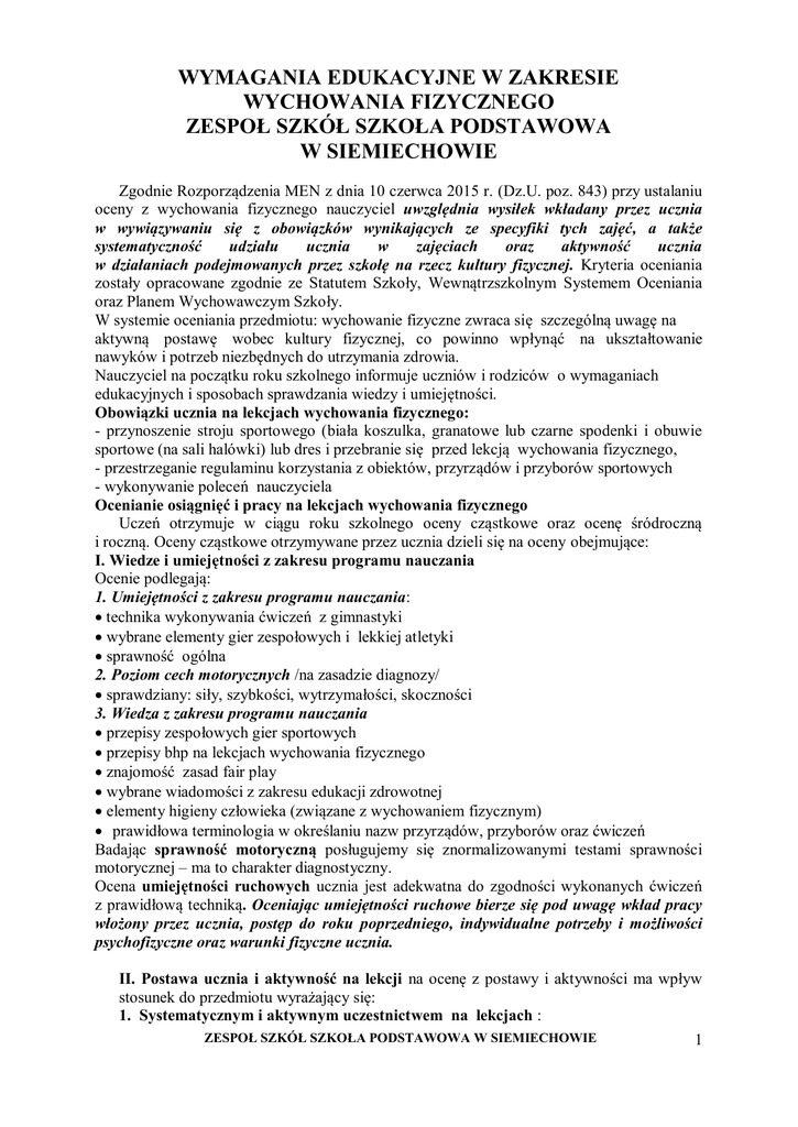WYMAGANIA EDUKACYJNE W ZAKRESIE WYCHOWANIA FIZYCZNEGO ZESPOŁ SZKÓŁ SZKOŁA PODSTAWOWA W SIEMIECHOWIE Zgodnie Rozporządzenia MEN z dnia 10 czerwca 2015 r. (Dz.U. poz. 843) przy ustalaniu oceny z wychowania fizycznego nauczyciel uwzględnia wysiłek wkładany przez ucznia w wywiązywaniu się z obowiązków wynikających ze specyfiki tych zajęć, a także systematyczność udziału ucznia w zajęciach oraz aktywność ucznia w działaniach podejmowanych przez szkołę na rzecz kultury fizycznej. Kryteria oceniania zostały opracowane zgodnie ze Statutem Szkoły, Wewnątrzszkolnym Systemem Oceniania oraz Planem Wychowawczym Szkoły. W systemie oceniania przedmiotu: wychowanie fizyczne zwraca się szczególną uwagę na aktywną postawę wobec kultury fizycznej, co powinno wpłynąć na ukształtowanie nawyków i potrzeb niezbędnych do utrzymania zdrowia. Nauczyciel na początku roku szkolnego informuje uczniów i rodziców o wymaganiach edukacyjnych i sposobach sprawdzania wiedzy i umiejętności. Obowiązki ucznia na lekcjach wychowania fizycznego: - przynoszenie stroju sportowego (biała koszulka, granatowe lub czarne spodenki i obuwie sportowe (na sali halówki) lub dres i przebranie się przed lekcją wychowania fizycznego, - przestrzeganie regulaminu korzystania z obiektów, przyrządów i przyborów sportowych - wykonywanie poleceń nauczyciela Ocenianie osiągnięć i pracy na lekcjach wychowania fizycznego Uczeń otrzymuje w ciągu roku szkolnego oceny cząstkowe oraz ocenę śródroczną i roczną. Oceny cząstkowe otrzymywane przez ucznia dzieli się na oceny obejmujące: I. Wiedze i umiejętności z zakresu programu nauczania Ocenie podlegają: 1. Umiejętności z zakresu programu nauczania: technika wykonywania ćwiczeń z gimnastyki wybrane elementy gier zespołowych i lekkiej atletyki sprawność ogólna 2. Poziom cech motorycznych /na zasadzie diagnozy/ sprawdziany: siły, szybkości, wytrzymałości, skoczności 3. Wiedza z zakresu programu nauczania przepisy zespołowych gier sportowych przepisy bhp na lekcjach wychowania fizycznego znajomość zasad fair play wybrane wiadomości z zakresu edukacji zdrowotnej elementy higieny człowieka (związane z wychowaniem fizycznym) prawidłowa terminologia w określaniu nazw przyrządów, przyborów oraz ćwiczeń Badając sprawność motoryczną posługujemy się znormalizowanymi testami sprawności motorycznej – ma to charakter diagnostyczny. Ocena umiejętności ruchowych ucznia jest adekwatna do zgodności wykonanych ćwiczeń z prawidłową techniką. Oceniając umiejętności ruchowe bierze się pod uwagę wkład pracy włożony przez ucznia, postęp do roku poprzedniego, indywidualne potrzeby i możliwości psychofizyczne oraz warunki fizyczne ucznia. II. Postawa ucznia i aktywność na lekcji na ocenę z postawy i aktywności ma wpływ stosunek do przedmiotu wyrażający się: 1. Systematycznym i aktywnym uczestnictwem na lekcjach : ZESPOŁ SZKÓŁ SZKOŁA PODSTAWOWA W SIEMIECHOWIE 1 Ocenia się aktywność i zaangażowanie ucznia w procesie rozwijania własnej sprawności w czasie lekcji. Uczeń może otrzymać: ocenę pozytywną (motywującą) za systematyczne, aktywne, bez zastrzeżeń nauczyciela uczestnictwo na lekcjach, a także za pomoc nauczycielowi (np. pokaz, przeprowadzenie rozgrzewki, propozycje ciekawych rozwiązań dotyczących tematu lekcji); 2. Przygotowaniem do lekcji - uczeń dwa razy w semestrze może zgłosić nieprzygotowanie do lekcji z powodu braku stroju lub złego samopoczucia. Za każde kolejne, nieusprawiedliwione nieprzygotowanie uczeń otrzyma ocenę niedostateczną. - dodatkowo dziewczęta mają możliwość nie ćwiczenia z powodu niedyspozycji. III. Aktywność pozalekcyjna Uczeń może być gratyfikowany oceną bardzo dobrą lub celującą za udział w zajęciach pozalekcyjnych i reprezentowanie szkoły w zawodach sportowych objętych kalendarzem SZS, osiągając wysokie wyniki sportowe. Uczeń zawsze może zgłosić nauczycielowi, chwilową niedyspozycje i taki przypadek rozpatrywany jest indywidualnie. W uzasadnionych przypadkach uczeń może być zwolniony na czas określony z zajęć wychowania fizycznego. Decyzją o zwolnieniu ucznia z zajęć wychowania fizycznego podejmuje Dyrektor Szkoły na podstawie podania rodziców i zwolnienia lekarskiego. W przypadku zwolnienia ucznia z ćwiczeń w dokumentacji przebiegu nauczania zamiast oceny wpisuje się ”zwolniony” albo „zwolniona” . Jeśli uczeń ma tylko w drugim okresie zwolnienie to na świadectwie piszemy „ zwolniony”. Wymagania edukacyjne na poszczególne oceny, nauczyciel określa każdorazowo przed rozpoczęciem sprawdzianu po uwzględnieniu możliwości i poziomu grupy oraz indywidualnych potrzeb i możliwości uczniów. Uczeń ma możliwość poprawy oceny po wcześniejszym uzgodnieniu terminu z nauczycielem prowadzącym. WYMAGANIA FIZYCZNEGO NA POSZCZEGÓLNE OCENY Z WYCHOWANIA Ocena celująca: Uczeń spełnia wszystkie wymagania na ocenę bdb ● regularnie bierze udział w lekcjach wychowania fizycznego, jest aktywny podczas lekcji, chętnie i z zaangażowaniem wykonuje powierzone mu zadania ● aktywnie uczestniczy w życiu sportowym na terenie szkoły lub też w innych formach działalności związanych z kulturą fizyczną ● godnie reprezentuje szkołę w zawodach, zajmując punktowane miejsca, ● zawsze posiada właściwy strój, dostosowany do wymogów lekcji wf i ustaleń nauczyciela ● swoją postawą społeczną i stosunkiem do przedmiotu nie budzi zastrzeżeń ● posiada prawidłowe nawyki higieniczno-zdrowotne ● szanuje i dba o szkolny sprzęt sportowy i potrafi wykorzystywać go zgodnie z przeznaczeniem wykazuje się bardzo dobrą znajomością przepisów gier sportowych i umiejętnością pomocy przy ich organizacji systematycznie bierze aktywny udział w zajęciach pozalekcyjnych, ZESPOŁ SZKÓŁ SZKOŁA PODSTAWOWA W SIEMIECHOWIE 2 bierze udział w zawodach sportowych na szczeblu gminy, powi