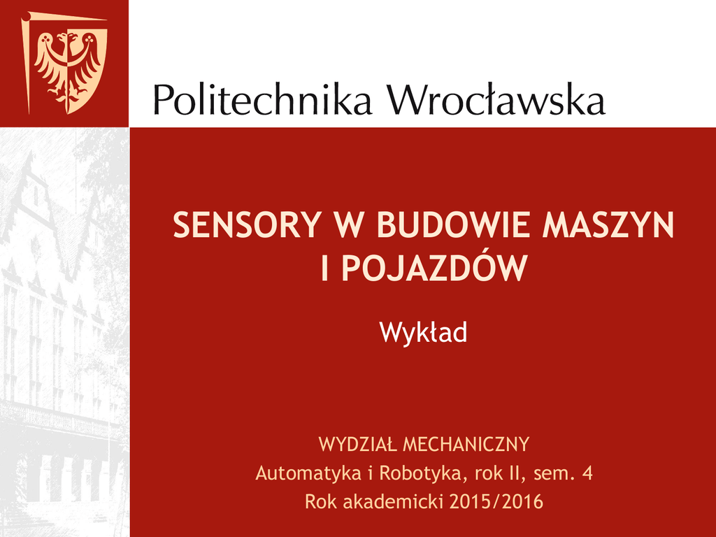 SENSORY W BUDOWIE MASZYN I POJAZDÓW Wykład WYDZIAŁ MECHANICZNY Automatyka i Robotyka, rok II, sem. 4 Rok akademicki 2015/2016 Fizyczne zasady działania sensorów – elementy oporowe Przy pomiarach wielkości nieelektrycznych metodą oporową wykorzystuje się zjawiska występujące w przewodnikach stałych, półprzewodnikach oraz elektrolitach. Opór elektryczny wyraża się: R=(t)l/s gdzie: •(t)-opór właściwy [ m2/m] •l-długość [m] •s-przekrój [m2]. Fizyczne zasady działania sensorów – elementy oporowe cd. Pomiar polega na wykorzystaniu zależności oporu elektrycznego elementu przetwarzającego, bezpośrednio od wielkości mierzonej lub innej wielkości od niej w określony sposób zależnej. Wielkość mierzona może być związana z następującymi wielkościami, wpływającymi na wartość oporu danego elementu: •oporem właściwym , •długością elementu l, •oporem składowym szeregowego połączenia dwóch oporów stanowiących w sumie całkowity opór elementu. W technice pomiarowej wykorzystuje się bezpośrednie zależności oporu właściwego od temperatury i siły przyłożonej do elementu, długości l od przesunięcia liniowego lub kątowego. Fizyczne zasady działania sensorów – elementy oporowe • Elementy oporowe potencjometryczne • Elementy oporowe termometryczne a. metalowe (Pt100, Pt1000, Cu100, Ni100) b. półprzewodnikowe (termistory: NTC, PTC, CTR) • Elementy fotooporowe • Elementy oporowe tensometryczne Elementy oporowe potencjometryczne Schemat oporowego dzielnika napięcia •l – długość dzielnika •x – długość części dołączonej do zacisków wejściowych •r2 – opór części dołączonej do zacisków wyjściowych •r1 – opór pozostałej części dzielnika •U – napięcie zasilania •a, b – zaciski wyjściowe Elementy oporowe potencjometryczne cd. Sposoby realizacji przetworników potencjometrycznych liniowych: • ze wzdłużnym ruchem suwaka • z obrotowym ruchem suwaka • nawijane na karkasie zwijanym lub wygiętym Elementy oporowe potencjometryczne cd. Sposoby realizacji przetworników potencjometrycznych nieliniowych: • • • • nawijane ze zmiennym skokiem nawijane na karkasie profilowym nawijane na karkasie krzywoliniowym o stałym przekroju ze zbocznikowaną częścią potencjometru Elementy oporowe potencjometryczne cd. Charakterystyka potencjometru Charakterystyka napięcia wyjściowego z uwzględnieniem schodkowatości Elementy oporowe potencjometryczne cd. Zakres mierzonych przemieszczeń: • do 1000(2000) mm – przetworniki liniowe • 0 - 360 - przetworniki kątowe jednoobrotowe • do 10 x 360 - przetworniki kątowe wieloobrotowe Zakres liniowości: od 0,1%. Sensory w pojazdach Przetworniki potencjometryczne Sensory w pojazdach Przetworniki potencjometryczne Sensory w pojazdach Przetworniki potencjometryczne Sensory w pojazdach Przetworniki potencjometryczne Sensory w pojazdach Przetworniki potencjometryczne Sensory w pojazdach Przetworniki potencjometryczne Sensory w pojazdach Przetworniki potencjometryczne Sensory w pojazdach Przetworniki potencjometryczne Elementy oporowe termometryczne Elementy wykonane z materiału, którego opór zmienia się istotnie jako funkcja temperatury: R f R •metalowe •półprzewodnikowe Elementy oporowe termometryczne metalowe Zmiany temperatury można opisać równaniem: R R0 1 a1 a2 ... an 2 n R - rezystancja w temperaturze C R0 - rezystancja w temperaturze 0C a1, ...an - stałe Liczba współczynników zależy od materiału, zakresu temperatur i wymaganej dokładności. Najczęściej stosowane materiały to platyna, miedź, nikiel. Elementy oporowe termometryczne metalowe cd. Metale wykazują najczęściej wzrost oporności ze wzrostem temperatury Oznaczenia: Pt100 Pt500 Pt1000 Cu100 Ni100 Elementy oporowe termometryczne metalowe cd. Duże dokładności przetworników metalowych są uwarunkowane: •wysoką czystością materiałów •starzeniem •konstrukcją mechaniczną zapewniającą brak naprężeń mechanicznych Dokładności pomiaru mogą sięgać 0,001C (specjalne układy mostkowe w termometrach laboratoryjnych). W zastosowaniach przemysłowych stosuje się elementy klasy 0,5-1(2-rzadziej). Elementy oporowe termometryczne metalowe cd. Przy pomiarach precyzyjnych (dokładność większa niż 1%) poniżej 20 C stosuje się mostki elektroniczne prądu stałego lub zmiennego równoważone automatycznie. Przy pomiarach powyżej 10 C i dokładności 1% stosuje się mostki niezrównoważone z miliwoltomierzem na wyjściu. Elementy oporowe termometryczne metalowe cd. Elementy oporowe termometryczne metalowe cd. Elementy oporowe termometryczne metalowe cd. Czujniki kablowe Budowa czujnika głowicowego: 1-element pomiarowy, 2-osłona (np. ceramiczna), 3-głowica, 4-materiał izolacyjny, 5-osłona metalowa) Termometr oporowy kątowy zatrzaskowy Elementy oporowe termometryczne półprzewodnikowe (termistory) Termistorami nazywa się półprzewodnikowe rezystory odznaczające się tym, że ich rezystancja bardzo silnie zmienia się w miarę wzrostu temperatury. Rozróżnia się następujące grupy termistorów: •o ujemnym temperaturowym współczynniku rezystancji – termistory NTC (ang. negativ temperature coefficient), •o dodatnim temperaturowym współczynniku rezystancji – termistory PTC (ang. positive temperature coefficient), •o skokowej zmianie rezystancji – termistory CTR (ang. critical temperature resistor). NTC PTC Elementy oporowe termometryczne półprzewodnikowe (termistory) Zależność rezystancji termistorów od temperatury: 1-termistor NTC, 2-termistor PTC, 3- termistor CTR Elementy oporowe termometryczne półprzewodnikowe (termistory) Termoelementy termistorowe, ze względu na dużą wartość temperaturowego współczynnika rezystancji w porównaniu z metalami, pozwalają na konstruowanie czujników znacznie czulszych od metalowych. Zaletami termistorów są również: •małe wymiary, •mała bezwładno
