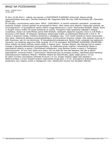 Zespół Szkół Ekonomicznych im. Gen. Stefana Roweckiego "Grota" w Opolu BRĄZ NA POŻEGNANIE Autor: Izabela Tkocz 16.06.2014. W dniu 10.06.2014 r. odbyły się zawody w SIATKÓWCE PLAŻOWEJ dziewcząt. Naszą szkołę reprezentowały dwie pary: Dorota Szelwach 4B i Dagmara Wilk 4B oraz Lidia Murlowska 2B i Dominika Staisz 1G. Po zaciętej i wyrównanej walce para: WILK - SZELWACH i w swoich ostatnich zawodach wywalczyła brązowe medale. Sukces jednak nie przyszedł im łatwo. Obie nasze pary fatalnie rozpoczęły zawody, bo od przegranych. O szczególnym pechu mówić mogą dziewczyny z pary: Murlowska – Staisz, które w drugim meczu trafiły na swoje koleżanki ze szkoły. Przegrany tego spotkania odpadał z dalszej rywalizacji. Awans do ćwierćfinału parze Wilk – Szelwach zapewnił wygrany mecz w 1/8 finału z drużyną z LO5 Opole. W kolejnym spotkaniu dziewczęta trafiły na późniejsze Mistrzynie z PLO II. W meczu o brązowy medal, mieliśmy powtórkę z ubiegłego roku. Tym razem jednak to nasze dziewczęta były górą i dosłownie „wyszarpały” przeciwnikowi brązowy medal. Oba zespoły miały po 2 piłki meczowe, ale ich nie skończyły. W konsekwencji podopieczne Janiny Ficek wykazały się stalowymi nerwami i po świetnej zagrywce Wilk wygrały 19:17.W zawodach SIATKÓWKI PLAŻOWEJ CHŁOPCÓW, które odbyły się dzień później udział wzięły 2 męskie pary: Tomasz Wójcik, dla którego był to ostatni występ w barwach Ekonomika (przypomnijmy, że zdobywał tytuły mistrza i wicemistrza Opola w poprzednich latach) w parze z Dominikiem Arbeiterem, oraz Bartosz Gowin w parze z Tomaszem Juszczyszynem. W tym roku plaża przy placu róż nie była dla nas tak łaskawa, tak jak w latach poprzednich. drużyna Gowin / Juszczyszyn zakończyła grę na drugiej rundzie, natomiast para bardziej doświadczonych siatkarzy Wójcik / Arbeiter dotarli do ćwierćfinału, gdzie ulegli parze z VI LO. W całym turnieju zwycięstwo odniosła drużyna z II LO, drugie miejsce zajęli nasi sąsiedzi z Elektryczniaka, a trzeci stopień podium opanowała druga para z II LO. Zwycięzcom gratulujemy, a my postaramy się o lepszy wynik w następnym roku. Opiekunem drużyn był Jarosław Ułamek. http://ekonomik.opole.pl/www2 Kreator PDF Utworzono 6 March, 2017, 22:18