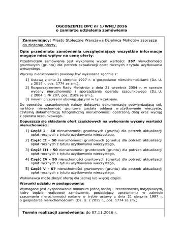 OGŁOSZENIE DPC nr 1/WNI/2016 o zamiarze udzielenia zamówienia Zamawiający: Miasto Stołeczne Warszawa Dzielnica Mokotów zaprasza do złożenia oferty. Opis przedmiotu zamówienia uwzględniający wszystkie informacje mogące mieć wpływ na cenę oferty: Przedmiotem zamówienia jest wykonanie wycen wartości: 257 nieruchomości gruntowych (gruntu) dla potrzeb aktualizacji opłat rocznych z tytułu użytkowania wieczystego. Wyceny nieruchomości powinny być wykonane zgodnie z: 1) Ustawą z dnia 21 sierpnia 1997 r. o gospodarce nieruchomościami (Dz. U. z 2015 r. poz. 1774 ze zm.), 2) Rozporządzeniem Rady Ministrów z dnia 21 września 2004 r. w sprawie wyceny nieruchomości i sporządzania operatu z 2004 r. Nr 207, poz. 2109 ze zm.), 3) innymi przepisami obowiązującymi w tym zakresie. szacunkowego (Dz. U. Do operatów szacunkowych należy dołączyć: dokumentację potwierdzającą cel, na który nieruchomość gruntowa została oddana w użytkowanie wieczyste, czytelną dokumentację fotograficzną nieruchomości opatrzoną datą oraz wyciąg z operatu szacunkowego. Dopuszcza się składanie ofert częściowych na wykonanie wyceny wartości nieruchomości: 1) Część I - 50 nieruchomości gruntowych (gruntu) dla potrzeb aktualizacji opłat rocznych z tytułu użytkowania wieczystego, 2) Część II - 50 nieruchomości gruntowych (gruntu) dla potrzeb aktualizacji opłat rocznych z tytułu użytkowania wieczystego, 3) Część III - 50 nieruchomości gruntowych (gruntu) dla potrzeb aktualizacji opłat rocznych z tytułu użytkowania wieczystego, 4) Część IV - 50 nieruchomości gruntowych (gruntu) dla potrzeb aktualizacji opłat rocznych z tytułu użytkowania wieczystego, 5) Część V - 57 nieruchomości gruntowych (gruntu) dla potrzeb aktualizacji opłat rocznych z tytułu użytkowania wieczystego. Wykonawca może złożyć ofertę dla jednej lub więcej części. Warunki udziału w postępowaniu: Wymagane jest dysponowanie minimum jedną osobą – rzeczoznawcą majątkowym, który będzie realizował zamówienie, posiadający uprawnienia w zakresie szacowania nieruchomości nadane w trybie ustawy z dnia 21 sierpnia 1997 r. o gospodarce nieruchomościami (Dz. U. z 2015 r., poz. 1774 ze zm.). Termin realizacji zamówienia: do 07.11.2016 r. Kryterium/kryteria oceny ofert: cena 100 % Termin składania ofert: do 18.10.2016 r. Termin związania ofertą: do 01.11.2016 r. Oferty można składać: faksem, nr faksu: 22 56 51 627 drogą elektroniczną na adres: [email protected] pisemnie na adres: Miasto Stołeczne Warszawa Dzielnica Mokotów ul. Rakowiecka 25/27, 02-517 Warszawa, pok. Nr 327 Oferta będzie rozpatrywana przez Zamawiającego, jeżeli Zamawiający otrzyma ją przed terminem składania ofert określonym w Ogłoszeniu. Komórka organizacyjna Urzędu Dzielnicy Mokotów m.st. Warszawy realizująca wydatek: Wydział Nieruchomości Osoba do kontaktu: Milena Królik tel. : 22 56 51 574 Informacje dodatkowe: 1. Zamawiający będzie rozpatrywał oferty złożone zgodnie z Ogłoszeniem. 2. Zamawiający udzieli zamówienia Wykonawcy, którego oferta zostanie wybrana jako najkorzystniejsza. 3. Niezwłocznie po rozpatrzeniu ofert Zamawiający informuje na stronie internetowej Urzędu, na której zostało zamieszczone Ogłoszenie, o wyborze najkorzystniejszej oferty lub o unieważnieniu postępowania. 4. Zamawiający zastrzega sobie prawo do zmiany Ogłoszenia bez podania przyczyn. 5. Zamawiający zastrzega sobie prawo odwołania Ogłoszenia w każdym czasie bez podawania przyczyn. 6. W sprawach nieujętych w Ogłoszeniu mają zastosowanie przepisy kodeksu cywilnego. Załączniki 1. wzór umowy* NACZELNIK WYDZIAŁU NIERUCHOMOŚCI dla DZIELNICY MOKOTÓW /-/ Anna Urbanek 10.10.2016 r. ..................................................... data, podpis i pieczęć Kierownika komórki realizującej wniosek Załącznik do Ogłoszenia OFERTA – CZĘŚĆ I Składający ofertę: (wpisać dane adresowe i kontaktowe) ……………………………………………………………………………………………………… ……………………………………………………………………………………………………… ………………………………………………………………………………….………………… Odpowiadając na Ogłoszenie dotyczące zamówienia: wykonanie wycen wartości 50 nieruchomości gruntowych (gruntu) dla potrzeb aktualizacji opłat rocznych z tytułu użytkowania wieczystego oferuję wykonanie zamówienia za cenę brutto....................................... zł. (słownie: ……………………………………………………………………………………) Oświadczam, że pan/ pani ………………………………………… Imię i nazwisko osoby – rzeczoznawcy będzie realizowała zamówienie i posiada uprawnienia nr …………. w zakresie szacowania nieruchomości. Ponadto oświadczam, że zobowiązuję się w przypadku wyboru mojej oferty jako najkorzystniejszej, wykonać zamówienie na zasadach określonych w Ogłoszeniu o zamiarze udzielenia zamówienia oraz zobowiązuję się do zawarcia umowy w miejscu i terminie wskazanym przez Zamawiającego. Załączniki ( o ile były wymagane) 1 ……………… 2……………… ............................................... data i podpis osoby składającej ofertę OFERTA – CZĘŚĆ II Składający ofertę: (wpisać dane adresowe i kontaktowe) ……………………………………………………………………………………………………… ……………………………………………………………………………………………………… ………………………………………………………………………………….………………… Odpowiadając na Ogłoszenie dotyczące zamówienia: wykonanie wycen wartości 50 nieruchomości gruntowych (gruntu) dla potrzeb aktualizacji opłat roc