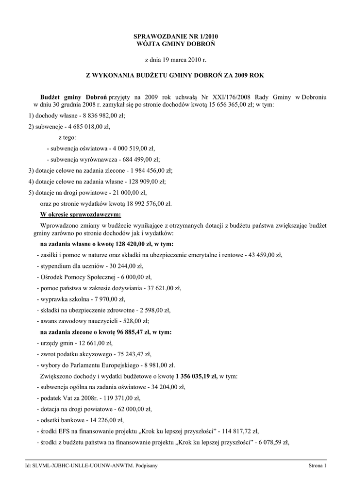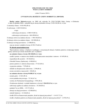 SPRAWOZDANIE NR 1/2010 WÓJTA GMINY DOBROŃ z dnia 19 marca 2010 r. Z WYKONANIA BUDŻETU GMINY DOBROŃ ZA 2009 ROK Budżet gminy Dobroń przyjęty na 2009 rok uchwałą Nr XXI/176/2008 Rady Gminy w Dobroniu w dniu 30 grudnia 2008 r. zamykał się po stronie dochodów kwotą 15 656 365,00 zł; w tym: 1) dochody własne - 8 836 982,00 zł; 2) subwencje - 4 685 018,00 zł, z tego: - subwencja oświatowa - 4 000 519,00 zł, - subwencja wyrównawcza - 684 499,00 zł; 3) dotacje celowe na zadania zlecone - 1 984 456,00 zł; 4) dotacje celowe na zadania własne - 128 909,00 zł; 5) dotacje na drogi powiatowe - 21 000,00 zł, oraz po stronie wydatków kwotą 18 992 576,00 zł. W okresie sprawozdawczym: Wprowadzono zmiany w budżecie wynikające z otrzymanych dotacji z budżetu państwa zwiększając budżet gminy zarówno po stronie dochodów jak i wydatków: na zadania własne o kwotę 128 420,00 zł, w tym: - zasiłki i pomoc w naturze oraz składki na ubezpieczenie emerytalne i rentowe - 43 459,00 zł, - stypendium dla uczniów - 30 244,00 zł, - Ośrodek Pomocy Społecznej - 6 000,00 zł, - pomoc państwa w zakresie dożywiania - 37 621,00 zł, - wyprawka szkolna - 7 970,00 zł, - składki na ubezpieczenie zdrowotne - 2 598,00 zł, - awans zawodowy nauczycieli - 528,00 zł; na zadania zlecone o kwotę 96 885,47 zł, w tym: - urzędy gmin - 12 661,00 zł, - zwrot podatku akcyzowego - 75 243,47 zł, - wybory do Parlamentu Europejskiego - 8 981,00 zł. Zwiększono dochody i wydatki budżetowe o kwotę 1 356 035,19 zł, w tym: - subwencja ogólna na zadania oświatowe - 34 204,00 zł, - podatek Vat za 2008r. - 119 371,00 zł, - dotacja na drogi powiatowe - 62 000,00 zł, - odsetki bankowe - 14 226,00 zł, - środki EFS na finansowanie projektu „Krok ku lepszej przyszłości” - 114 817,72 zł, - środki z budżetu państwa na finansowanie projektu „Krok ku lepszej przyszłości” - 6 078,59 zł, Id: SLVML-XJBHC-UNLLE-UOUNW-ANWTM. Podpisany Strona 1 - środki z EFS na finansowanie projektu: „ Górą Dobroniacy - Dni Dobronia 2009” - 42 071,43 zł, - środki z budżetu państwa na finansowanie projektu: „Górą Dobroniacy – Dni Dobronia 2009" - 7 424,37 zł, - wpływy za wieczyste użytkowanie gruntów - 16 188,33 zł, - wpływy z opłat planistycznych i adiacenckich - 15 900,00 zł, - darowizny na budowę wodociągów i kanalizacji - 152 900,00 zł, - odpłatność za usługi opiekuńcze - 6 370,00 zł, - prowizja z PZU dla przedszkola - 483,75 zł, - Środki z Funduszu Rozwoju Kultury Fizycznej na zadanie inwestycyjne- „Budowa sali gimnastycznej z zapleczem socjalno – sanitarnym i łącznikiem przy Zespole Szkół im. Ks. Jana Długosza w Dobroniu” 764 000,00 zł. Zmniejszono dochody i wydatki o kwotę 67 842,00 zł: - zasiłki i pomoc w naturze oraz składki na ubezpieczenie emerytalne i rentowe - 44 409,00 zł, - wpływy z podatku dochodowego od osób fizycznych - 149,00 zł, - świadczenia rodzinne, zaliczka alimentacyjna oraz składki na ubezpieczenie emerytalne i rentowe z ubezpieczenia społecznego - 20 082,00 zł, - składki na ubezpieczenie zdrowotne - 3 202,00 zł. Zwiększono przychody z zaciągniętych pożyczek i kredytów na rynku krajowym z przeznaczeniem na pokrycie wydatków 186 000,00 zł. Zwiększono wydatki budżetowe o kwotę 74 298,00 zł (na dofinansowanie zakupu samochodu pożarniczego dla OSP w Chechle- kwota 24 672,00 zł; dofinansowanie zakupu średniego samochodu pożarniczego dla OSP w Ldzaniu – kwota 9 000,00 zł; budowa przyłączy kanalizacyjnych – odejść w Chechle Pierwszym, ul. Podmiejska” kwota 40 626,00 zł) z części wolnych środków z 2008 r. Analizując na bieżąco realizację wydatków w poszczególnych działach Wójt Gminy wprowadzał zmiany w wydatkach pomiędzy rozdziałami i paragrafami w obrębie działu, Rada Gminy dokonywała zmian w budżecie po stronie dochodów i wydatków w ramach działów. Po dokonanych zmianach uchwała budżetowa gminy Dobroń na 2009 rok zamknęła się po stronie dochodów kwotą 17 169 863,66 zł, w tym: 1) dochody własne - 9 162 272,08 zł; 2) subwencje - 4 719 222,00 zł, z tego: - subwencja oświatowa - 4 034 723,00 zł, - subwencja wyrównawcza - 684 499,00 zł; 3) dotacje celowe na zadania zlecone - 2 013 648,47 zł; 4) dotacje celowe na zadania własne - 257 329,00 zł; 5) dotacje na drogi powiatowe - 83 000,00 zł; 6) dotacje rozwojowe - 170 392,11 zł; 7) środki z Funduszu Rozwoju Kultury Fizycznej - 764 000,00 zł. Po stronie wydatków uchwała budżetowa zamyka się kwotą 20 766 372,66 zł. Spłaty zaciągniętych pożyczek i kredytów 1) dwanaście rat kredytów (na łączną kwotę 324 260,00 zł) uzyskanych w PA-CO-BANK Pabianice na finansowanie wydatków nie mających pokrycia w planowanych dochodach, jak i zadania inwestycyjne; 2) cztery raty kredytu uzyskanego w 2003 r. w BISE na budowę gimnazjum w kwocie 59 459,44 zł; Id: SLVML-XJBHC-UNLLE-UOUNW-ANWTM. Podpisany Strona 2 3) dwanaście rat kredytu uzyskanego w BOŚ w 2005 r. na budowę sieci kanalizacyjnej Dobroń – Chechło na kwotę 64 000,00 zł; 4) sześć rat kredytu (na kwotę 224 000,00 zł) uzyskanego w Banku Rzemiosła w 2006 roku na finansowanie wydatków nie mających pokrycia w planowanych dochodach; 5) cztery raty pożyczki (na kwotę 140 000,00 zł) uzyskanej w 200 roku w WFOŚiGW na „Budowę kanalizacji sanitarnej wraz z przyłączami i przepompowniami w miejscowości Chechło II – etap III, zadanie 3”; 6) dwanaście rat kredytu (na kwotę 200 000,00 zł) uzyskanego w 2007 r.w ING Bank Śląski na spłatę wcześniej zaciągniętych kredytów i pożyczek; 7) dwie raty kredytu (na kwotę 20 000,00 zł) uzyskanego w 2008 r. w Banku Polskiej Spółdzielczości w Łodzi na spłatę wcześniej zaciągniętych kredytów i pożyczek. Zapłacone raty od pożyczek i kredytów ogółem 1 031 719,44 zł. Zapłacono odsetki od pożyczek i kredytów na kwotę – 170 600,72 zł. Id: SLVML-XJBHC-UNLLE-UOUNW-ANWT