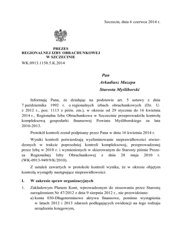 Szczecin, dnia 6 czerwca 2014 r. PREZES REGIONALNEJ IZBY OBRACHUNKOWEJ W SZCZECINIE WK.0913.1158.5.K.2014 Pan Arkadiusz Mazepa Starosta Myśliborski Informuję Pana, że działając na podstawie art. 5 ustawy z dnia 7 października 1992 r. o regionalnych izbach obrachunkowych (Dz. U. z 2012 r., poz. 1113 z późn. zm.), w okresie od 29 stycznia do 16 kwietnia 2014 r., Regionalna Izba Obrachunkowa w Szczecinie przeprowadziła kontrolę kompleksową gospodarki finansowej Powiatu Myśliborskiego za lata 2010-2013. Protokół kontroli został podpisany przez Pana w dniu 16 kwietnia 2014 r. Wyniki kontroli potwierdzają wyeliminowanie nieprawidłowości stwierdzonych w trakcie poprzedniej kontroli kompleksowej, przeprowadzonej przez Izbę w 2010 r. i wymienionych w skierowanym do Starosty piśmie Prezesa Regionalnej Izby Obrachunkowej z dnia 28 maja 2010 r. (WK-0913-949/9/K/2010). Z ustaleń zawartych w protokole kontroli wynika, że w okresie objętym kontrolą wystąpiły następujące nieprawidłowości: I. W zakresie spraw organizacyjnych 1. Zakładowym Planem Kont, wprowadzonym do stosowania przez Starostę zarządzeniem Nr 47/2012 z dnia 9 sierpnia 2012 r., nie przewidziano: a) konta 030-Długoterminowe aktywa finansowe, pomimo wystąpienia w latach 2012 i 2013 zdarzeń podlegających ewidencji na tego rodzaju urządzeniu księgowym, b) kont służących do ewidencji występujących w IV kwartale 2012 r. oraz I kwartale 2013 r. zobowiązań wymagalnych, czym naruszono obowiązujące zasady ustalania zakładowego planu kont, określone § 15 pkt 1 i pkt 5 rozporządzenia Ministra Finansów z dnia 5 lipca 2010 r. w sprawie szczególnych zasad rachunkowości oraz planów kont dla budżetu państwa, budżetów jednostek samorządu terytorialnego, jednostek budżetowych, samorządowych zakładów budżetowych, państwowych funduszy celowych oraz państwowych jednostek budżetowych mających siedzibę poza granicami Rzeczypospolitej Polskiej (Dz. U. Nr 128, poz. 861 z późn. zm.), za co odpowiedzialność ponosi Skarbnik, która nie sporządziła projektu zmian ww. Zakładowego Planu Kont – str. 21 i 34 protokołu kontroli. 2. Wskutek niezatrudnienia w Starostwie Powiatowym audytora oraz zaniechania powierzenia zadań w zakresie audytu usługodawcy niezatrudnionemu w jednostce w latach 2010-2011 w powiatowych jednostkach organizacyjnych nie przeprowadzono audytu pomimo, że w podanym okresie ujęte w uchwałach budżetowych Powiatu kwoty dochodów i przychodów oraz wydatków i rozchodów przekroczyły wysokość 40 000 tys. zł, co było niezgodne z art. 274 ust. 3 ustawy z dnia 27 sierpnia 2009 r. o finansach publicznych (Dz. U. Nr 157, poz. 1240 z późn. zm.), za co odpowiedzialność ponosi Starosta – str. 27 protokołu kontroli. W trakcie kontroli stwierdzono, że audyt jest prowadzony w Powiecie począwszy od 2012 r. II. W zakresie rachunkowości 1. (Treść wystąpienia uległa zmianie po uwzględnieniu – na mocy uchwały Nr XIV.112.2014 Kolegium Regionalnej Izby Obrachunkowej w Szczecinie z dnia 2 lipca 2014 r. – zastrzeżeń wniesionych przez Starostę Myśliborskiego). 2. Zmiany polegające na: a) zbyciu w dniu 23 września 2013 r. nieruchomości zabudowane, położonej w Barlinku o wartości 1 019 860,56 zł, wprowadzono do ewidencji środków trwałych pod datą 11 października, zamiast w terminie do dnia 30 września 2013 r., b) sprzedaży w dniu 26 października 2009 r. nieruchomości zabudowanej, położonej w Namyślinie o wartości 71 477,00 zł, wprowadzono do ewi2 dencji środków trwałych w dniu 31 grudnia 2013 r., zamiast w terminie do dnia 30 października 2009 r. c) oddaniu w trwały zarząd Domu Pomocy Społecznej w Myśliborzu, na podstawie protokołu zdawczo-odbiorczego z dnia 6 maja 2013 r., nieruchomości zabudowanych o wartości 4 920 538,63 zł wprowadzono do ewidencji środków trwałych pod datą 30 czerwca 2013 r., zamiast w terminie do dnia 30 maja 2013 r., d) przekazaniu na podstawie aktu notarialnego z dnia 11 grudnia 2012 r. na rzecz Szpitala Barlinek sp. z o.o. nieruchomości zabudowanych o wartości 384 725,00 zł wprowadzono do ewidencji środków trwałych pod datą 31 grudnia 2013 r., zamiast w terminie do dnia 31 grudnia 2012 r., czym naruszono obowiązujące zasady wprowadzania zapisów do ksiąg rachunkowych, określone art. 20 ust. 1 ustawy z dnia 29 września 1994 r. o rachunkowości, co w sytuacjach opisanych w pkt b i pkt d miało niekorzystny wpływ na rzetelne przedstawienie sytuacji majątkowej i finansowej oraz wyniku finansowego Powiatu. Za wskazane nieprawidłowości odpowiedzialność ponoszą: Inspektor w Wydziale Finansowym (pkt a) oraz Naczelnik Wydziału Geodezji, Katastru i Gospodarki Nieruchomościami, który nieterminowo przekazał do Wydziału Finansowego dowody stanowiące podstawę wprowadzenia ww. zmian w ewidencji środków trwałych (pkt b, pkt c i pkt d), a z nadzoru odpowiednio: Skarbnik i Starosta – str. 153-158 protokołu kontroli. 3. W 2013 r. do ewidencji środków trwałych wprowadzono telefony komórkowe (4), określając jednostkowe wartości ich nabycia w kwotach po 429,00 zł (3 szt.) i 499,00 (1 szt.), zamiast w cenach wynikających z dowodów ich zakupu odpowiednio 1,23 zł (3 szt.) i 1,00 zł (1 szt.), wskutek czego wartość ww. środków trwałych zawyżono ogółem o 1 781,31 zł, czym naruszono metody wyceny aktywów, określone wprowadzonym do stosowania w Starostwie zarządzeniem Starosty Nr 47/2012 z dnia 9 sierpnia 2012 r. w sprawie zasad (polityki) rachunkowości, za co odpowiedzialność ponosi Główna Księgowa, a z nadzoru Skarbnik – str. 185 i 186 protokołu kontroli. 4. Ewidencją księgową wartości niematerialnych i prawnych prowadzoną na koncie 020, zamiast zwiększyć koszty działalności operacyjnej jednostki, objęto zakupioną w 2013 r. licencję programu Asystent 4.0, o wartości 1 968,00 zł (brutto), pozwalającą na jego aktualizowanie i korzystanie 3 oraz pomoc tech