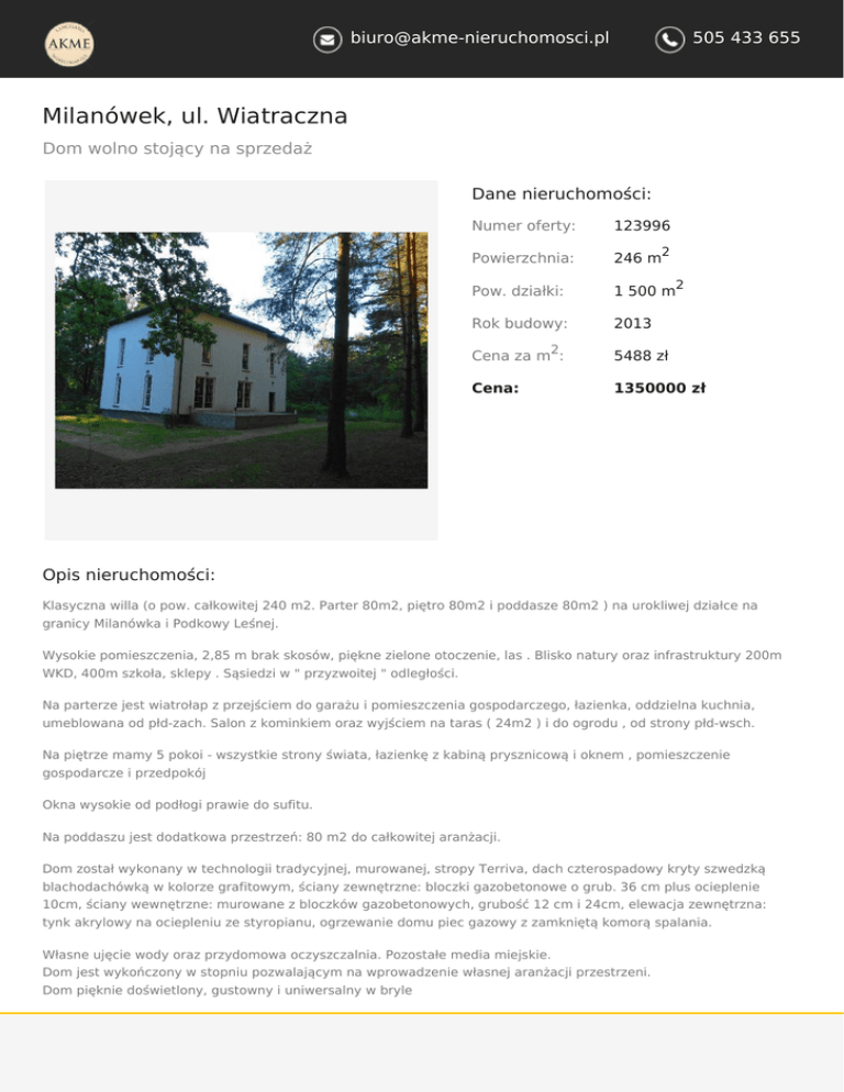 [email protected] 505 433 655 Milanówek, ul. Wiatraczna Dom wolno stojący na sprzedaż Dane nieruchomości: Numer oferty: 123996 Powierzchnia: 246 m Pow. działki: 1 500 m Rok budowy: 2013 2 2 2 Cena za m : 5488 zł Cena: 1350000 zł Opis nieruchomości: Klasyczna willa (o pow. całkowitej 240 m2. Parter 80m2, piętro 80m2 i poddasze 80m2 ) na urokliwej działce na granicy Milanówka i Podkowy Leśnej. Wysokie pomieszczenia, 2,85 m brak skosów, piękne zielone otoczenie, las . Blisko natury oraz infrastruktury 200m WKD, 400m szkoła, sklepy . Sąsiedzi w " przyzwoitej " odległości. Na parterze jest wiatrołap z przejściem do garażu i pomieszczenia gospodarczego, łazienka, oddzielna kuchnia, umeblowana od płd-zach. Salon z kominkiem oraz wyjściem na taras ( 24m2 ) i do ogrodu , od strony płd-wsch. Na piętrze mamy 5 pokoi - wszystkie strony świata, łazienkę z kabiną prysznicową i oknem , pomieszczenie gospodarcze i przedpokój Okna wysokie od podłogi prawie do sufitu. Na poddaszu jest dodatkowa przestrzeń: 80 m2 do całkowitej aranżacji. Dom został wykonany w technologii tradycyjnej, murowanej, stropy Terriva, dach czterospadowy kryty szwedzką blachodachówką w kolorze grafitowym, ściany zewnętrzne: bloczki gazobetonowe o grub. 36 cm plus ocieplenie 10cm, ściany wewnętrzne: murowane z bloczków gazobetonowych, grubość 12 cm i 24cm, elewacja zewnętrzna: tynk akrylowy na ociepleniu ze styropianu, ogrzewanie domu piec gazowy z zamkniętą komorą spalania. Własne ujęcie wody oraz przydomowa oczyszczalnia. Pozostałe media miejskie. Dom jest wykończony w stopniu pozwalającym na wprowadzenie własnej aranżacji przestrzeni. Dom pięknie doświetlony, gustowny i uniwersalny w bryle [email protected] 505 433 655 Tylko 28 km do centrum Warszawy, bardzo dobry dojazd trasą przez Pruszków, A2, trasą katowicką przez Nadarzyn lub WKD i KM. parter: garaz 30m2, salon 40m2, kuchnia 10m2, hol 15m2, łazienka 3m2, spiżarnia 1,2m2 pietro: pokoje 13, 17, 16, 14 i 14m2, hol 9m2, łazienka 7,4m2, garderoba-pom.gospodarcze 3m2 strych: ok 80 m2 do adapatacji