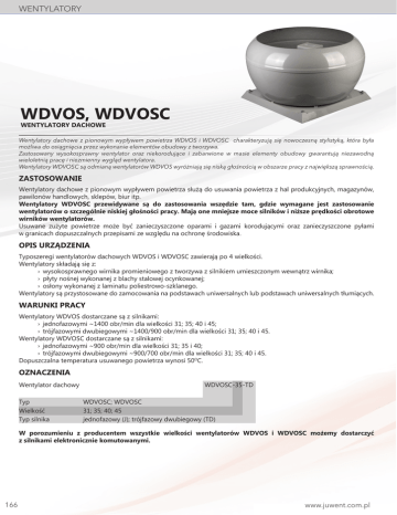 WENTYLATORY WDVOS, WDVOSC WENTYLATORY DACHOWE Wentylatory dachowe z pionowym wypływem powietrza WDVOS i WDVOSC charakteryzują się nowoczesną stylistyką, która była możliwa do osiągnięcia przez wykonanie elementów obudowy z tworzywa. Zastosowany wysokosprawny wentylator oraz niekorodujące i zabarwione w masie elementy obudowy gwarantują niezawodną wieloletnią pracę i niezmienny wygląd wentylatora. Wentylatory WDVOSC są odmianą wentylatorów WDVOS wyróżniają się niską głośnością w obszarze pracy z największą sprawnością. ZASTOSOWANIE Wentylatory dachowe z pionowym wypływem powietrza służą do usuwania powietrza z hal produkcyjnych, magazynów, pawilonów handlowych, sklepów, biur itp. Wentylatory WDVOSC przewidywane są do zastosowania wszędzie tam, gdzie wymagane jest zastosowanie wentylatorów o szczególnie niskiej głośności pracy. Mają one mniejsze moce silników i niższe prędkości obrotowe wirników wentylatorów. Usuwane zużyte powietrze może być zanieczyszczone oparami i gazami korodującymi oraz zanieczyszczone pyłami w granicach dopuszczalnych przepisami ze względu na ochronę środowiska. OPIS URZĄDZENIA Typoszeregi wentylatorów dachowych WDVOS i WDVOSC zawierają po 4 wielkości. Wentylatory składają się z: ›› wysokosprawnego wirnika promieniowego z tworzywa z silnikiem umieszczonym wewnątrz wirnika; ›› płyty nośnej wykonanej z blachy stalowej ocynkowanej; ›› osłony wykonanej z laminatu poliestrowo-szklanego. Wentylatory są przystosowane do zamocowania na podstawach uniwersalnych lub podstawach uniwersalnych tłumiących. WARUNKI PRACY Wentylatory WDVOS dostarczane są z silnikami: ›› jednofazowymi ~1400 obr/min dla wielkości 31; 35; 40 i 45; ›› trójfazowymi dwubiegowymi ~1400/900 obr/min dla wielkości 31; 35; 40 i 45. Wentylatory WDVOSC dostarczane są z silnikami: ›› jednofazowymi ~900 obr/min dla wielkości 31; 35 i 40; ›› trójfazowymi dwubiegowymi ~900/700 obr/min dla wielkości 31; 35; 40 i 45. Dopuszczalna temperatura usuwanego powietrza wynosi 50OC. OZNACZENIA Wentylator dachowy Typ Wielkość Typ silnika WDVOSC-35-TD WDVOSC; WDVOSC 31; 35; 40; 45 jednofazowy (J); trójfazowy dwubiegowy (TD) W porozumieniu z producentem wszystkie wielkości wentylatorów WDVOS i WDVOSC możemy dostarczyć z silnikami elektronicznie komutowanymi. 166 www.juwent.com.pl WENTYLATORY DANE TECHNICZNE Podstawowe wymiary Wielkość wentylatora Ød [mm] ØD [mm] A [mm] B [mm] H [mm] Masa WDVOS [kg] Masa WDVOSC [kg] WDVOS(C)-35 WDVOS(C)-40 WDVOS(C)-45 228 257 287 807 927 927 605 675 675 480 560 560 465 560 560 24 28 32,5 22 28 31 WDVOS(C)-31 203 807 WENTYLATORY WDVOS Silnik 605 480 465 20,5 20 WDVOS-31-4TD Pst[Pa] RH31V-VDK.2C.1R 3~400 V 0,14/0,095 kW 0,26/0,15 A 1340/1090 obr/min V[m3/h] WDVOS-31-4J z regulatorem 5 biegowym Silnik Pst[Pa] RH31V-4EK.OF.14 1~230 V 0,16 kW 0,74 A 1400 obr/min V[m3/h] www.juwent.com.pl 167 WENTYLATORY WDVOS-35-4TD Silnik Pst[Pa] RH35V-VDK.4C.1R 3~400 V 0,25 kW 0,64 A 1400 obr/min V[m3/h] WDVOS-35-4J z regulatorem 5 biegowym Silnik Pst[Pa] RH35V-4EK.4C.1R 1~230 V 0,27 kW 1,30 A 1390 obr/min V[m3/h] WDVOS-40-4TD Silnik Pst[Pa] RH40V-VDK.4C.1R 3~400 V 0,44/0,31 kW 0,78/0,50 A 1320/1010 obr/min V[m3/h] Pst – podciśnienie statyczne w otworze wlotowym do wentylatora 168 www.juwent.com.pl WENTYLATORY WDVOS-40-4J z regulatorem 5 biegowym Silnik Pst[Pa] RH40V-4EK.4F.1R 1~230 V 0,5 kW 2,30 A 1380 obr/min V[m3/h] WDVOS-45-4TD Silnik Pst[Pa] RH45V-VDK.6F.1R 3~400 V 0,78 kW 1,55 A 1430 obr/min V[m3/h] WDVOS-45-4J z regulatorem 5 biegowym Silnik Pst[Pa] RH45V-4EK.6K.1R 1~230 V 0,8 kW 3,60 A 1400 obr/min V[m3/h] Pst – podciśnienie statyczne w otworze wlotowym do wentylatora www.juwent.com.pl 169 WENTYLATORY WENTYLATORY WDVOSC Silnik WDVOSC-31-6TD Pst[Pa] RH31V-SDK.2A.1R 3~400 V 0,05/0,03 kW 0,11/0,06 A 870/640 obr/min V[m3/h] WDVOSC-31-6J Silnik Pst[Pa] RH31V-6EK.2A.1R 1~230 V 0,08 kW 0,42 A 920 obr/min V[m3/h] WDVOSC-35-6TD Silnik Pst[Pa] RH35V-SDK.2A.1R 3~400 V 0,10/0,06 kW 0,24/0,10 A 890/700 obr/min V[m3/h] Pst – podciśnienie statyczne w otworze wlotowym do wentylatora 170 www.juwent.com.pl WENTYLATORY WDVOSC-35-6J Silnik Pst[Pa] RH35V-6EK.2C.1R 1~230 V 0,18 kW 0,48 A 910 obr/min V[m3/h] WDVOSC-40-6TD Silnik Pst[Pa] RH40V-SDK.4A.1R 3~400 V 0,13/0,08 kW 0,24/0,14 A 840/540 obr/min V[m3/h] WDVOSC-40-6J Silnik Pst[Pa] RH40V-6EK.4C.1R 1~230 V 0,15 kW 0,70 A 900 obr/min V[m3/h] Pst – podciśnienie statyczne w otworze wlotowym do wentylatora www.juwent.com.pl 171 WENTYLATORY WDVOSC-45-6TD Silnik Pst[Pa] RH45V-SDK.4F.1R 3~400 V 0,24 kW 0,54 A 920 obr/min V[m3/h] Pst – podciśnienie statyczne w otworze wlotowym do wentylatora Głośność pracy wentylatorów WDVOS z silnikami trójfazowymi Od strony wylotu powietrza* Wielkość wentylatora 31 35 40 45 W punkcie 1 z odległości 1m 49 53 56 63 5m 37 41 44 51 W punkcie 2 z odległości 1m 58 62 64 69 5m 46 50 52 57 Głośność [dBA] Od strony wlotu powietrza** dla wentylatora na podstawie PU dla wentylatora na podstawie PUT W punkcie W punkcie W punkcie W punkcie 1 2 1 2 z odległości z odległości z odległości z odległości 1m 5m 1m 5m 1m 5m 1m 5m 50 54 57 64 46 48 51 58 59 63 65 70 53 57 59 64 38 42 45 52 34 36 39 46 47 51 53 58 41 45 47 52 Głośność pracy wentylatorów WDVOSC z silnikami trójfazowymi Od strony wylotu powietrza* Wielkość wentylatora 31 35 40 45 W punkcie 1 z odległości 1m 39 44 45 51 5m 27 32 33 39 W punkcie 2 z odległości 1m 50 54 56 60 5m 38 42 44 48 Głośność [dBA] Od strony wlotu powietrza** dla wentylatora na podstawie PU dla wentylatora na podstawie PUT W punkcie W punkcie W punkcie W punkcie 1 2 1 2 z odległości z odległości z odległości z odległości 1m 5m 1m 5m 1m 5m 1m 5m 40 45 46 52 34 39 40 46 51 55 57 61 45 49 51 55 28 33 34 40 22 27 28 34 39 43 45 49 33 37 39 43 Głośność pracy wentylatorów WDVOS z silnikami jednofazowymi Od strony wylotu powietrza* Wielkość wentylatora 31