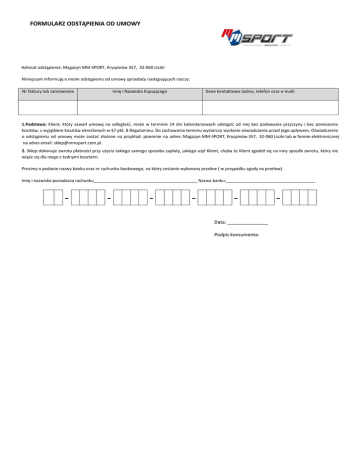 FORMULARZ ODSTĄPIENIA OD UMOWY Adresat odstąpienia: Magazyn MM-SPORT, Kryspinów 357, 32-060 Liszki Niniejszym informuję o moim odstąpieniu od umowy sprzedaży następujących rzeczy: Nr faktury lub zamówienia Imię i Nazwisko Kupującego Dane kontaktowe (adres, telefon oraz e-mail) 1.Podstawa: Klient, który zawarł umowę na odległość, może w terminie 14 dni kalendarzowych odstąpić od niej bez podawania przyczyny i bez ponoszenia kosztów, z wyjątkiem kosztów określonych w §7 pkt. 8 Regulaminu. Do zachowania terminu wystarczy wysłanie oświadczenia przed jego upływem. Oświadczenie o odstąpieniu od umowy może zostać złożone na przykład: pisemnie na adres: Magazyn MM-SPORT, Kryspinów 357, 32-060 Liszki lub w formie elektronicznej na adres email: [email protected]. 2. Sklep dokonuje zwrotu płatności przy użyciu takiego samego sposobu zapłaty, jakiego użył Klient, chyba że Klient zgodził się na inny sposób zwrotu, który nie wiąże się dla niego z żadnymi kosztami. Prosimy o podanie nazwy banku oraz nr rachunku bankowego, na który zostanie wykonany przelew ( w przypadku zgody na przelew). Imię i nazwisko posiadacza rachunku___________________________________________ Nazwa banku:_____________________________________ - - - - Data: _______________ Podpis konsumenta: -