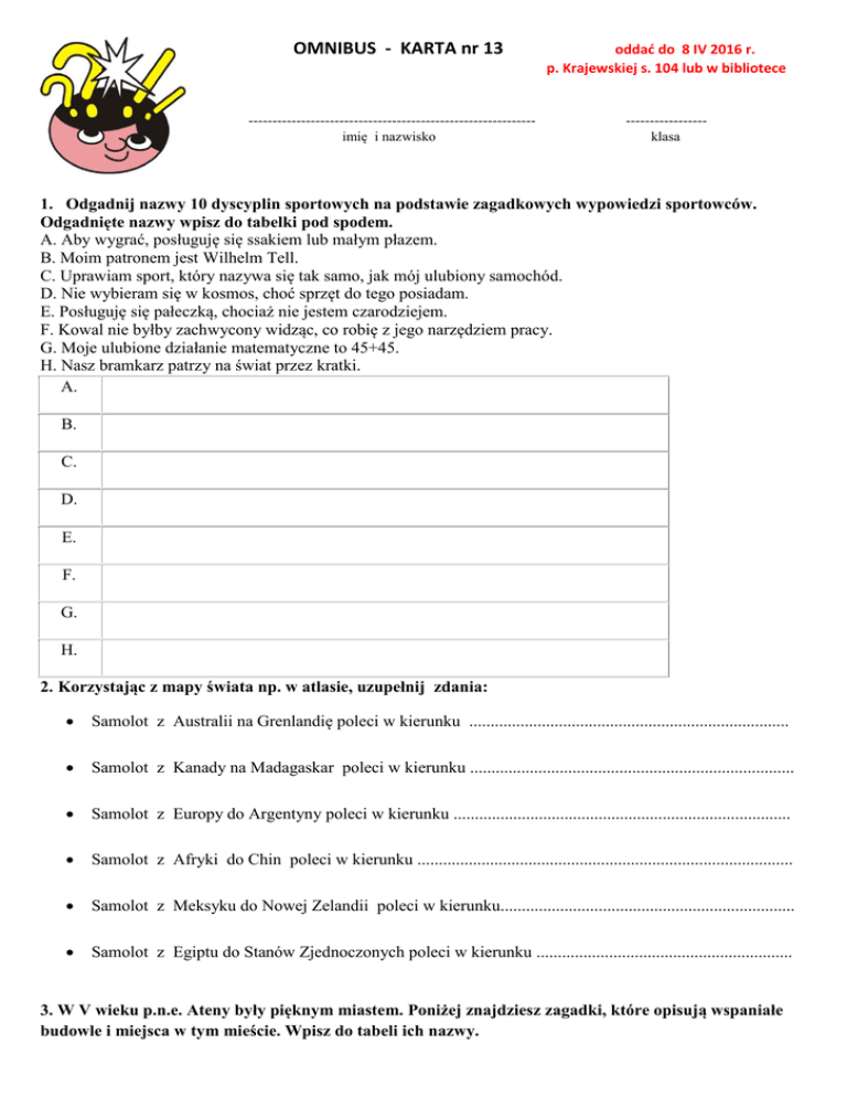 OMNIBUS - KARTA nr 13 oddać do 8 IV 2016 r. p. Krajewskiej s. 104 lub w bibliotece ------------------------------------------------------------ ----------------- imię i nazwisko klasa 1. Odgadnij nazwy 10 dyscyplin sportowych na podstawie zagadkowych wypowiedzi sportowców. Odgadnięte nazwy wpisz do tabelki pod spodem. A. Aby wygrać, posługuję się ssakiem lub małym płazem. B. Moim patronem jest Wilhelm Tell. C. Uprawiam sport, który nazywa się tak samo, jak mój ulubiony samochód. D. Nie wybieram się w kosmos, choć sprzęt do tego posiadam. E. Posługuję się pałeczką, chociaż nie jestem czarodziejem. F. Kowal nie byłby zachwycony widząc, co robię z jego narzędziem pracy. G. Moje ulubione działanie matematyczne to 45+45. H. Nasz bramkarz patrzy na świat przez kratki. A. B. C. D. E. F. G. H. 2. Korzystając z mapy świata np. w atlasie, uzupełnij zdania: Samolot z Australii na Grenlandię poleci w kierunku ........................................................................... Samolot z Kanady na Madagaskar poleci w kierunku ............................................................................ Samolot z Europy do Argentyny poleci w kierunku ............................................................................... Samolot z Afryki do Chin poleci w kierunku ........................................................................................ Samolot z Meksyku do Nowej Zelandii poleci w kierunku..................................................................... Samolot z Egiptu do Stanów Zjednoczonych poleci w kierunku ............................................................ 3. W V wieku p.n.e. Ateny były pięknym miastem. Poniżej znajdziesz zagadki, które opisują wspaniałe budowle i miejsca w tym mieście. Wpisz do tabeli ich nazwy. Ponad miastem góruje, poświęcona Atenie. Ta budowla harmonią twe przyciągnie spojrzenie. Skalne wzgórze, „wysokim miastem” nazwane. Gdzie najstarsze Ateny były zbudowane. Tam stragany z rybami, serem do kupienia. Tam zbierają się sądy, radzą zgromadzenia. Rzeźba z morza widoczna, co na wzgórzu stoi. I włócznią, zda się z dołu, słoneczną tarczę kroi. 4. Zbliżają się święta wielkanocne. Na naszych stołach zagoszczą jajka. Odpowiedz na kilka pytań związanych właśnie z nimi. 1. Dlaczego warto jeść jajka? ……........................................………………………………………………………………………………… 2. Do czego jeszcze (poza jedzeniem) wykorzystywane są jajka? …………........................................…………………………………………………………………………… 3. Jak nazywa się substancja budulcowa dostarczana organizmowi dzięki spożywaniu jajek? ………………...........................................……………………………………………………………………… 4. Jajka są źródłem witamin. Podaj przykłady dwóch witamin występujących w jajkach. ………………………...........................................……………………………………………………………… 5. Jak nazywa się substancja zawarta w żółtku, która poprawia widzenie, a także chroni gałkę oczną przed szkodliwym promieniowaniem UVA i UVB oraz zapobiega zwyrodnieniu plamki żółtej? ……………………………………………...........................................………………………………………… 5. Przeczytaj uważnie i udziel odpowiedzi: A) Na jeziorze rośnie rzęsa wodna. Rzęsa powiększa swoją powierzchnię dwukrotnie w ciągu jednej doby. W ciągu 22 dni rzęsa zarosła pół jeziora. W ciągu ilu dni zarośnie całe jezioro? ............................ B) Cegła waży kilogram i pół cegły. Ile waży cegła ? ........................................