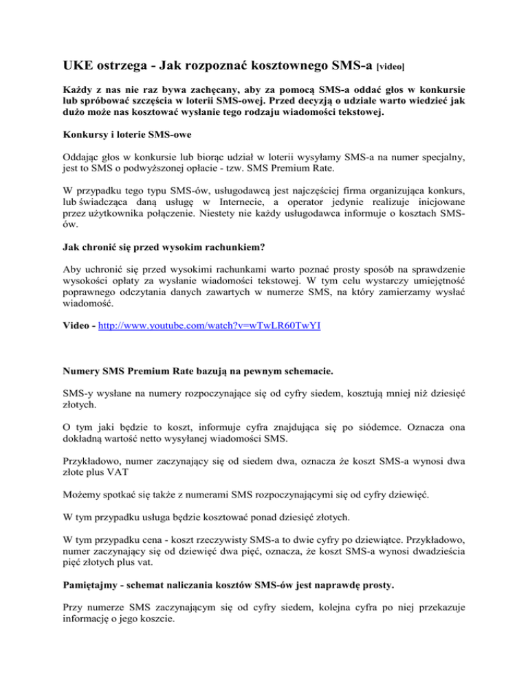 UKE ostrzega - Jak rozpoznać kosztownego SMS-a [video] Każdy z nas nie raz bywa zachęcany, aby za pomocą SMS-a oddać głos w konkursie lub spróbować szczęścia w loterii SMS-owej. Przed decyzją o udziale warto wiedzieć jak dużo może nas kosztować wysłanie tego rodzaju wiadomości tekstowej. Konkursy i loterie SMS-owe Oddając głos w konkursie lub biorąc udział w loterii wysyłamy SMS-a na numer specjalny, jest to SMS o podwyższonej opłacie - tzw. SMS Premium Rate. W przypadku tego typu SMS-ów, usługodawcą jest najczęściej firma organizująca konkurs, lub świadcząca daną usługę w Internecie, a operator jedynie realizuje inicjowane przez użytkownika połączenie. Niestety nie każdy usługodawca informuje o kosztach SMSów. Jak chronić się przed wysokim rachunkiem? Aby uchronić się przed wysokimi rachunkami warto poznać prosty sposób na sprawdzenie wysokości opłaty za wysłanie wiadomości tekstowej. W tym celu wystarczy umiejętność poprawnego odczytania danych zawartych w numerze SMS, na który zamierzamy wysłać wiadomość. Video - http://www.youtube.com/watch?v=wTwLR60TwYI Numery SMS Premium Rate bazują na pewnym schemacie. SMS-y wysłane na numery rozpoczynające się od cyfry siedem, kosztują mniej niż dziesięć złotych. O tym jaki będzie to koszt, informuje cyfra znajdująca się po siódemce. Oznacza ona dokładną wartość netto wysyłanej wiadomości SMS. Przykładowo, numer zaczynający się od siedem dwa, oznacza że koszt SMS-a wynosi dwa złote plus VAT Możemy spotkać się także z numerami SMS rozpoczynającymi się od cyfry dziewięć. W tym przypadku usługa będzie kosztować ponad dziesięć złotych. W tym przypadku cena - koszt rzeczywisty SMS-a to dwie cyfry po dziewiątce. Przykładowo, numer zaczynający się od dziewięć dwa pięć, oznacza, że koszt SMS-a wynosi dwadzieścia pięć złotych plus vat. Pamiętajmy - schemat naliczania kosztów SMS-ów jest naprawdę prosty. Przy numerze SMS zaczynającym się od cyfry siedem, kolejna cyfra po niej przekazuje informację o jego koszcie. Analogicznie, w przypadku numeru SMS-a zaczynającego się od cyfry dziewięć - dwie kolejne cyfry ujawnią cenę netto SMS-a. W razie wątpliwości lub problemów skontaktuj się z Centrum Informacji Konsumenckiej UKE. • • • infolinia 801 900 853 (koszt połączenia zgodny z cennikiem operatora) 22 534 91 74 (pon.-pt. w godzinach 8.15 – 16.15) www.uke.gov.pl/formularz • www.cik.uke.gov.pl Obowiązki operatora – blokada oraz informowanie abonenta Na każde żądanie abonenta dostawca publicznej usługi telekomunikacyjnej jest obowiązany do nieodpłatnego określenia progu kwotowego dla każdego okresu rozliczeniowego, po przekroczeniu którego dostawca usług telekomunikacyjnych jest zobligowany do: • natychmiastowego poinformowania abonenta o przekroczeniu progu, • na żądanie abonenta zablokowania możliwości wykonywania połączeń na numery o podwyższonej opłacie i odbierania połączeń z takich numerów, chyba że takie połączenia nie będą powodowały obowiązku zapłaty po stronie abonenta. Abonentom powinny być oferowane, co najmniej 3 progi kwotowe: • 35 zł, • 100 zł, • 200 zł. Prawo obliguje przedsiębiorców telekomunikacyjnych do: • nieodpłatnego blokowania połączeń wychodzących na numery usług o podwyższonej opłacie oraz połączeń przychodzących z takich numerów, • nieodpłatnego blokowania połączeń wychodzących na numery poszczególnych rodzajów usług o podwyższonej opłacie, • nieodpłatnego blokowania połączeń przychodzących z takich numerów Przepisy Prawa telekomunikacyjnego nakładają jeszcze jeden obowiązek na dostawców usług telekomunikacyjnych – jest nim umożliwienie abonentowi określenia maksymalnej ceny za jednostkę rozliczeniową usługi albo ceny za połączenie i nieodpłatnego blokowania połączeń wychodzących na numery usług o podwyższonej opłacie, których cena przekracza cenę maksymalną, określoną przez abonenta.