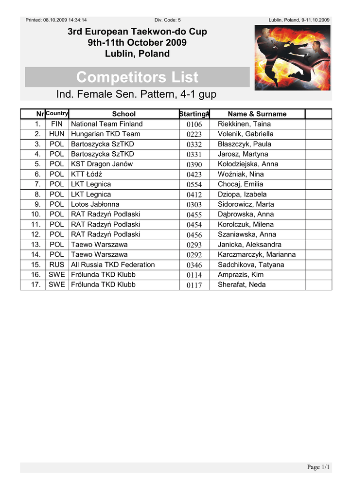 Printed: 08.10.2009 14:34:14 Div. Code: 5 Lublin, Poland, 9-11.10.2009 3rd European Taekwon-do Cup 9th-11th October 2009 Lublin, Poland Competitors List Ind. Female Sen. Pattern, 4-1 gup Nr Country 1. FIN 2. HUN 3. POL 4. POL 5. POL 6. POL 7. POL 8. POL 9. POL 10. POL 11. POL 12. POL 13. POL 14. POL 15. RUS 16. SWE 17. SWE School National Team Finland Hungarian TKD Team Bartoszycka SzTKD Bartoszycka SzTKD KST Dragon Janów KTT Łódź LKT Legnica LKT Legnica Lotos Jabłonna RAT Radzyń Podlaski RAT Radzyń Podlaski RAT Radzyń Podlaski Taewo Warszawa Taewo Warszawa All Russia TKD Federation Frölunda TKD Klubb Frölunda TKD Klubb Starting# 0106 0223 0332 0331 0390 0423 0554 0412 0303 0455 0454 0456 0293 0292 0346 0114 0117 Name & Surname Riekkinen, Taina Volenik, Gabriella Błaszczyk, Paula Jarosz, Martyna Kołodziejska, Anna Woźniak, Nina Chocaj, Emilia Dziopa, Izabela Sidorowicz, Marta Dąbrowska, Anna Korolczuk, Milena Szaniawska, Anna Janicka, Aleksandra Karczmarczyk, Marianna Sadchikova, Tatyana Amprazis, Kim Sherafat, Neda Page 1/1