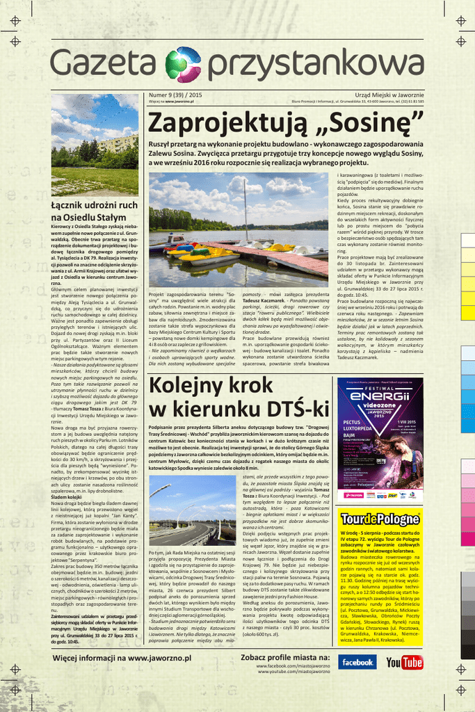 Gazeta przystankowa Urząd Miejski w Jaworznie Numer 9 (39) / 2015 Więcej na www.jaworzno.pl Biuro Promocji i Informacji, ul. Grunwaldzka 33, 43-600 Jaworzno, tel. (32) 61 81 585 Zaprojektują „Sosinę” Ruszył przetarg na wykonanie projektu budowlano - wykonawczego zagospodarowania Zalewu Sosina. Zwycięzca przetargu przygotuje trzy koncepcje nowego wyglądu Sosiny, a we wrześniu 2016 roku rozpocznie się realizacja wybranego projektu. Łącznik udrożni ruch na Osiedlu Stałym Kierowcy z Osiedla Stałego zyskają niebawem zupełnie nowe połączenie z ul. Grunwaldzką. Obecnie trwa przetarg na sporządzenie dokumentacji projektowej i budowę łącznika drogowego pomiędzy al. Tysiąclecia a DK 79. Realizacja inwestycji pozwoli na znaczne odciążenie skrzyżowania z ul. Armii Krajowej oraz ułatwi wyjazd z Osiedla w kierunku centrum Jaworzna. Głównym celem planowanej inwestycji jest stworzenie nowego połączenia pomiędzy Aleją Tysiąclecia a ul. Grunwaldzką, co przyczyni się do udrożnienia ruchu samochodowego w całej dzielnicy. Ważne jest ponadto zapewnienie obsługi przyległych terenów i istniejących ulic. Dojazd do nowej drogi zyskają m.in. bloki przy ul. Partyzantów oraz II Liceum Ogólnokształcące. Ważnym elementem prac będzie także stworzenie nowych miejsc parkingowych w tym rejonie. - Nasze działania podyktowane są głosami mieszkańców, którzy chcieli budowy nowych miejsc parkingowych na osiedlu. Poza tym takie rozwiązanie pozwoli na utrzymanie płynności ruchu w dzielnicy i szybszą możliwość dojazdu do głównego ciągu drogowego jakim jest DK 79 - tłumaczy Tomasz Tosza z Biura Koordynacji Inwestycji Urzędu Miejskiego w Jaworznie. Nowa droga ma być przyjazna rowerzystom a jej budowa uwzględnia natężony ruch pieszych w okolicy Parku im. Lotników Polskich, dlatego na całej długości trasy obowiązywać będzie ograniczenie prędkości do 30 km/h, a skrzyżowania i przejścia dla pieszych będą "wyniesione”. Ponadto, by zrekompensować wycinkę istniejących drzew i krzewów, po obu stronach ulicy zostanie nasadzona roślinność szpalerowa, m.in. lipy drobnolistne. Śladem kolejki Nowa droga będzie biegła śladem dawnej linii kolejowej, którą przewożono węgiel z nieistniejącej już kopalni "Jan Kanty”. Firma, która zostanie wyłoniona w drodze przetargu nieograniczonego będzie miała za zadanie zaprojektowanie i wykonanie robót budowlanych, na podstawie programu funkcjonalno – użytkowego opracowanego przez krakowskie biuro projektowe "Serpentyna”. Zakres prac budowy 350 metrów łącznika obejmować będzie m.in. budowę: jezdni o szerokości 6 metrów, kanalizacji deszczowej - odwodnienia, oświetlenia - lamp ulicznych, chodników o szerokości 2 metrów, miejsc parkingowych - równoległych i prostopadłych oraz zagospodarowanie terenu. Zainteresowani udziałem w przetargu przedsiębiorcy mogą składać oferty w Punkcie Informacyjnym Urzędu Miejskiego w Jaworznie przy ul. Grunwaldzkiej 33 do 27 lipca 2015 r. do godz. 10:45. Projekt zagospodarowania terenu "Sosiny” ma uwzględnić wiele atrakcji dla całych rodzin. Powstanie m.in. wodny plac zabaw, siłownia zewnętrzna i miejsce zabaw dla najmłodszych. Zmodernizowana zostanie także strefa wypoczynkowa dla bazy Miejskiego Centrum Kultury i Sportu – powstaną nowe domki kempingowe dla 4 i 8 osób oraz zaplecze z grillowiskiem. - Nie zapominamy również o wędkarzach i osobach uprawiających sporty wodne. Dla nich zostaną wybudowane specjalne pomosty - mówi zastępca prezydenta Tadeusz Kaczmarek. - Ponadto powstaną parkingi, ścieżki, drogi rowerowe czy stacja "roweru publicznego”. Wielbiciele dwóch kółek będą mieli możliwość objechania zalewu po wyasfaltowanej i oświetlonej drodze. Prace budowlane przewidują również m.in. uporządkowanie gospodarki ściekowej - budowę kanalizacji i toalet. Ponadto wykonana zostanie utwardzona ścieżka spacerowa, powstanie strefa biwakowa Kolejny krok w kierunku DTŚ-ki Podpisanie przez prezydenta Silberta aneksu dotyczącego budowy tzw. "Drogowej Trasy Średnicowej - Wschód" przybliża jaworznickim kierowcom szansę na dojazdu do centrum Katowic bez konieczności stania w korkach i w dużo krótszym czasie niż możliwe to jest obecnie. Realizacja tej inwestycji sprawi, że do stolicy Górnego Śląska pojedziemy z Jaworzna całkowicie bezkolizyjnym odcinkiem, który omijać będzie m.in. centrum Mysłowic, dzięki czemu czas dojazdu z rogatek naszego miasta do okolic katowickiego Spodka wyniesie zaledwie około 8 min. Po tym, jak Rada Miejska na ostatniej sesji przyjęła propozycję Prezydenta Miasta i zgodziła się na przystąpienie do zaprojektowania, wspólnie z Sosnowcem i Mysłowicami, odcinka Drogowej Trasy Średnicowej, który będzie prowadził do naszego miasta, 26 czerwca prezydent Silbert podpisał aneks do porozumienia sprzed dwóch lat, którego wynikiem było między innymi Studium Transportowe dla wschodniej części aglomeracji górnośląskiej. - Studium jednoznacznie potwierdziło sens budowania drogi między Katowicami i Jaworznem. Nie tylko dlatego, że znacznie poprawia połączenie między obu mia- Więcej informacji na www.jaworzno.pl stami, ale przede wszystkim z tego powodu, że pozostałe miasta Śląska znajdą się na głównej osi podróży - wyjaśnia Tomasz Tosza z Biura Koordynacji Inwestycji. - Pod tym względem to lepsze połączenie niż autostradą, która - poza Katowicami - biegnie opłotkami miast i w większości przypadków nie jest dobrze skomunikowana z ich centrami. Dzięki podjęciu wstępnych prac projektowych wiadomo już, że zupełnie zmieni się węzeł Jęzor, który znajdzie się w granicach Jaworzna. Węzeł dostanie zupełnie nowe łącznice i podłączenia do Drogi Krajowej 79. Nie będzie już niebezpiecznego i kolizyjnego skrzyżowania przy stacji paliw na terenie Sosnowca. Pojawią się za to dodatkowe pasy ruchu. W ramach budowy DTŚ zostanie