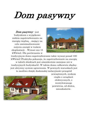 Dom pasywny Dom pasywny - jest budynkiem o wyjątkowo niskim zapotrzebowaniu na energię cieplną, , mający na celu zminimalizowanie zużycia energii w trakcie eksploatacji. . Wynosi ono 15 kWh/m2. Dla porównania w tradycyjnym domu zapotrzebowanie takie wynosi ponad 100 kWh/m2 (Praktyka pokazuje, że zapotrzebowanie na energię w takich obiektach jest ośmiokrotnie mniejsze niż w tradycyjnych budynkach). W takim domu całkowicie zbędny jest aktywny system ogrzewania. W pewnych warunkach jest to możliwe dzięki doskonałej izolacyjności przegród zewnętrznych, zyskom ciepła z urządzeń elektrycznych, z wentylowanego powietrza, od słońca, mieszkańców. Dom pasywny to nowa idea w podejściu do oszczędzania energii we współczesnym budownictwie. Jej innowacyjność przejawia się w tym, że skupia się ona przede wszystkim na poprawie parametrów elementów i systemów istniejących w każdym budynku, zamiast wprowadzania dodatkowych rozwiązań. W domach pasywnych redukcja zapotrzebowania na ciepło jest tak duża, że nie stosuje się w nich tradycyjnego, systemu grzewczego, a jedynie dogrzewanie powietrza wentylacyjnego. Do zbilansowania zapotrzebowania na ciepło wykorzystuje się również promieniowanie słoneczne, odzysk ciepła z wentylacji (rekuperacja), a także zyski cieplne pochodzące od wewnętrznych źródeł, takich jak urządzenia elektryczne i mieszkańcy. Idea domów pasywnych nie jest opatentowana, zastrzeżona ani nie podlega innym formom ochrony prawnej. Możliwe jest wznoszenie domów pasywnych w różnych technologiach budowlanych. Dom pasywny wyróżnia bardzo niskie zapotrzebowanie na energię do ogrzewania – poniżej 15 kWh/(m²•rok). Oznacza to, że w przeciągu sezonu grzewczego do ogrzania jednego metra kwadratowego mieszkania potrzeba 15 kWh, co odpowiada spaleniu 1,5 l oleju opałowego, bądź 1,7 m³ gazu, czy też 2,3 kg węgla. Dla porównania, zapotrzebowanie na ciepło dla budynków konwencjonalnych budowanych obecnie wynosi około 120 kWh/(m²•rok). Istotą budownictwa pasywnego jest maksymalizacja zysków energetycznych i ograniczenie strat ciepła. Aby to osiągnąć wszystkie przegrody zewnętrzne posiadają niski współczynnik przenikania ciepła. Ponadto zewnętrzna powłoka budynku jest nieprzepuszczalna dla powietrza. Podobnie stolarka okienna wykazuje mniejsze straty cieplne niż rozwiązania stosowane standardowo. Z kolei system nawiewno-wywiewnej wentylacji zmniejsza o 75-90% straty ciepła związane z wentylacją budynku. Rozwiązaniem często stosowanym w domach pasywnych jest gruntowy wymiennik ciepła. W okresie zimowym świeże powietrze po przefiltrowaniu przechodzi przez to urządzenie, gdzie jest wstępnie ogrzewane. Następnie powietrze dostaje się do rekuperatora, w którym zostaje podgrzane ciepłem pochodzącym z powietrza wywiewanego z budynku. Charakterystyczny dla standardu budownictwa pasywnego jest fakt, że w przeważającej części zapotrzebowanie na ciepło zostaje zaspokojone dzięki zyskom cieplnym z promieniowania słonecznego oraz ciepłu oddawanemu przez urządzenia i przebywających w budynku ludzi. Jedynie w okresach szczególnie niskich temperatur stosuje się dogrzewanie powietrza nawiewanego do pomieszczeń. Co zrobić aby to uzyskać? Przede wszystkim ściany zewnętrzne budynku muszą mieć odpowiednią izolację zapewniającą że współczynnik przenikania ciepła dla takiej przegrody będzie niższy od U<0,14. Technologicznie ściana taka musi być zaprojektowana w sposób eliminujący tzw. mostki termiczne. Technologia, w której proponujemy wykonać dom pasywny to Ytong docieplony odpowiednią grubością wełny mineralnej. Oczywiście możliwe jest też wykonanie domu pasywnego w innych technologiach, np. drewnianej lub thermomur. Samo dobre zaizolowanie ścian zewnętrznych nie wystarczy. Aby wszystko prawidłowo funkcjonowało to budynek taki musi być prawidłowo zaprojektowany idąc w kierunku oszczędnie zaprojektowanej bryły, odpowiedniej ilości okien i ich usytuowania, a także odpowiedniego doboru tras prowadzenia instalacji, nie wspominając o umiejętnym wykonawstwie i znajomości technologii. Projekt domu pasywnego Dobry projekt jest podstawowym elementem każdej inwestycji, bowiem powstaje wtedy najmniej błędów, a realizacja przebiega szybko i sprawnie. Ma to duży wpływ na ograniczenie kosztów budowy. Inwestorzy indywidualni zwykle wybierają tanie projekty katalogowe i dostosowują je do swoich potrzeb, najczęściej w trakcie budowy. W przypadku domów pasywnych takie postępowanie jest niedopuszczalne. Nawet drobne zmiany mogą spowodować, że budynek przestanie być pasywny. W efekcie takiego działania można ponieść większe koszty i nie uzyskać zamierzonego efektu. Projekty domów pasywnych pojawiające się w katalogach nie spełnią wymagań dla wszystkich inwestorów. Dlatego też domy pasywne należy projektować na indywidualne zamówienie. Wtedy dopiero można budynek ściśle dostosować do warunków terenowych oraz potrzeb przyszłych mieszkańców. Podstawowe wymagania projektowe to: odpowiednia działka budowlana pozwalająca na zorientowanie budynku w kierunku południowym, maksymalne wykorzystanie warunków naturalnych celem pozyskania energii termicznej, buforowy rozkład pomieszczeń pozwalający na racjonalne wykorzystanie i ograniczenie zużycia pozyskanej energii termicznej prosta i zwarta bryła budynku doskonała szczelność i izolacyjność przegród zewnętrznych, zez mostków termicznych stosowanie nowoczesnych technologii pozwalających na racjonalne gospodarowanie energią Idea domu pasywnego Podstawowym założeniem idei domu pasywnego jest maksymalizacja oszczędności energii poprzez minimalizację strat tej energii na takim poziomie, że niezależny system ogrzewania staje się zbędny. Aby to uzyskać należy ograniczyć zapotrzebowanie na energię cieplną do 15 kWh/m2. 1. Zastosowanie odpowiedniej technologii wykonania śc