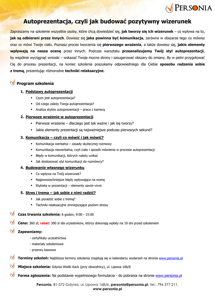 Autoprezentacja, czyli jak budować pozytywny wizerunek Zapraszamy na szkolenie wszystkie osoby, które chcą dowiedzieć się, jak tworzy się ich wizerunek – co wpływa na to, jak są odbierani przez innych. Dowiesz się jaka powinna być komunikacja, zarówno w obszarze tego co mówisz oraz co mówi Twoje ciało. Poznasz proces tworzenia się pierwszego wrażenia, a także dowiesz się, jakie elementy wpływają na nasza ocenę przez innych. Podczas warsztatu przeanalizujemy Twój styl autoprezentacji, by wspólnie wyciągnąć wnioski – wskazać Twoje mocne strony i zasugerować obszary do zmiany. By w pełni przygotować Cię do procesu prezentacji, na koniec szkolenia poszukamy odpowiedniego dla Ciebie sposobu radzenia sobie z tremą, prezentując różnorodne techniki relaksacyjne. Program szkolenia 1. Podstawy autoprezentacji Czym jest autoprezentacja? Od czego zależy Twoja autoprezentacja? Analiza stylów autoprezentacji – praca z kamerą 2. Pierwsze wrażenie w autoprezentacji Pierwsze wrażenie – dlaczego jest tak ważne i jak się tworzy? Jakie elementy prezentacji są najważniejsze podczas pierwszych sekund? 3. Komunikacja – czyli co mówić i jak mówić? Komunikacja werbalna – zasady skutecznej rozmowy Komunikacja niewerbalna, czyli ciało i sposób mówienia w procesie autoprezentacji Błędy w komunikacji, których należy unikać Jak dostosować styl komunikacji do rozmówcy? 4. Budowanie własnego wizerunku Co wpływa na Twój wizerunek? Najpowszechniejsze błędy wpływające na ocenę Etykieta w prezentacji – elementy savoir-vivre 5. Stres i trema – jak sobie z nimi radzić? Jak poradzić sobie z tremą? Techniki relaksacyjne zmniejszające poziom stresu Czas trwania szkolenia: 6 godzin, 9:00 - 15:00 Cena: 360 zł; rabat: 300 zł dla uczestników, którzy dokonają wpłaty na 10 dni przed szkoleniem Zapewniamy: - certyfikaty uczestnictwa - materiały szkoleniowe - przerwy kawowe Terminy szkoleń: Najbliższe terminy szkolenia znajdują się w kalendarzu wydarzeń na stronie www.personia.pl Miejsce szkolenia: Gdynia Wielki Kack (przy obwodnicy), ul. Lipowa 16b/6 Forma zgłoszenia: Na podstawie wypełnionego formularza - do pobrania na stronie www.personia.pl Personia, 81-572 Gdynia, ul. Lipowa 16B/6, [email protected], tel.: 796 377 211, www.personia.pl