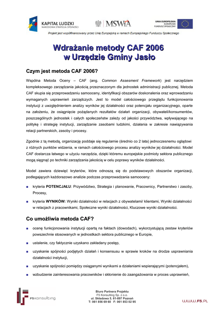 Wdrażanie metody CAF 2006 w Urzędzie Gminy Jasło Czym jest metoda CAF 2006? Wspólna Metoda Oceny – CAF (ang. Common Assesment Framework) jest narzędziem kompleksowego zarządzania jakością przeznaczonym dla jednostek administracji publicznej. Metoda CAF skupia się przeprowadzeniu samooceny, identyfikacji obszarów doskonalenia oraz wprowadzaniu wymaganych usprawnień zarządczych. Jest to model całościowego przeglądu funkcjonowania instytucji z uwzględnieniem analizy wyników jej działalności oraz potencjału organizacyjnego, oparte na założeniu, że osiągnięcie pożądanych rezultatów działań organizacji, obywateli/konsumentów, poszczególnych jednostek i całych społeczeństw zależy od jakości przywództwa, wpływającego na politykę i strategię instytucji, zarządzanie zasobami ludzkimi, działania w zakresie nawiązywania relacji partnerskich, zasoby i procesy. Zgodnie z tą metodą, organizację poddaje się regularnie (średnio co 2 lata) jednoczesnemu oglądowi z różnych punktów widzenia, w ramach całościowego procesu analizy wyników jej działalności. Model CAF dostarcza łatwego w użyciu narzędzia, dzięki któremu europejskie podmioty sektora publicznego mogą sięgnąć po techniki zarządzania jakością w celu poprawy wyników działalności. Model zawiera dziewięć kryteriów, które odnoszą się do podstawowych obszarów organizacji, podlegających każdorazowo analizie podczas przeprowadzania samooceny: ■ kryteria POTENCJAŁU: Przywództwo, Strategia i planowanie, Pracownicy, Partnerstwo i zasoby, Procesy, ■ kryteria WYNIKÓW: Wyniki działalności w relacjach z obywatelami/ klientami, Wyniki działalności w relacjach z pracownikami, Społeczne wyniki działalności, Kluczowe wyniki działalności. Co umożliwia metoda CAF? ■ ocenę funkcjonowania instytucji opartą na faktach (dowodach), wykorzystującą zestaw kryteriów powszechnie stosowanych w jednostkach sektora publicznego w Europie, ■ ustalenie, czy faktycznie uzyskano zakładany postęp, ■ uzyskanie spójności podjętych działań i konsensusu w sprawie kroków na drodze usprawniania działalności instytucji, ■ uzyskanie spójności pomiędzy osiąganymi wynikami a działaniami wspierającymi (potencjałem), ■ wzbudzenie zainteresowania pracowników i skłonienie do zaangażowania w proces usprawnień, Biuro Partnera Projektu F5 Konsulting Sp. z o.o. ul. Składowa 5, 61-897 Poznań T: 061 856 69 60 F: 061 853 02 95 ■ upowszechnienie doświadczeń w zakresie dobrych praktyk i dzielenie się nimi wewnątrz i na zewnątrz instytucji, ■ włączenie różnych inicjatyw dotyczących poprawy jakości w codzienną działalność instytucji, ■ pomiar osiąganego wraz z upływem czasu postępu, drogą okresowej samooceny. Jak metoda CAF będzie wdrażana? Wdrożenie metody CAF w Urzędzie będzie przebiegać w oparciu o 10 kroków doskonalenia organizacji, podzielonych na trzy fazy: FAZA I Początek drogi z metodą CAF FAZA II Proces samooceny FAZA III Plan usprawnień / ustalenie priorytetów Krok 1: Organizacja i planowanie procesu samooceny Krok 2: Upowszechnienie informacji o procesie samooceny Krok 3: Utworzenie jednej lub więcej grup samooceny Krok 4: Organizacja szkoleń Krok 5: Przeprowadzenie samooceny Krok 6: Sporządzenie sprawozdania z wyników samooceny Krok 7: Sporządzenie projektu planu doskonalenia Krok 8: Upowszechnienie informacji o planie doskonalenia Krok 9: Realizacja planu doskonalenia Krok 10: Planowanie następnej samooceny CAF Urząd otrzyma wsparcie ze strony MSWiA do Kroku 7 tj. wsparcia doradczego z zakresu ustalania priorytetów działań doskonalących, podstaw zarządzania projektem, sposobu monitoringu projektu. W ramach projektu przeprowadzone zostaną 4-godzinne konsultacje dla przedstawicieli Urzędu, będące wstępem do ustalenia priorytety działań doskonalących oraz do uzgodnienia planów usprawnień dla urzędu. Projekty, jakie powstają po zakończeniu procesu samooceny, będą wynikiem wiarygodnej listy słabych stron Urzędu, z których wiele może zostać wyeliminowanych dzięki działaniom doskonalącym – w wielu przypadkach bez ponoszenia istotnych kosztów lub wręcz bezkosztowo. Biuro Partnera Projektu F5 Konsulting Sp. z o.o. ul. Składowa 5, 61-897 Poznań T: 061 856 69 60 F: 061 853 02 95 Gdzie mogę uzyskać więcej informacji na temat projektu wdrożenia metody CAF? Na mocy Zarządzenia nr 12/2011 Wójta Gminy Jasło z dnia 20 maja 2011 roku powołano tzw. Koordynatora CAF, odpowiadającego za kierowanie projektem wdrożenia metody CAF w Urzędzie. Funkcję Koordynatora CAF pełni Józef Lubaś. Koordynator CAF, na wszystkich etapach projektu, udzielać będzie zainteresowanym osobom informacji na temat zrealizowanych w projekcie działań oraz osiągniętych rezultatów. Bieżące informacje na temat projektu wdrożenia metody CAF będą przekazywane w szczególności: Kierownictwu Urzędu, Pracownikom Urzędu, Klientom (obywatelom), Ministerstwu Spraw Wewnętrznych i Administracji. Bieżące informacje o istocie, celach, metodach i skutkach wdrożenia metody CAF w urzędzie będą przekazywane Pracownikom Urzędu za pośrednictwem: ■ strony www Urzędu Gminy: www.gminajaslo.pl ■ prezentacje w ramach spotkań bezpośrednich. Wójt Gminy Jasło Stanisław Pankiewicz Biuro Partnera Projektu F5 Konsulting Sp. z o.o. ul. Składowa 5, 61-897 Poznań T: 061 856 69 60 F: 061 853 02 95
