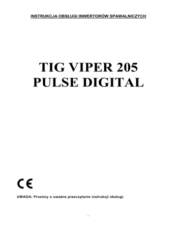 INSTRUKCJA OBSŁUGI INWERTORÓW SPAWALNICZYCH TIG VIPER 205 PULSE DIGITAL UWAGA: Prosimy o uważne przeczytanie instrukcji obsługi. -1- Zawartość 1. UWAGI OGÓLNE ............................................................................................................................... 3 2. OGÓLNA CHARAKTERYSTYKA .................................................................................................... 3 3. DANE TECHNICZNE ......................................................................................................................... 4 4. OPIS PANELU STEROWANIA I FUNKCJI TIG VIPER 205 PULSE DIGITAL ............................ 4 5. WYKRES PRZEBIEGU PROCESU SPAWANIA DLA METODY TIG - CZTEROTAKT 4T ........ 6 5.1 WYKRES PRZEBIEGU PROCESU SPAWANIA DLA METODY TIG – DWUTAKT 2T ........... 7 6. PRZYGOTOWANIE DO PRACY ....................................................................................................... 7 6.1 PODŁĄCZENIE DO SIECI ............................................................................................................... 8 6.2 ŁĄCZENIE PRZEWODÓW SPAWALNICZYCH W METODZIE MMA ...................................... 8 7. USTAWIANIE URZĄDZENIA - SPAWANIE METODĄ MMA...................................................... 8 8. SPAWANIE METODĄ TIG HF .......................................................................................................... 9 9. KONSERWACJA............................................................................................................................... 10 10. FUNKCJE DODATKOWE .............................................................................................................. 10 11. PRZYGOTOWANIE KRAWĘDZI PRZED SPAWANIEM ........................................................... 11 12. ZAKŁÓCENIA W PRACY SPAWARKI ........................................................................................ 13 13. BEZPIECZEŃSTWO UŻYTKOWANIA ........................................................................................ 14 -2- 1. UWAGI OGÓLNE Uruchomienia, instalacji i eksploatacji inwertorów spawalniczych, można dokonać tylko po dokładnym zapoznaniu się z niniejszą instrukcją obsługi. Nieprzestrzeganie zaleceń zawartych w tej instrukcji może narazić użytkownika na poważne obrażenia ciała, śmierć lub uszkodzenia samego urządzenia. Nie można dopuszczać dzieci w pobliże miejsca pracy urządzenia. Osoby z wszczepionym rozrusznikiem serca zanim podejmą pracę z tym urządzeniem, powinny skonsultować się ze swoim lekarzem. Obsługa serwisowa i naprawy tych urządzeń mogą być prowadzone przez wykwalifikowany personel, z zachowaniem warunków bezpieczeństwa pracy obowiązujących dla urządzeń elektrycznych. Przeróbki we własnym zakresie mogą spowodować zmianę cech użytkowych urządzeń lub pogorszenie parametrów spawalniczych. Wszelkie przeróbki urządzeń, we własnym zakresie, powodują nie tylko utratę gwarancji, ale mogą być przyczyną pogorszenia się warunków bezpieczeństwa użytkowania i narażenia użytkownika na niebezpieczeństwo porażenia prądem. Niewłaściwe warunki pracy mogą spowodować uszkodzenia urządzenia, a jego niewłaściwa obsługa, powoduje utratę gwarancji. UWAGA: Urządzenie oparte na podzespołach elektronicznych. Szlifowanie i cięcie metali itp. w pobliżu spawarki może powodować zanieczyszczenie opiłkami wnętrza urządzenia, doprowadzając tym samym do jego uszkodzenia. Wyżej wymienione uszkodzenie nie podlega naprawie gwarancyjnej! W przypadku konieczności pracy w takim środowisku, należy dokonywać czyszczenia urządzenia przez przedmuchanie wnętrza spawarki sprężonym powietrzem. INFORMACJE DOTYCZĄCE USUWANIA ZUŻYTEGO SPRZĘTU ELEKTRYCZNEGO I ELEKTRONICZNEGO Powyższy znak umieszczony na urządzeniu informuje, że jest to sprzęt elektryczny lub elektroniczny, którego po zużyciu nie wolno umieszczać z innymi odpadami. Zużyty sprzęt elektryczny i elektroniczny zawiera substancje szkodliwe dla środowiska naturalnego. Nie wolno takiego sprzętu składować na wysypiskach śmieci, musi zostać on poddany recyklingowi. Informacje na temat systemu zbiórki zużytego sprzętu elektrycznego i elektronicznego można uzyskać w punkcie sprzedaży urządzeń, oraz u producenta lub importera. Zakaz umieszczania wraz z innymi odpadami zużytego sprzętu elektrycznego i elektronicznego narzuca na użytkownika dyrektywa europejska 2007/96/WE. 2. OGÓLNA CHARAKTERYSTYKA Urządzenie inwerterowe TIG VIPER 205 PULSE DIGITAL oparte jest na najnowszej, najbardziej zaawansowanej technologii. Urządzenie wyposażone jest w „miękki” przejrzysty panel umożliwiający ustawienie wszystkich niezbędnych funkcji spawalniczych (prąd startu/wypełnienia krateru/spawania/bazy, czasy narastania i opadania prądu, wypływ gazu przed i po spawaniu, częstotliwość pulsu, balans, hot start, arc force, itd.). TIG VIPER 205 PULSE DIGITAL umożliwia spawanie metodą TIG DC, TIG PULS, MMA. -3- 3. DANE TECHNICZNE Model Parametry Zasilanie TIG VIPER 205 PULSE DIGITAL 230[V]/50[Hz] Napięcie biegu jałowego [V] 62 Zabezpieczenie [A] 25 Pobór mocy [kVA] 6,3 Zakres regulacji prądu spawania [A] Zakres regulacji czasu narastania i opadania prądu [s] Regulacja wypływu gazu przed spawaniem [s] Regulacja wypływu gazu po spawaniu [s] Sprawność (40 °C/10 minut.) TIG MMA 5÷200 10÷160 0÷10 — 0.1÷10 — 0÷25 — 200 [A]/35% 160 [A]/35% 390X130X280 Wymiary spawarki [mm] Waga [kg] 9 4. OPIS PANELU STEROWANIA I FUNKCJI TIG VIPER 205 PULSE DIGITAL -4- FUNKCJA Przycisk wyboru: TIG w dwutakcie (2T), TIG w czterotakcie (4T), spawanie metodą MMA z wykorzystaniem funkcji VRD lub bez niej. Gdy zielona dioda MMA świeci się funkcja VRD jest włączona, a gdy pulsuje jest wyłączona. PULS Przycisk wyboru: funkcja „puls” włączona - on. Wyłączona - off . HF LIFT Przycisk wyboru metody zajarzania łuku – bezdotykow