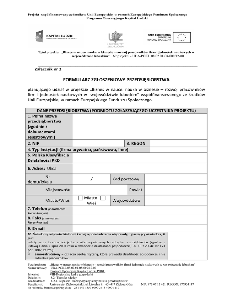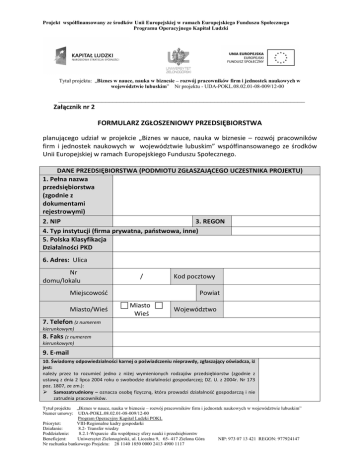 Projekt współfinansowany ze środków Unii Europejskiej w ramach Europejskiego Funduszu Społecznego Programu Operacyjnego Kapitał Ludzki Tytuł projektu: „Biznes w nauce, nauka w biznesie – rozwój pracowników firm i jednostek naukowych w województwie lubuskim” Nr projektu - UDA-POKL.08.02.01-08-009/12-00 ____________________________________________________________________ Załącznik nr 2 FORMULARZ ZGŁOSZENIOWY PRZEDSIĘBIORSTWA planującego udział w projekcie „Biznes w nauce, nauka w biznesie – rozwój pracowników firm i jednostek naukowych w województwie lubuskim” współfinansowanego ze środków Unii Europejskiej w ramach Europejskiego Funduszu Społecznego. DANE PRZEDSIĘBIORSTWA (PODMIOTU ZGŁASZAJĄCEGO UCZESTNIKA PROJEKTU) 1. Pełna nazwa przedsiębiorstwa (zgodnie z dokumentami rejestrowymi) 2. NIP 3. REGON 4. Typ instytucji (firma prywatna, państwowa, inne) 5. Polska Klasyfikacja Działalności PKD 6. Adres: Ulica Nr domu/lokalu / Miejscowość Miasto/Wieś Kod pocztowy Powiat Miasto Wieś Województwo 7. Telefon (z numerem kierunkowym) 8. Faks (z numerem kierunkowym) 9. E-mail 10. Świadomy odpowiedzialności karnej o poświadczeniu nieprawdy, zgłaszający oświadcza, iż jest: należy przez to rozumieć jedno z niżej wymienionych rodzajów przedsiębiorstw (zgodnie z ustawą z dnia 2 lipca 2004 roku o swobodzie działalności gospodarczej; DZ. U. z 2004r. Nr 173 poz. 1807, ze zm.): Samozatrudniony – oznacza osobę fizyczną, która prowadzi działalność gospodarczą i nie zatrudnia pracowników. Tytuł projektu „Biznes w nauce, nauka w biznesie – rozwój pracowników firm i jednostek naukowych w województwie lubuskim” Numer umowy: UDA-POKL.08.02.01-08-009/12-00 Program Operacyjny Kapitał Ludzki POKL Priorytet: VIII-Regionalne kadry gospodarki Działanie: 8.2- Transfer wiedzy Poddziałenie: 8.2.1-Wsparcie dla współpracy sfery nauki i przedsiębiorstw Beneficjent: Uniwersytet Zielonogórski, ul. Licealna 9, 65- 417 Zielona Góra NIP: 973 07 13 421 REGON: 977924147 Nr rachunku bankowego Projektu: 28 1140 1850 0000 2413 4900 1117 Projekt współfinansowany ze środków Unii Europejskiej w ramach Europejskiego Funduszu Społecznego Programu Operacyjnego Kapitał Ludzki Tytuł projektu: „Biznes w nauce, nauka w biznesie – rozwój pracowników firm i jednostek naukowych w województwie lubuskim” Nr projektu - UDA-POKL.08.02.01-08-009/12-00 Mikroprzedsiębiorstwo, przedsiębiorstwo, które, w co najmniej jednym z dwóch ostatnich lat obrotowych: − zatrudniało średniorocznie mniej niż 10 pracowników oraz osiągnęło roczny obrót netto ze sprzedaży towarów, wyrobów i usług oraz operacji finansowych nieprzekraczający równowartości w złotych 2 milionów euro, lub sumy aktywów jego bilansu sporządzonego na koniec jednego z tych lat nie przekroczyły równowartości w złotych 2 milionów euro. Małe przedsiębiorstwo, przedsiębiorstwo, które, w co najmniej jednym z dwóch ostatnich lat obrotowych: − zatrudniało średniorocznie mniej niż 50 pracowników oraz − osiągnęło roczny obrót netto ze sprzedaży towarów, wyrobów i usług oraz operacji finansowych nie przekraczający równowartości w złotych 10 mln euro, lub sumy aktywów jego bilansu sporządzonego na koniec jednego z tych lat nie przekroczyły równowartości w złotych 10 mln euro. Średnie przedsiębiorstwo, przedsiębiorstwo, które, w co najmniej jednym z dwóch ostatnich lat obrotowych: − zatrudniało średniorocznie mniej niż 250 pracowników oraz − osiągnęło roczny obrót netto ze sprzedaży towarów, wyrobów i usług oraz operacji finansowych nie przekraczający równowartości w złotych 50 mln euro, lub sumy aktywów jego bilansu sporządzonego na koniec jednego z tych lat nie przekroczyły równowartości w złotych 43 mln euro. Ponadto, za mikro, małe przedsiębiorstwo uważa się przedsiębiorstwo, które spełnia pozostałe kryteria, o których mowa w Załączniku I do Rozporządzenia Komisji (WE) nr 800/2008 z 6 sierpnia 2008 uznającym niektóre rodzaje pomocy za zgodne ze wspólnym rynkiem w zastosowaniu art. 87 i 88 Traktatu (ogólne rozporządzenie w sprawie wyłączeń blokowych). Według ustawy, status MŚP nie przysługuje firmom, w których inni przedsiębiorcy, skarb państwa oraz jednostki samorządu terytorialnego posiadają: − 25% i więcej wkładów, udziałów lub akcji, − prawa do 25% i więcej udziału w zysku, − 25% i więcej głosów w zgromadzeniu wspólników, walnym zgromadzeniu akcjonariuszy albo walnym zgromadzeniu spółdzielni. Przypominamy ponadto, że utrata bądź uzyskanie statusu MŚP może nastąpić, jeżeli spełnione są kryteria zatrudnienia oraz obrotu lub bilansu przez co najmniej dwa kolejne okresy obrachunkowe. W przypadku nowo powstałego przedsiębiorstwa, którego sprawozdania finansowe nie zostały jeszcze zatwierdzone, dane do badania należy wprowadzić z dokonanego w trakcie roku obrachunkowego oszacowania. Ponadto oświadczam, że nie jestem w trudnej sytuacji ekonomicznej tzn.: - w przypadku spółki z ograniczona odpowiedzialnością – jeżeli pond połowa jej zarejestrowanego kapitału została utracona, w tym ponad jedna czwarta w okresie poprzedzających 12 miesięcy, - w przypadku spółki, której przynajmniej niektórzy członkowie są w sposób nieograniczony odpowiedzialni za długi spółki - jeżeli ponad połowa jej kapitału według sprawozdania finansowego została utracona, w tym ponad jedna czwarta w okresie poprzedzających 12 miesięcy, - bez względu na rodzaj spółki, jeżeli zgodnie z prawodawstwem krajowym podlega zbiorowemu postępowaniu w sprawie niewypłacalności, - objęty postępowaniem upadłościowym (zgodnie z ustawą z dnia 28.02.2003 roku – Prawo upadłościowe i naprawcze) - UWAGA: MŚP, które działają krócej niż trzy lata nie uważa się za zagrożone odnośnie tego samozatrudniony mikroprzedsiębiorstwem małym przedsiębiorstwem 