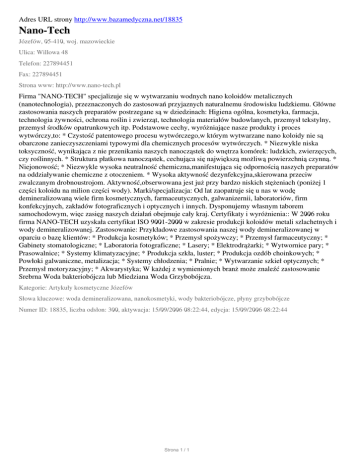 Adres URL strony http://www.bazamedyczna.net/18835 Nano-Tech Józefów, 05-410, woj. mazowieckie Ulica: Willowa 48 Telefon: 227894451 Fax: 227894451 Strona www: http://www.nano-tech.pl Firma "NANO-TECH" specjalizuje się w wytwarzaniu wodnych nano koloidów metalicznych (nanotechnologia), przeznaczonych do zastosowań przyjaznych naturalnemu środowisku ludzkiemu. Główne zastosowania naszych preparatów postrzegane są w dziedzinach: Higiena ogólna, kosmetyka, farmacja, technologia żywności, ochrona roślin i zwierząt, technologia materiałów budowlanych, przemysł tekstylny, przemysł środków opatrunkowych itp. Podstawowe cechy, wyróżniające nasze produkty i proces wytwórczy,to: * Czystość patentowego procesu wytwórczego,w którym wytwarzane nano koloidy nie są obarczone zanieczyszczeniami typowymi dla chemicznych procesów wytwórczych. * Niezwykle niska toksyczność, wynikająca z nie przenikania naszych nanocząstek do wnętrza komórek: ludzkich, zwierzęcych, czy roślinnych. * Struktura płatkowa nanocząstek, cechująca się największą możliwą powierzchnią czynną. * Niejonowość; * Niezwykle wysoka neutralność chemiczna,manifestująca się odpornością naszych preparatów na oddziaływanie chemiczne z otoczeniem. * Wysoka aktywność dezynfekcyjna,skierowana przeciw zwalczanym drobnoustrojom. Aktywność,obserwowana jest już przy bardzo niskich stężeniach (poniżej 1 części koloidu na milion części wody). Marki/specjalizacja: Od lat zaopatruje się u nas w wodę demineralizowaną wiele firm kosmetycznych, farmaceutycznych, galwanizernii, laboratoriów, firm konfekcyjnych, zakładów fotograficznych i optycznych i innych. Dysponujemy własnym taborem samochodowym, więc zasięg naszych działań obejmuje cały kraj. Certyfikaty i wyróżnienia:: W 2006 roku firma NANO-TECH uzyskała certyfikat ISO 9001-2000 w zakresie produkcji koloidów metali szlachetnych i wody demineralizowanej. Zastosowanie: Przykładowe zastosowania naszej wody demineralizowanej w oparciu o bazę klientów: * Produkcja kosmetyków; * Przemysł spożywczy; * Przemysł farmaceutyczny; * Gabinety stomatologiczne; * Laboratoria fotograficzne; * Lasery; * Elektrodrążarki; * Wytwornice pary; * Prasowalnice; * Systemy klimatyzacyjne; * Produkcja szkła, luster; * Produkcja ozdób choinkowych; * Powłoki galwaniczne, metalizacja; * Systemy chłodzenia; * Pralnie; * Wytwarzanie szkieł optycznych; * Przemysł motoryzacyjny; * Akwarystyka; W każdej z wymienionych branż może znaleźć zastosowanie Srebrna Woda bakteriobójcza lub Miedziana Woda Grzybobójcza. Kategorie: Artykuły kosmetyczne Józefów Słowa kluczowe: woda demineralizowana, nanokosmetyki, wody bakteriobójcze, płyny grzybobójcze Numer ID: 18835, liczba odsłon: 300, aktywacja: 15/09/2006 08:22:44, edycja: 15/09/2006 08:22:44 Strona 1 / 1