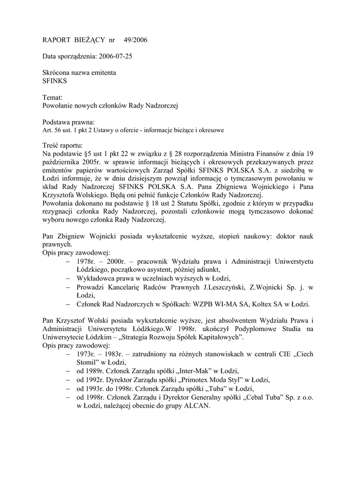 RAPORT BIEŻĄCY nr 49/2006 Data sporządzenia: 2006-07-25 Skrócona nazwa emitenta SFINKS Temat: Powołanie nowych członków Rady Nadzorczej Podstawa prawna: Art. 56 ust. 1 pkt 2 Ustawy o ofercie - informacje bieżące i okresowe Treść raportu: Na podstawie §5 ust 1 pkt 22 w związku z § 28 rozporządzenia Ministra Finansów z dnia 19 października 2005r. w sprawie informacji bieżących i okresowych przekazywanych przez emitentów papierów wartościowych Zarząd Spółki SFINKS POLSKA S.A. z siedzibą w Łodzi informuje, że w dniu dzisiejszym powziął informację o tymczasowym powołaniu w skład Rady Nadzorczej SFINKS POLSKA S.A. Pana Zbigniewa Wojnickiego i Pana Krzysztofa Wolskiego. Będą oni pełnić funkcje Członków Rady Nadzorczej. Powołania dokonano na podstawie § 18 ust 2 Statutu Spółki, zgodnie z którym w przypadku rezygnacji członka Rady Nadzorczej, pozostali członkowie mogą tymczasowo dokonać wyboru nowego członka Rady Nadzorczej. Pan Zbigniew Wojnicki posiada wykształcenie wyższe, stopień naukowy: doktor nauk prawnych. Opis pracy zawodowej: − 1978r. – 2000r. – pracownik Wydziału prawa i Administracji Uniwerstyetu Łódzkiego, początkowo asystent, później adiunkt, − Wykładowca prawa w uczelniach wyższych w Łodzi, − Prowadzi Kancelarię Radców Prawnych J.Leszczyński, Z.Wojnicki Sp. j. w Łodzi, − Członek Rad Nadzorczych w Spółkach: WZPB WI-MA SA, Koltex SA w Łodzi. Pan Krzysztof Wolski posiada wykształcenie wyższe, jest absolwentem Wydziału Prawa i Administracji Uniwersytetu Łódźkiego.W 1998r. ukończył Podyplomowe Studia na Uniwersytecie Łódzkim – „Strategia Rozwoju Spółek Kapitałowych”. Opis pracy zawodowej: − 1973r. – 1983r. – zatrudniony na różnych stanowiskach w centrali CIE „Ciech Stomil” w Łodzi, − od 1989r. Członek Zarządu spółki „Inter-Mak” w Łodzi, − od 1992r. Dyrektor Zarządu spółki „Primotex Moda Styl” w Łodzi, − od 1993r. do 1998r. Członek Zarządu spółki „Tuba” w Łodzi, − od 1998r. Członek Zarządu i Dyrektor Generalny spółki „Cebal Tuba” Sp. z o.o. w Łodzi, należącej obecnie do grupy ALCAN.