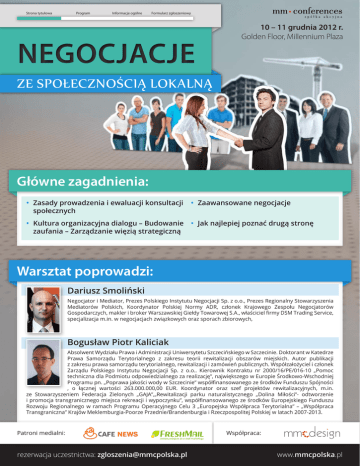 Strona tytułowa Program Informacje ogólne Formularz zgłoszeniowy NEGOCJACJE 10 – 11 grudnia 2012 r. Golden Floor, Millennium Plaza ZE SPOŁECZNOŚCIĄ LOKALNĄ Główne zagadnienia: • Zasady prowadzenia i ewaluacji konsultacji społecznych • Zaawansowane negocjacje • Kultura organizacyjna dialogu – Budowanie • Jak najlepiej poznać drugą stronę zaufania – Zarządzanie więzią strategiczną Warsztat poprowadzi: Dariusz Smoliński Negocjator i Mediator, Prezes Polskiego Instytutu Negocjacji Sp. z o.o., Prezes Regionalny Stowarzyszenia Mediatorów Polskich, Koordynator Polskiej Normy ADR, członek Krajowego Zespołu Negocjatorów Gospodarczych, makler i broker Warszawskiej Giełdy Towarowej S.A., właściciel firmy DSM Trading Service, specjalizacja m.in. w negocjacjach związkowych oraz sporach zbiorowych, Bogusław Piotr Kaliciak Absolwent Wydziału Prawa i Administracji Uniwersytetu Szczecińskiego w Szczecinie. Doktorant w Katedrze Prawa Samorządu Terytorialnego z zakresu teorii rewitalizacji obszarów miejskich. Autor publikacji z zakresu prawa samorządu terytorialnego, rewitalizacji i zamówień publicznych. Współzałożyciel i członek Zarządu Polskiego Instytutu Negocjacji Sp. z o.o.. Kierownik Kontraktu nr 2000/16/PE/016-10 „Pomoc techniczna dla Podmiotu odpowiedzialnego za realizację”, największego w Europie Środkowo-Wschodniej Programu pn. „Poprawa jakości wody w Szczecinie” współfinansowanego ze środków Funduszu Spójności , o łącznej wartości 263.000.000,00 EUR. Koordynator oraz szef projektów rewitalizacyjnych, m.in. ze Stowarzyszeniem Federacja Zielonych „GAJA”,„Rewitalizacji parku naturalistycznego „Dolina Miłości”- odtworzenie i promocja transgranicznego miejsca rekreacji i wypoczynku”, współfinansowanego ze środków Europejskiego Funduszu Rozwoju Regionalnego w ramach Programu Operacyjnego Celu 3 „Europejska Współpraca Terytorialna” – „Współpraca Transgraniczna” Krajów Meklemburgia-Poorze Przednie/Brandenburgia i Rzeczpospolitej Polskiej w latach 2007-2013. Patroni medialni: rezerwacja uczestnictwa: [email protected] Współpraca: www.mmcpolska.pl Strona tytułowa Program Informacje ogólne Formularz zgłoszeniowy 10 – 11 grudnia 2012 r. Golden Floor, Millennium Plaza NEGOCJACJE ZE SPOŁECZNOŚCIĄ LOKALNĄ Dzień I Dzień II 08.30 Rejestracja, poranna kawa 08.30 Rejestracja, poranna kawa 09.00 Znaczenie konsultacji społecznych Kompleksowy opis pojęcia i funkcji konsultacji społecznych: 09.00 Po co nam te negocjacje – założenia systemu: • Czemu służą negocjacje, • My w negocjacjach, • Otoczenie inwestycji infrastrukturalnych, • Obowiązki dotyczące prowadzenia konsultacji społecznych, 10.00 • Misja, cel, założenia, 10.00 Przygotowania do negocjacji: • Bariery napotykane przez inwestorów w procesie konsultacji społecznych, • Analiza środowiska negocjacyjnego, Zasady prowadzenia i ewaluacji konsultacji społecznych: • Psychologia w negocjacjach, • Zaangażowania interesariuszy w inwestycji infrastrukturalnej, • WATNA, BATNA, SWOT trochę inaczej, 11.00 Przerwa na kawę 11.20 Zaawansowane negocjacje: • Rozpoznanie interesariuszy i opinii, • Budowanie przewagi, • Strategiczny dialog, • Komunikacja w negocjacjach - rola pytań w negocjacjach, • Monitorowanie i raportowanie efektów dialogu z interesariuszami, 11.00 Przerwa na kawę 11.20 „My i Oni”. Poznać drugą stronę: • Skuteczne taktyki i techniki negocjacyjne, • Impas negocjacyjny, 12.20 • Trzecia strona w procesie, • Metody poznawania opinii interesariuszy • Korzyści z mediacji, • Zrozumieć drugą stronę: Żądania i Stanowiska a interesy i potrzeby, • Efekty i następstwa działań prowadzonych w ramach konsultacji społecznych 13.00 Przerwa na lunch 14.00 Kultura organizacyjna dialogu – Budowanie zaufania – Zarządzanie więzią strategiczną: • Działania informacyjno-edukacyjne • Czym jest kultura dialogu? Mediacje – szansa czy zagrożenie: • Do czego dążyć, czego unikać? 13.20 Przerwa na lunch 14.20 Podsumowanie: • Podsumowanie warsztatów, • Wspólna analiza wybranych tematów, • Dyskusja, 15.30 Zakończenie drugiego dnia warsztatów • Metodologia kreowania dialogu - zasady i procedury, 15.30 Zakończenie pierwszego dnia warsztatów rezerwacja uczestnictwa: [email protected] rezerwacja uczestnictwa: [email protected] www.mmcpolska.pl www.mmcpolska.pl Strona tytułowa Program Informacje ogólne Formularz zgłoszeniowy 10 – 11 grudnia 2012 r. Golden Floor, Millennium Plaza NEGOCJACJE ZE SPOŁECZNOŚCIĄ LOKALNĄ Korzyści z uczestnictwa • głębsze poznanie Partnerów Społecznych ich potrzeb, stanowisk, interesów oraz dróg do • zbudowania porozumienia • uporządkowanie wiedzy z zakresu negocjacji ze społecznościami lokalnymi, dzięki praktycznej analizie obszaru prawnego • przejęcie inicjatywy w negocjacjach i stworzenie środowiska korzystnego dla uzyskania • porozumienia, dzięki zdobyciu zaawansowanych umiejętności w zakresie komunikacji i negocjacji Warsztaty kierujemy Warsztaty dedykowane są przede wszystkim osobom odpowiedzialnym za negocjacje ze społecznościami lokalnymi i konsultacje społeczne w kontekście projektów inwestycyjnych czynionych przez firmę. Dlaczego warto wziąc udział Celem warsztatu jest wzmocnienie umiejętności negocjowania ze społecznościami lokalnymi w kontekście projektów inwestycyjnych, które nie spotykaja się z przychylnością okolicznych mieszkańców. W trakcie spotkania dowiecie się Państwo jak praktycznie dostosować negocjacje do danej niepowtarzalnej, spornej sytuacji. Organizator MM • Conferences to wiodący i niezależny organizator spotkań biznesowych w Polsce. Spółka jest organizatorem konferencji, kongresów, sympozjów oraz warsztatów na najwyższym poziomie merytorycznym. Gwarantem jakości organizowanych wydarzeń jest zarówno współpraca z czołowymi firmam