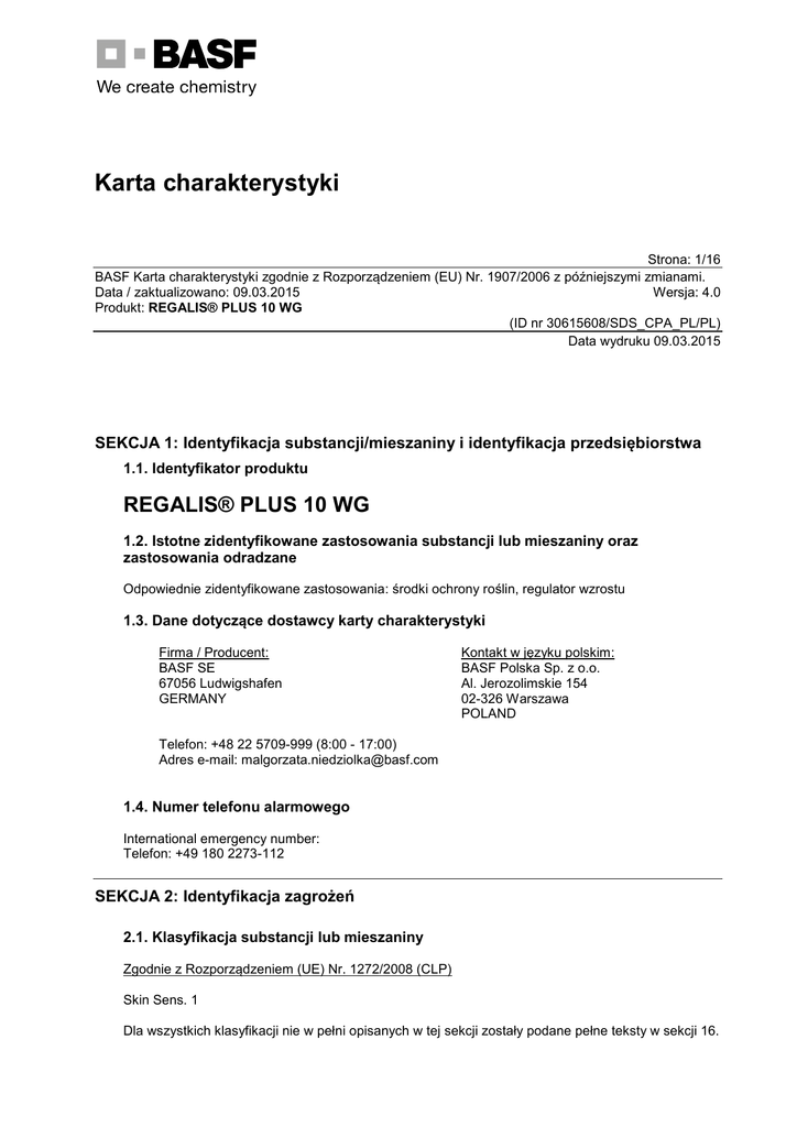 Karta charakterystyki Strona: 1/16 BASF Karta charakterystyki zgodnie z Rozporządzeniem (EU) Nr. 1907/2006 z późniejszymi zmianami. Data / zaktualizowano: 09.03.2015 Wersja: 4.0 Produkt: REGALIS® PLUS 10 WG (ID nr 30615608/SDS_CPA_PL/PL) Data wydruku 09.03.2015 SEKCJA 1: Identyfikacja substancji/mieszaniny i identyfikacja przedsiębiorstwa 1.1. Identyfikator produktu REGALIS® PLUS 10 WG 1.2. Istotne zidentyfikowane zastosowania substancji lub mieszaniny oraz zastosowania odradzane Odpowiednie zidentyfikowane zastosowania: środki ochrony roślin, regulator wzrostu 1.3. Dane dotyczące dostawcy karty charakterystyki Firma / Producent: BASF SE 67056 Ludwigshafen GERMANY Kontakt w języku polskim: BASF Polska Sp. z o.o. Al. Jerozolimskie 154 02-326 Warszawa POLAND Telefon: +48 22 5709-999 (8:00 - 17:00) Adres e-mail: [email protected] 1.4. Numer telefonu alarmowego International emergency number: Telefon: +49 180 2273-112 SEKCJA 2: Identyfikacja zagrożeń 2.1. Klasyfikacja substancji lub mieszaniny Zgodnie z Rozporządzeniem (UE) Nr. 1272/2008 (CLP) Skin Sens. 1 Dla wszystkich klasyfikacji nie w pełni opisanych w tej sekcji zostały podane pełne teksty w sekcji 16. Strona: 2/16 BASF Karta charakterystyki zgodnie z Rozporządzeniem (EU) Nr. 1907/2006 z późniejszymi zmianami. Data / zaktualizowano: 09.03.2015 Wersja: 4.0 Produkt: REGALIS® PLUS 10 WG (ID nr 30615608/SDS_CPA_PL/PL) Data wydruku 09.03.2015 2.2. Elementy oznakowania Zgodnie z Rozporządzeniem (UE) Nr. 1272/2008 (CLP) Piktogram: Hasło ostrzegawcze.: Uwaga Zwrot informujący o zagrożeniu: H317 Może powodować reakcję alergiczną skóry. EUH401 W celu uniknięcia zagrożeń dla zdrowia ludzi i środowiska, należy postępować zgodnie z instrukcją użycia. Hasło ostrzegawcze: P101 W razie konieczności zasięgnięcia porady lekarza, należy pokazać pojemnik lub etykietę. Zwroty wskazujące środki ostrożności (zapobieganie): P261 Unikać wdychania pyłu. P272 Zanieczyszczonej odzieży ochronnej nie wynosić poza miejsce pracy. P280 Stosować rękawice ochronne/ odzież ochronną. Zwroty wskazujące środki ostrożności (reagowanie): P302 + P352 W PRZYPADKU KONTAKTU ZE SKÓRĄ: umyć dużą ilością wody z mydłem. P333 + P313 W przypadku wystąpienia podrażnienia skóry lub wysypki: Zasięgnąć porady/zgłosić się pod opiekę lekarza. P363 Wyprać zanieczyszczoną odzież przed ponownym użyciem. P391 Zebrać wyciek / rozsypany produkt Zwroty wskazujące środki ostrożności (usuwanie): P501 Zawartość/pojemnik usuwać do punktów zbiórki odpadów niebezpiecznych lub specjalnych. 2.3. Inne zagrożenia Zgodnie z Rozporządzeniem (UE) Nr. 1272/2008 (CLP) Proszę patrzeć w sekcji 12 - Wyniki oceny PBT i vPvB Jeśli w tej sekcji zostaną wymienione dodatkowe dane odnośnie pozostałych zagrożeń, które nie wpłyną na klasyfikację, muszą być dodane do ogólnych zagrożeń substancji lub mieszaniny. Strona: 3/16 BASF Karta charakterystyki zgodnie z Rozporządzeniem (EU) Nr. 1907/2006 z późniejszymi zmianami. Data / zaktualizowano: 09.03.2015 Wersja: 4.0 Produkt: REGALIS® PLUS 10 WG (ID nr 30615608/SDS_CPA_PL/PL) Data wydruku 09.03.2015 SEKCJA 3: Skład/informacja o składnikach 3.1. Substancje Nie znajduje zastosowania 3.2. Mieszaniny Charakterystyka chemiczna środki ochrony roślin, regulator wzrostu, granulat rozpraszalny w wodzie zawiera: proheksadion wapnia = 100 g/kg Składniki niebezpieczne (GHS) zgodnie z Rozporządzeniem (UE) nr. 1272/2008 wodorosiarczan(VI) sodu; kwaśny siarczan sodu Zawartość (W/W): < 25 % Eye Dam./Irrit. 1 Numer CAS: 7681-38-1 H318 Numer WE: 231-665-7 Numer INDEX: 016-046-00-X siarczan amonu Zawartość (W/W): <= 50 % Numer CAS: 7783-20-2 Numer WE: 231-984-1 Numer rejestracji REACH: 012119455044-46 żel krzemionkowy, bezpostaciowy, strącany Zawartość (W/W): < 10 % Numer CAS: 112926-00-8 Numer rejestracji REACH: 012119379499-16 sól sodowa kwasu lignosulfonowego Zawartość (W/W): < 10 % Numer CAS: 8061-51-6 Składniki niebezpieczne zgodnie z dyrektywą 1999/45/WE wodorosiarczan(VI) sodu; kwaśny siarczan sodu Strona: 4/16 BASF Karta charakterystyki zgodnie z Rozporządzeniem (EU) Nr. 1907/2006 z późniejszymi zmianami. Data / zaktualizowano: 09.03.2015 Wersja: 4.0 Produkt: REGALIS® PLUS 10 WG (ID nr 30615608/SDS_CPA_PL/PL) Data wydruku 09.03.2015 Zawartość (W/W): < 25 % Numer CAS: 7681-38-1 Numer WE: 231-665-7 Numer INDEX: 016-046-00-X Symbol(e) zagrożenia: Xi Zwroty R: 41 siarczan amonu Zawartość (W/W): <= 50 % Numer CAS: 7783-20-2 Numer WE: 231-984-1 Numer rejestracji REACH: 01-2119455044-46 żel krzemionkowy, bezpostaciowy, strącany Zawartość (W/W): < 10 % Numer CAS: 112926-00-8 Numer rejestracji REACH: 01-2119379499-16 sól sodowa kwasu lignosulfonowego Zawartość (W/W): < 10 % Numer CAS: 8061-51-6 Dla klasyfikacji nie w pełni opisanych w tej sekcji, włączając znaczenie symbolu niebezpieczeństwa, teksty fraz R oraz uwagi o niebezpieczeństwie zostały podane pełne teksty w sekcji 16. SEKCJA 4: Środki pierwszej pomocy 4.1. Opis środków pierwszej pomocy Zdjąć zanieczyszczoną odzież. Wdychanie: Spokój, świeże powietrze, pomoc lekarska. Kontakt ze skórą: Zmyć dokładnie wodą z mydłem. Kontakt z oczami: Płukać przez 15 min pod bieżącą wodą przy szeroko otwartych oczach. Połknięcie: Natychmiast wypłukać jamę ustną i wypić 200-300 ml wody, konsultacja lekarska. 4.2. Najważniejsze ostre i opóźnione objawy oraz skutki narażenia Symptomy: najważniejsze znane symptomy i działania zostały opisane w sekcji 2 (Oznakowanie produktu) i/lub w sekcji 11., Dalsze ważne symptomy i działania nie są dotąd znane. Strona: 5/16 BASF Karta charakterystyki zgodnie z Rozporządzeniem (EU) Nr. 1907/2006 z późniejszymi zmianami. Data / zaktualizowano: 09.03.2015 Wersja: 4.0 Produkt: REGALIS® PLUS 10 WG (ID nr 30615608/SDS_CPA_PL/PL) Data wydruku 09.03.2015 4.3. Wskazania dotyczące wszelkiej natychmiastowej pomocy lekarskiej i szcze