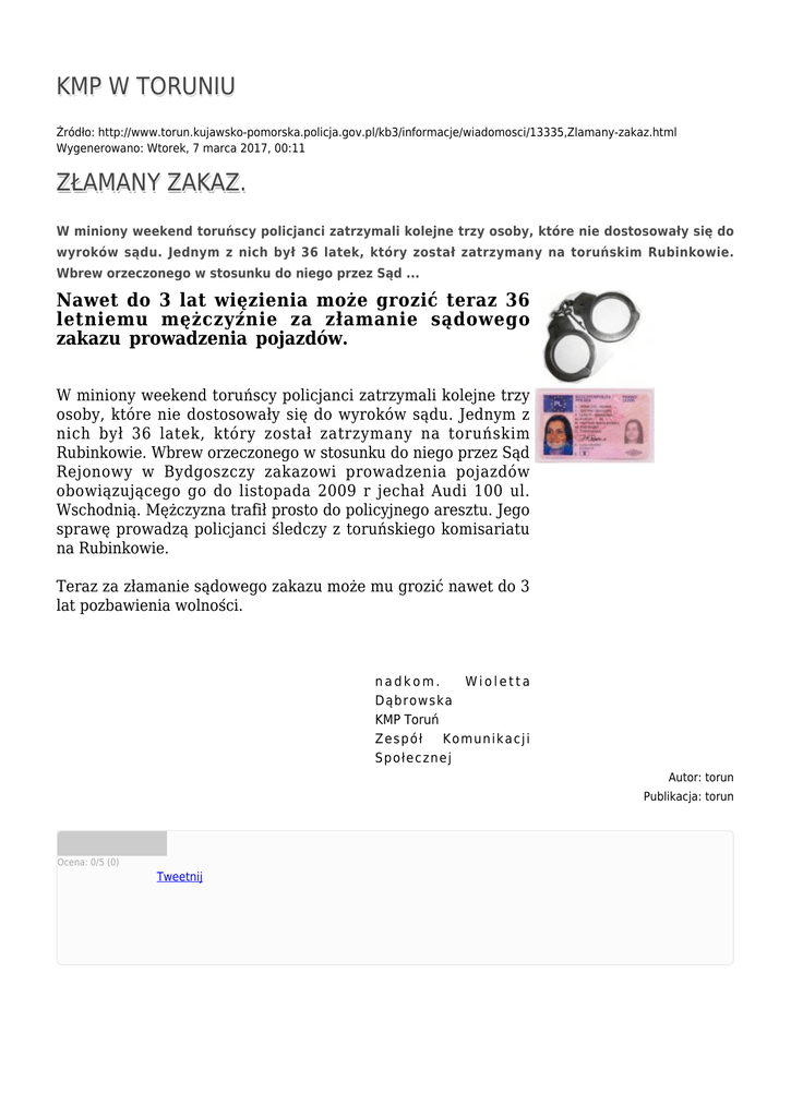 KMP W TORUNIU Źródło: http://www.torun.kujawsko-pomorska.policja.gov.pl/kb3/informacje/wiadomosci/13335,Zlamany-zakaz.html Wygenerowano: Wtorek, 7 marca 2017, 00:11 ZŁAMANY ZAKAZ. W miniony weekend toruńscy policjanci zatrzymali kolejne trzy osoby, które nie dostosowały się do wyroków sądu. Jednym z nich był 36 latek, który został zatrzymany na toruńskim Rubinkowie. Wbrew orzeczonego w stosunku do niego przez Sąd ... Nawet do 3 lat więzienia może grozić teraz 36 letniemu mężczyźnie za złamanie sądowego zakazu prowadzenia pojazdów. W miniony weekend toruńscy policjanci zatrzymali kolejne trzy osoby, które nie dostosowały się do wyroków sądu. Jednym z nich był 36 latek, który został zatrzymany na toruńskim Rubinkowie. Wbrew orzeczonego w stosunku do niego przez Sąd Rejonowy w Bydgoszczy zakazowi prowadzenia pojazdów obowiązującego go do listopada 2009 r jechał Audi 100 ul. Wschodnią. Mężczyzna trafił prosto do policyjnego aresztu. Jego sprawę prowadzą policjanci śledczy z toruńskiego komisariatu na Rubinkowie. Teraz za złamanie sądowego zakazu może mu grozić nawet do 3 lat pozbawienia wolności. nadkom. Wioletta Dąbrowska KMP Toruń Zespół Komunikacji Społecznej Autor: torun Publikacja: torun Ocena: 0/5 (0) Tweetnij
