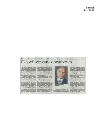 PARKIET 2016-06-23 Domy maklerskie > Komisja Nadzoru Finansowego nie powiedziała jeszcze ostatniego słowa. Ucywilizowane doradztwo Komisja Nadzoru Finan sowego może święcić triumf. Ostrzeżenia i kary przyniosły skutek - domy maklerskie po ważnie podeszły do problemu doradztwa inwestycyjnego i jak przyznają przedstawiciele KNF, widać już tego efekty. Nadzór od dłuższego czasu naciskał, by maklerzy, którzy chcą udzielać klientom rad, w co inwestować, związani byli z nimi umowami o doradztwo inwestycyjne, a nie tylko zwykłą umową o świadczenie usług maklerskich. Na samych ostrzeżeniach słownych się nie skończyło. W październi ku 2014 r. CDM Pekao dostał 150 tys. kary za świadczenie usług doradztwa inwestycyj nego na rzecz klientów bez uprzedniego zawarcia z klien tami umów o doradztwo. Z kolei we wtorek 300 tys. kary nadzór nałożył na Noble Se curities za świadczenie usług doradztwa bez wymagalnego zezwolenia w okresie od stycz nia do lipca 2013 r. Niewykluczone, że na tych dwóch instytucjach się nie skończy. - W toku jest jeszcze jedno postępowanie - zdradza Łu kasz Dajnowicz, rzecznik Ko misji. Nie zdradza jednak,o jaki podmiot chodzi.Jednocześnie Andrzej Jakubiak, szef KNF przyznaje jednak, że rynek po szedł do przodu. - Jeśli chodzi o doradztwo inwestycyjne, Obecnie już większość do można powiedzieć, że rynek pod tymwzględem się ucywili mów maklerskich ma w swojej zował - dodaje Dajnowicz. ofercie usługę doradztwa inwe- stycyjnego. Maklerzy nie ukrywają, że jest to w dużej mierze odpowiedź na nieprzejednaną postawę nadzoru. W ostatnim czasie usługę doradztwa dla szerokiego grona klientów wprowadził m.in. mBank Dom Maklerski. Do tego szykuje się także DM PKO BP. - Chcemy zaoferować do radztwo szerokiemu gronu potencjalnych odbiorców, przy założeniu oczywiście, że jest to adekwatna usługa do profili klientów. Nie ukrywamy jednak, że ma być to produkt masowy. Liczę, że uda nam się uruchomić doradztwo inwe stycyjne jeszcze w tym roku - mówił w kwietniu na łamach „Parkietu" Filip Paszke, dyrek tor DM PKO BP. ©© PRT