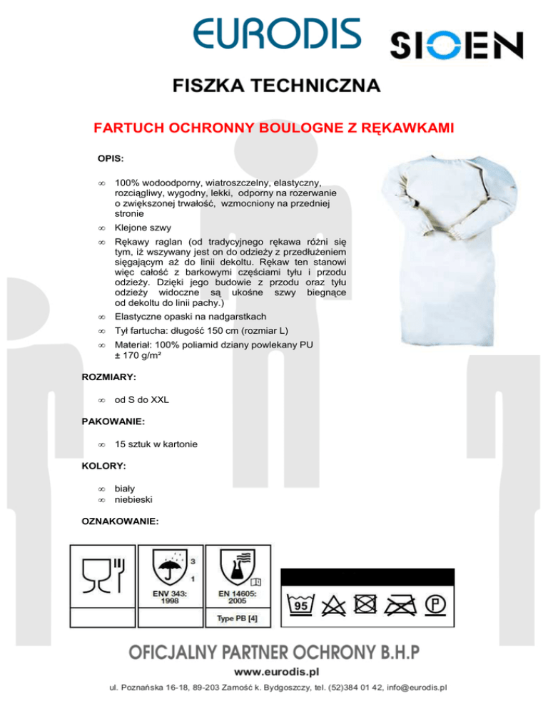 FARTUCH OCHRONNY BOULOGNE Z RĘKAWKAMI OPIS: • 100% wodoodporny, wiatroszczelny, elastyczny, rozciągliwy, wygodny, lekki, odporny na rozerwanie o zwiększonej trwałość, wzmocniony na przedniej stronie • Klejone szwy • Rękawy raglan (od tradycyjnego rękawa różni się tym, iż wszywany jest on do odzieży z przedłużeniem sięgającym aż do linii dekoltu. Rękaw ten stanowi więc całość z barkowymi częściami tyłu i przodu odzieży. Dzięki jego budowie z przodu oraz tyłu odzieży widoczne są ukośne szwy biegnące od dekoltu do linii pachy.) • Elastyczne opaski na nadgarstkach • Tył fartucha: długość 150 cm (rozmiar L) • Materiał: 100% poliamid dziany powlekany PU ± 170 g/m² ROZMIARY: • od S do XXL PAKOWANIE: • 15 sztuk w kartonie KOLORY: • • biały niebieski OZNAKOWANIE: